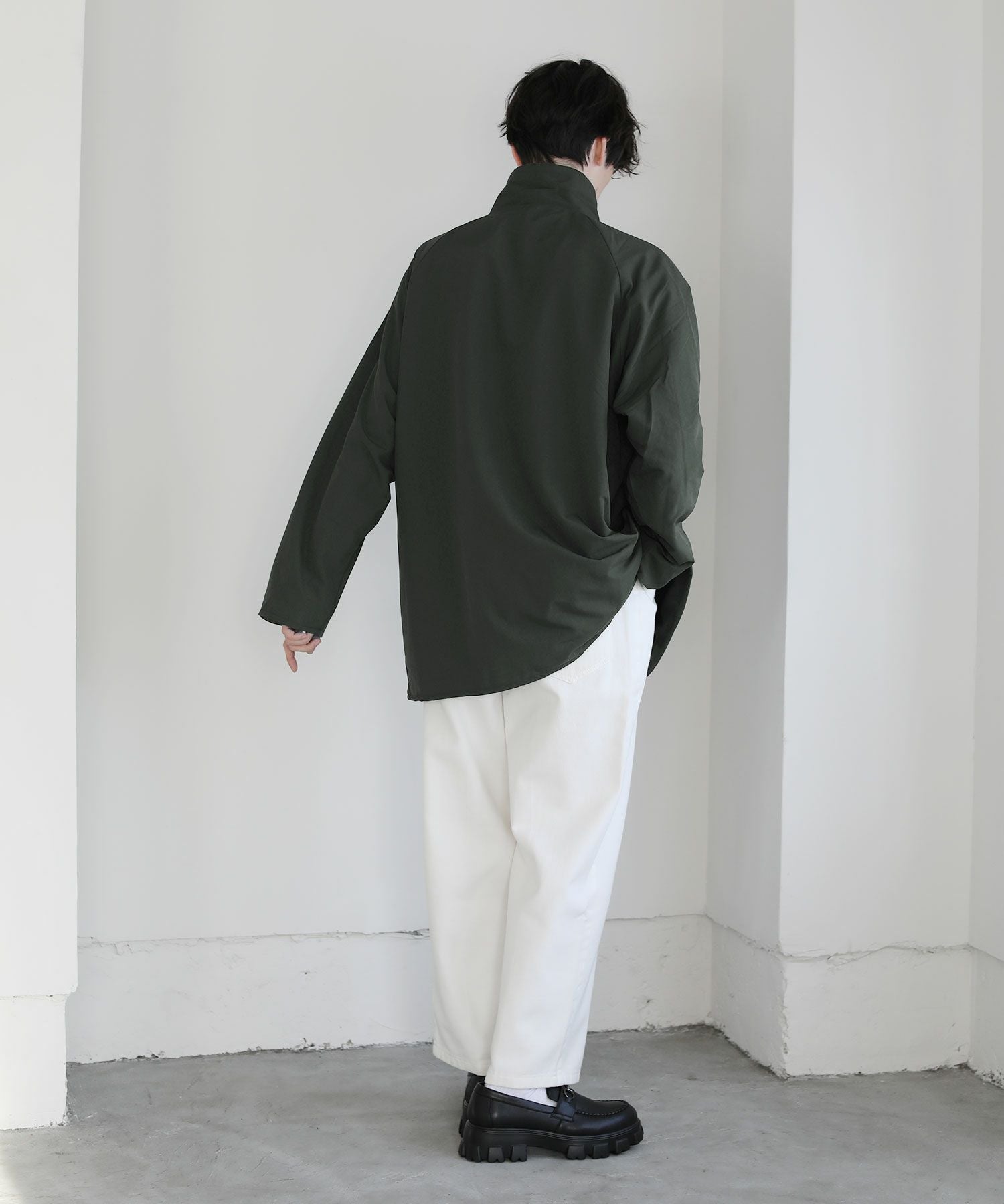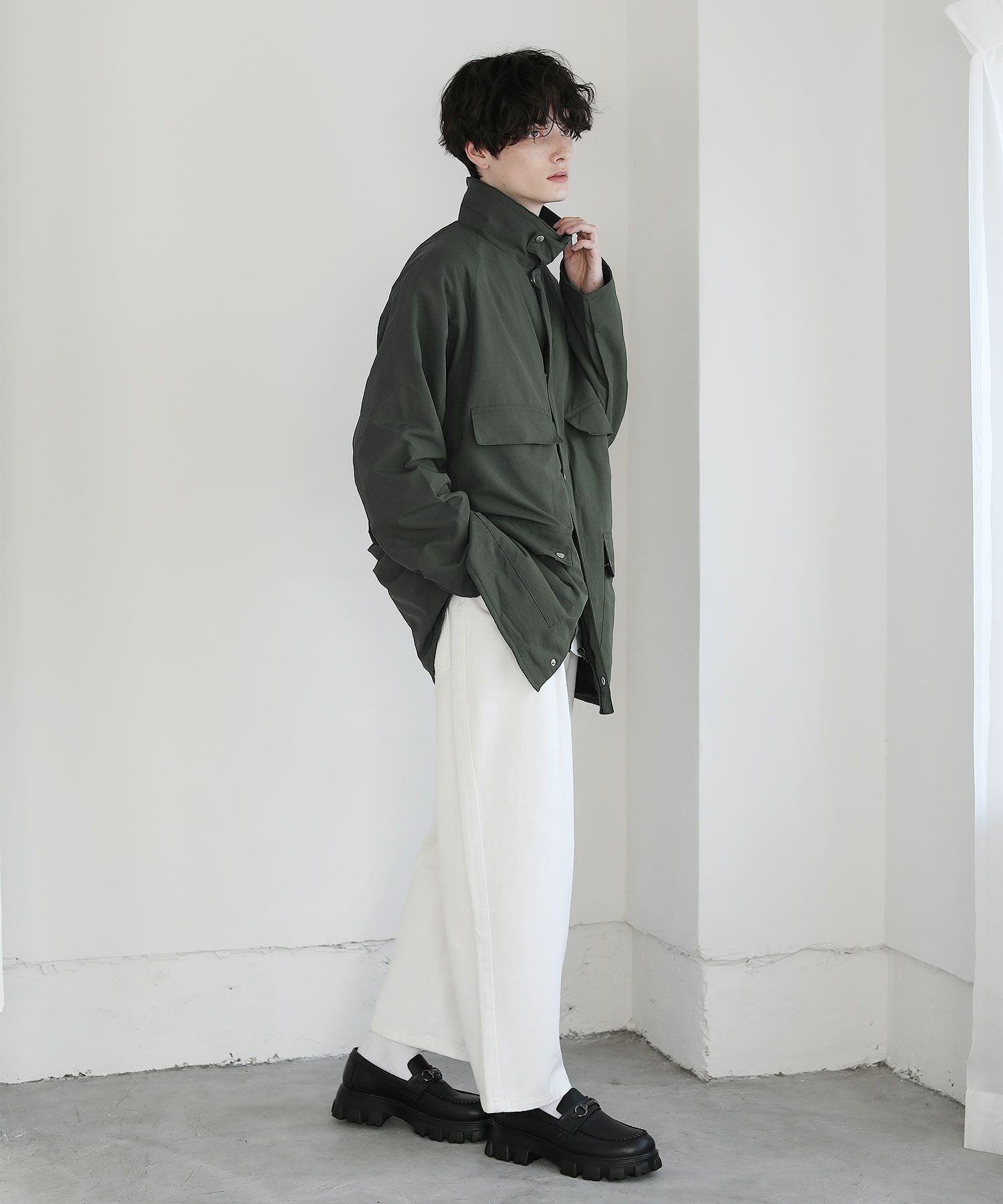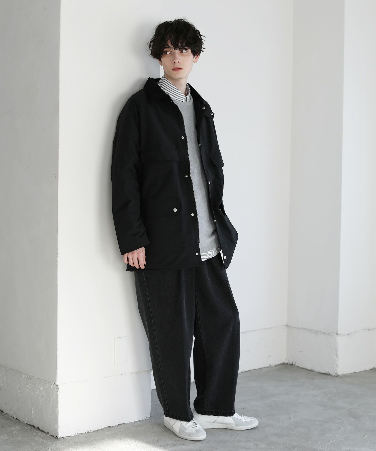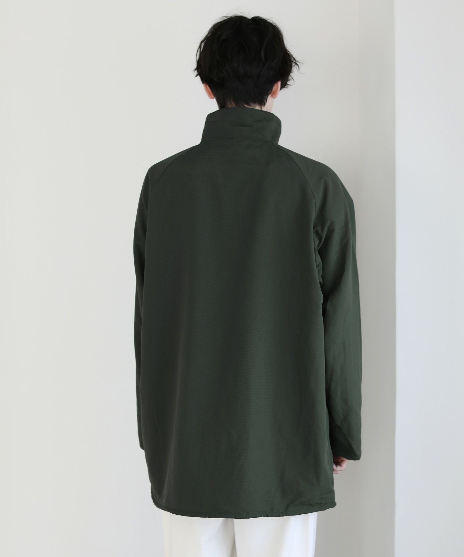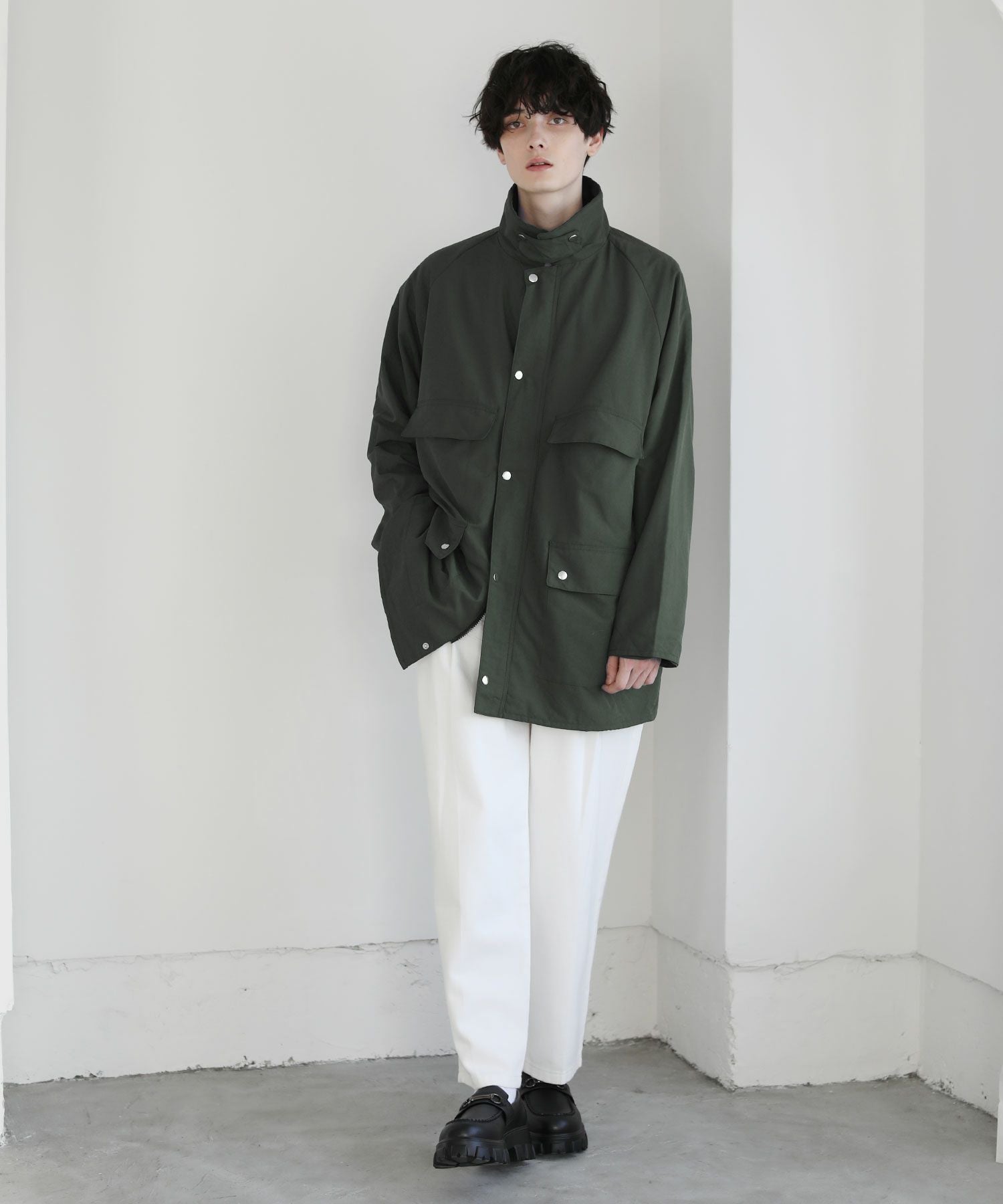 襟を立ててベルトを止めるとハイネックのデザインになり、雰囲気の違った着こなしを楽しめます。襟はコーデュロイの切り替えデザインになっており、カジュアルな印象とアクセントをプラス。フロントにはハンティングジャケット特有の大きなフラップポケットを4つ配置。小物の収納に便利な実用性にも優れたアウターです。またゆとりのある身幅とラグランスリーブで、インナーに厚手のニットやスウェットも着込めるのがポイント。