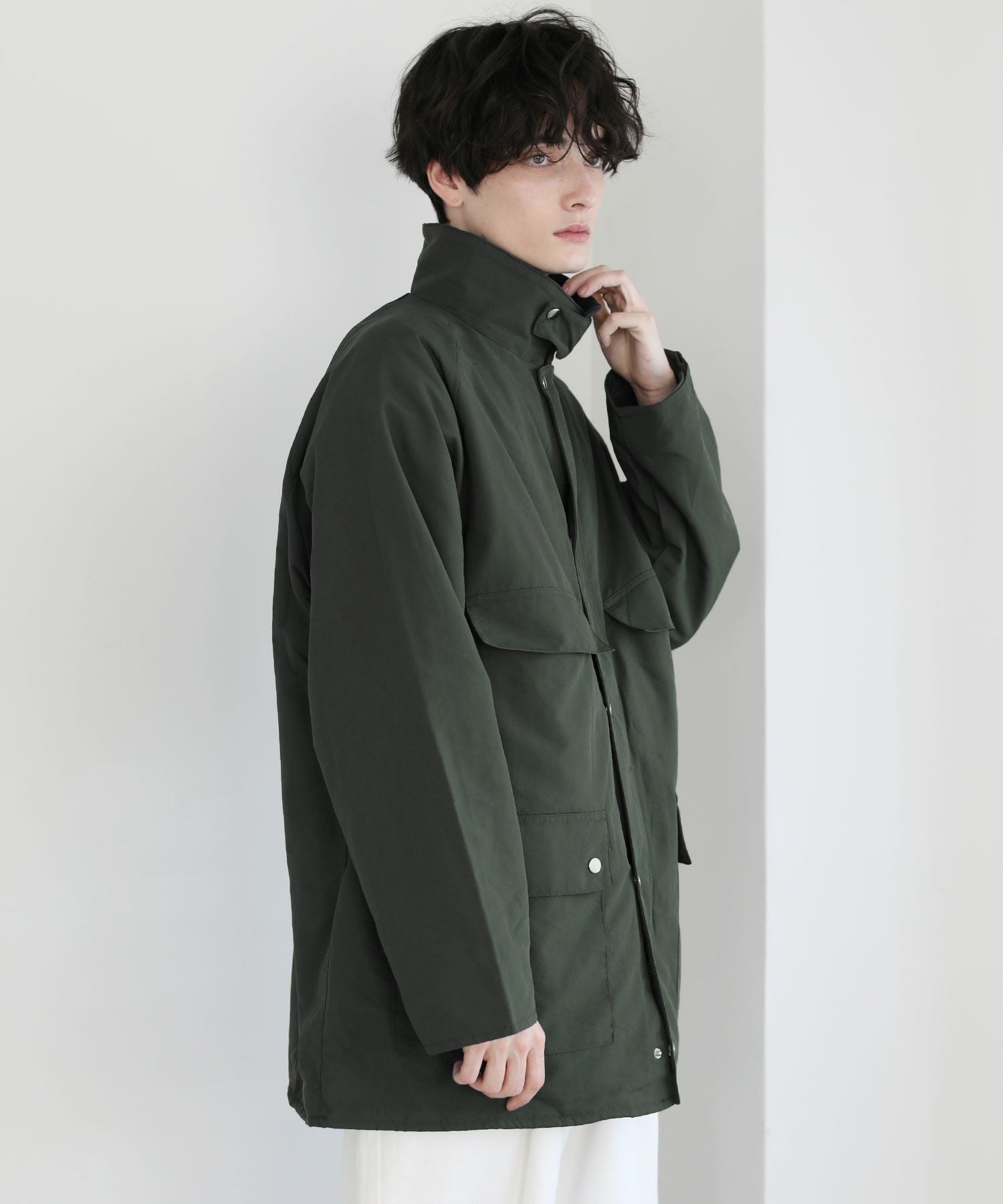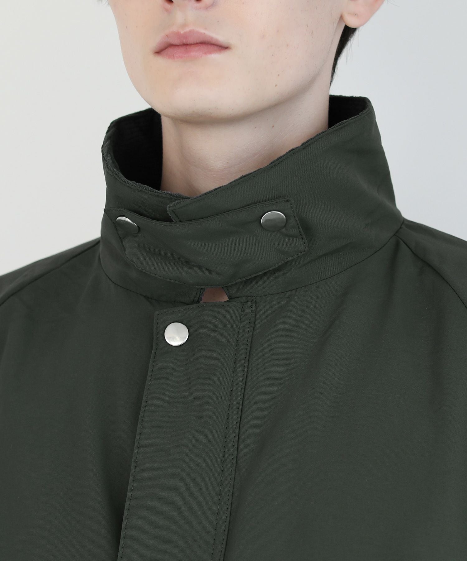 ヴィンテージのハンティングジャケットをベースに作られたオーバーサイズのミドル丈ジャケット。マットな質感の生地が落ち着いた印象のジャケットです。