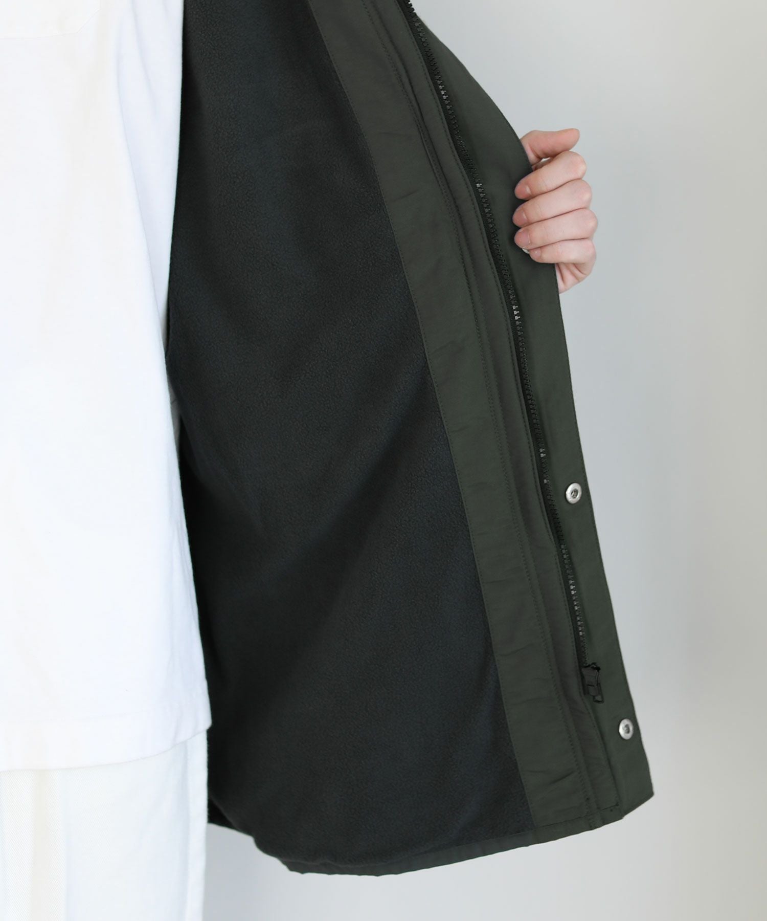 表地は高密度&落ち着いた印象のマットなナイロン生地、裏地はボア仕様になっています。軽量ながら暖かな着心地が特徴です。