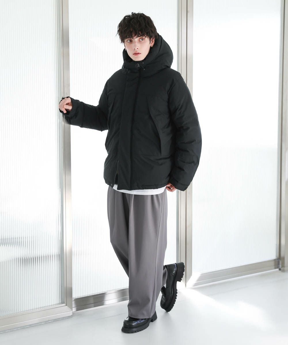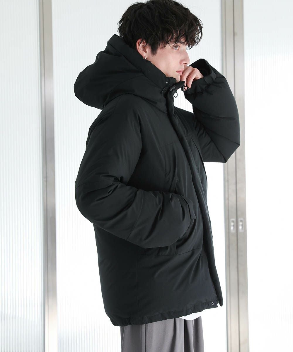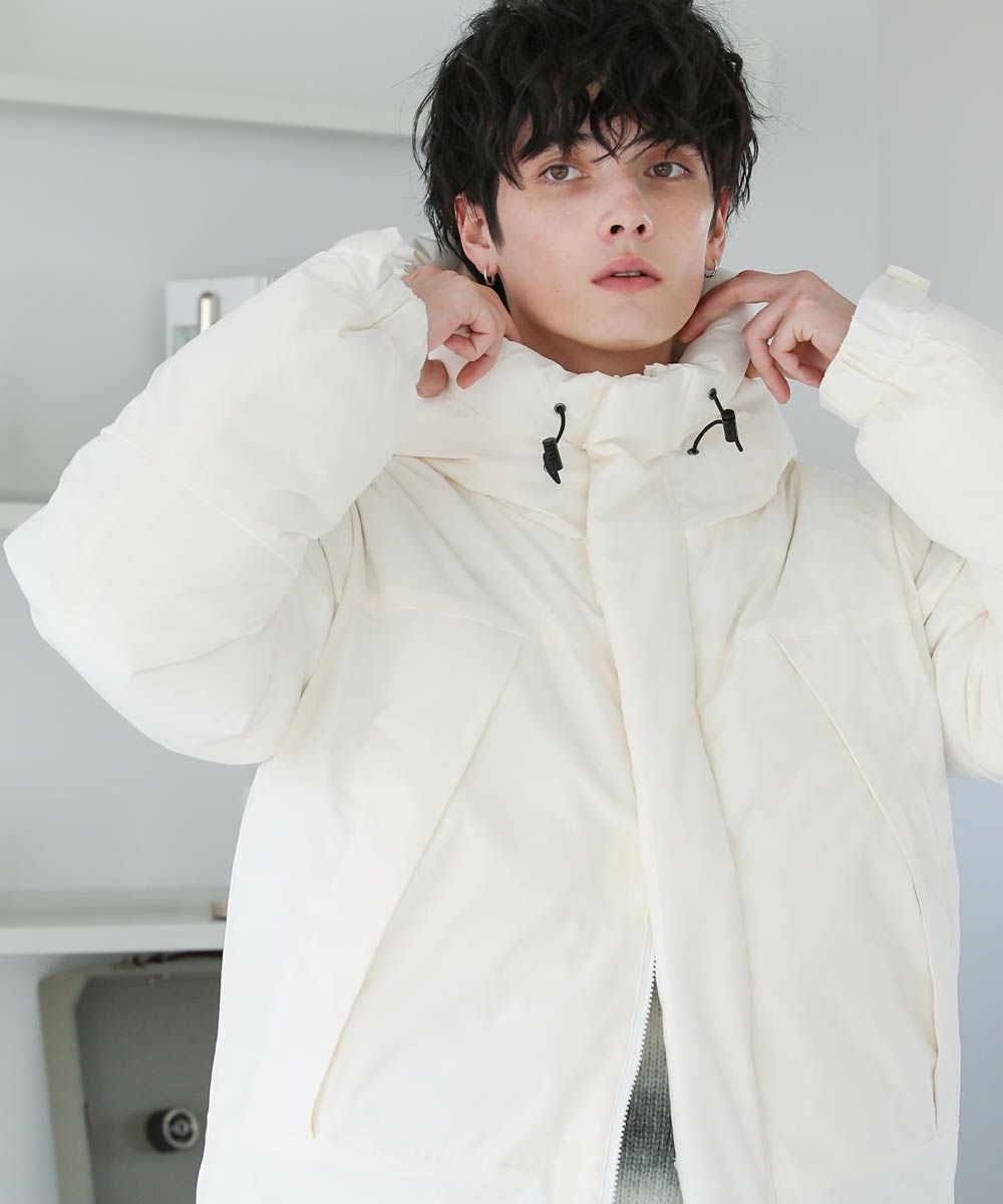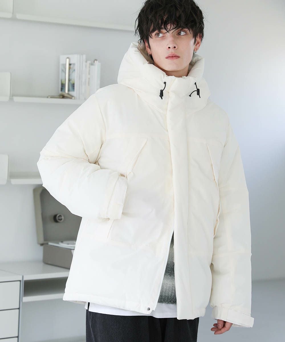 ボリュームのあるスタンドネックフードが防寒性を高める中綿ブルゾン。身幅を広く取ったビッグシルエットが今っぽく、存在感のある1着。風の侵入を防ぐスタンドネック仕様のフードや、比翼仕立てのフロントジップ、袖口のストラップなど、寒さを防ぐためのディティールにも拘って作られています。また、裾にはドローコードを施しているため風の侵入を防ぐ他、シルエットに変化をつけることも可能。フードまでしっかりと詰まった中綿がボリューム感を出しつつも、シームレスデザインですっきりとした印象で着こなせます。