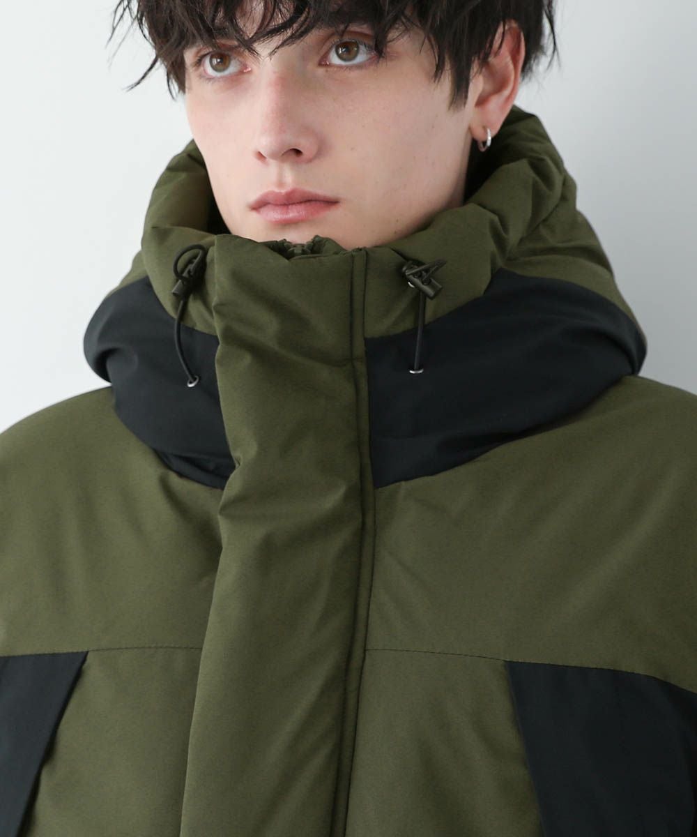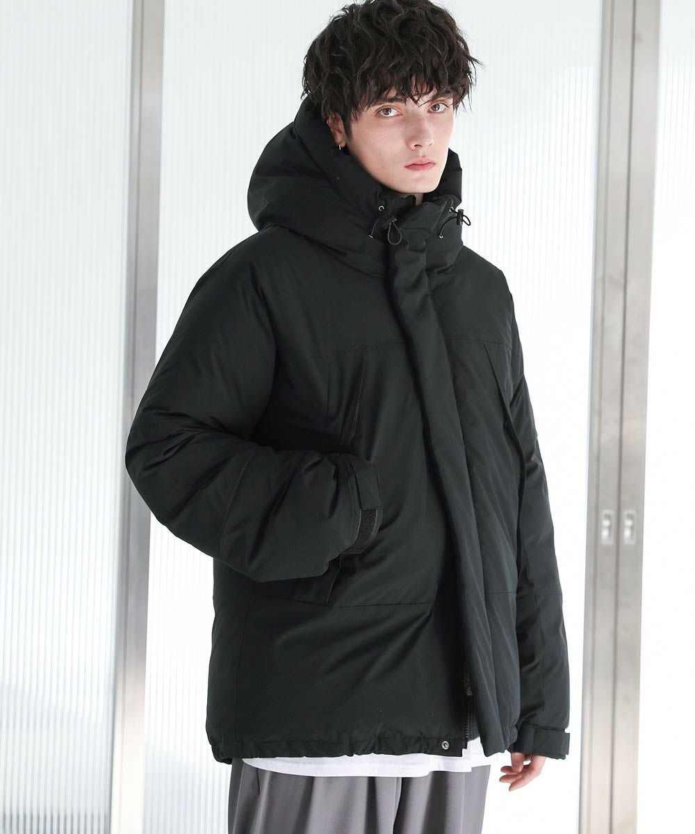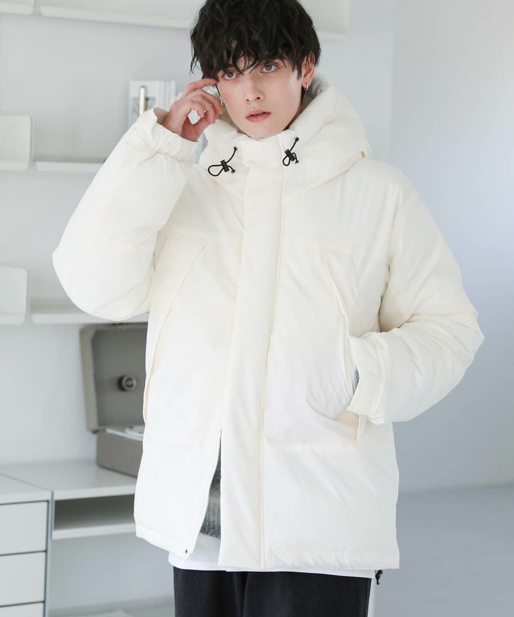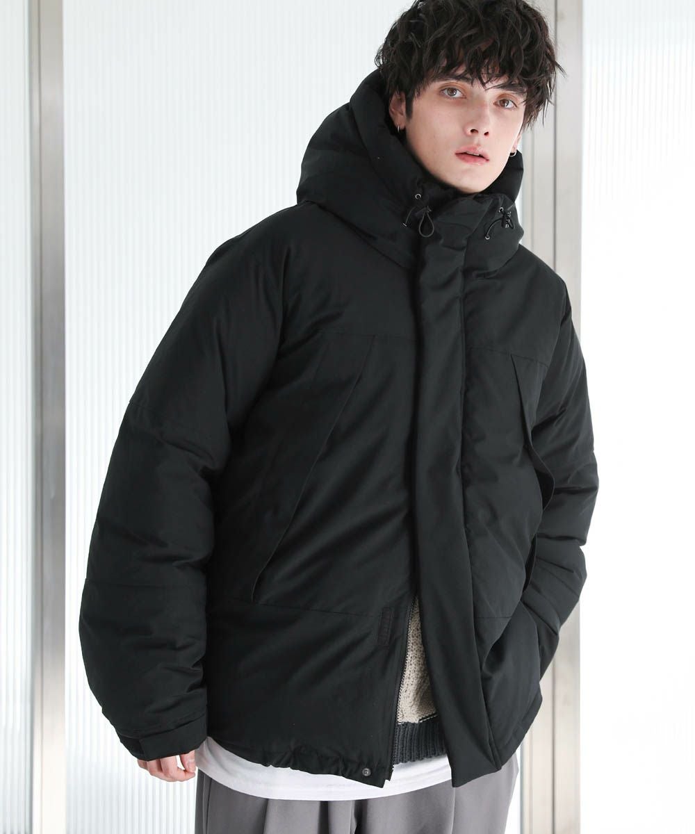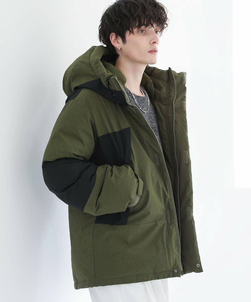 ボリュームのあるスタンドネックフードが防寒性を高める中綿ブルゾン。身幅を広く取ったビッグシルエットが今っぽく、存在感のある1着。風の侵入を防ぐスタンドネック仕様のフードや、比翼仕立てのフロントジップ、袖口のストラップなど、寒さを防ぐためのディティールにも拘って作られています。また、裾にはドローコードを施しているため風の侵入を防ぐ他、シルエットに変化をつけることも可能。フードまでしっかりと詰まった中綿がボリューム感を出しつつも、シームレスデザインですっきりとした印象で着こなせます。