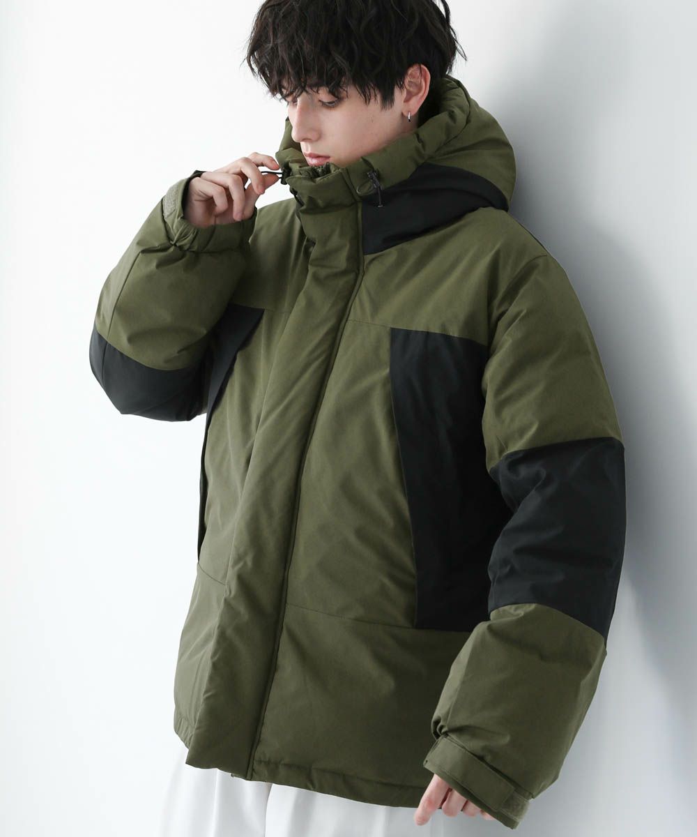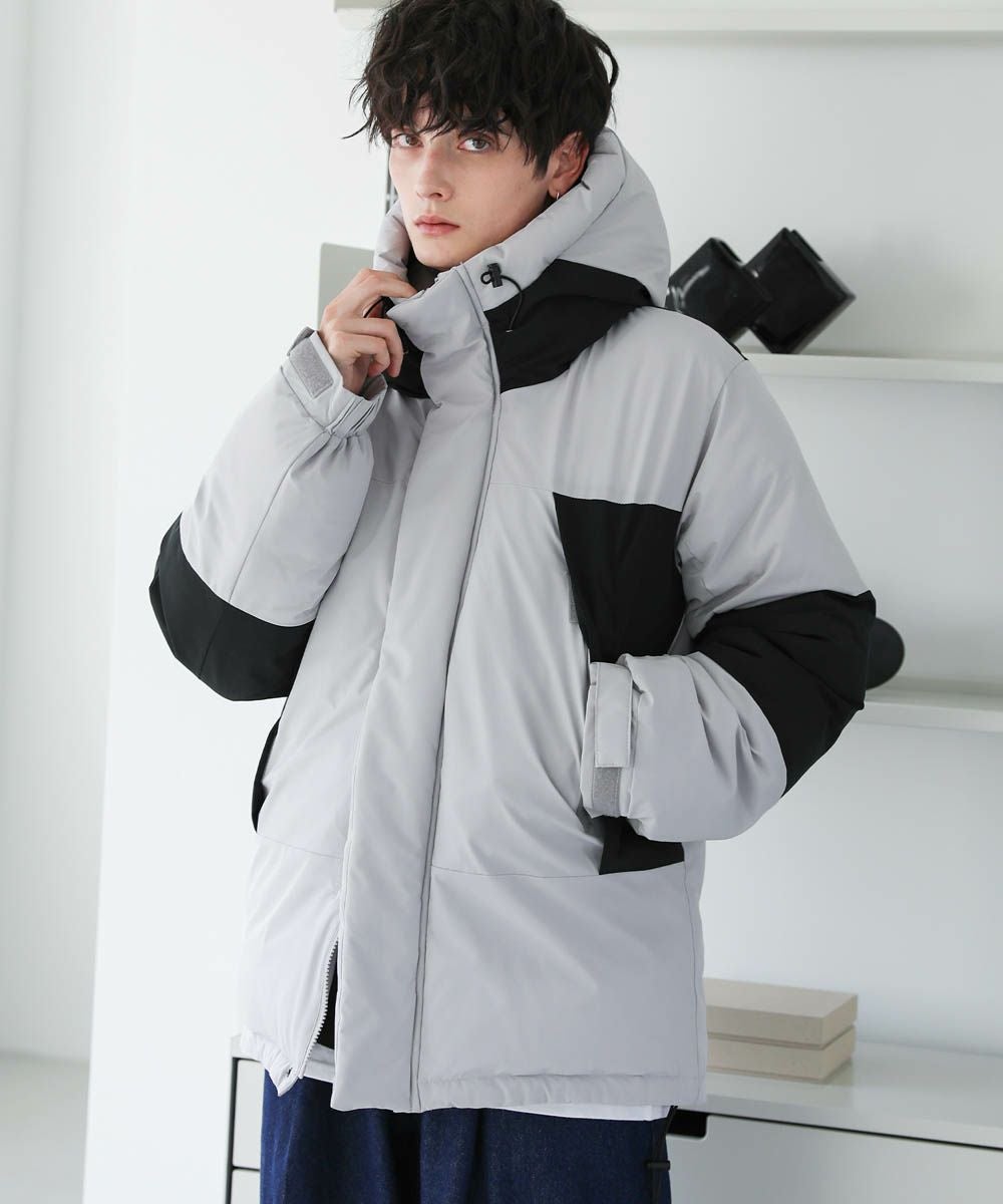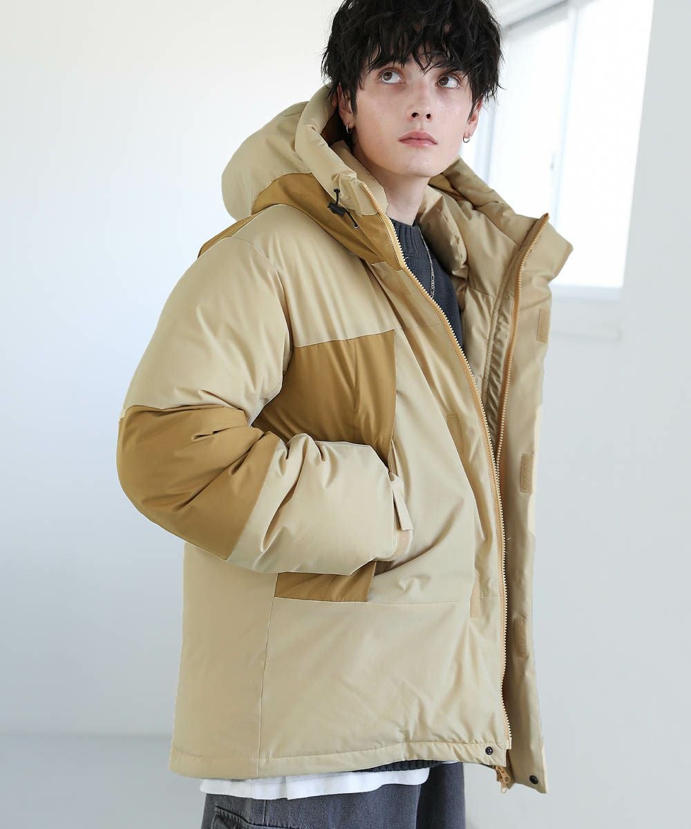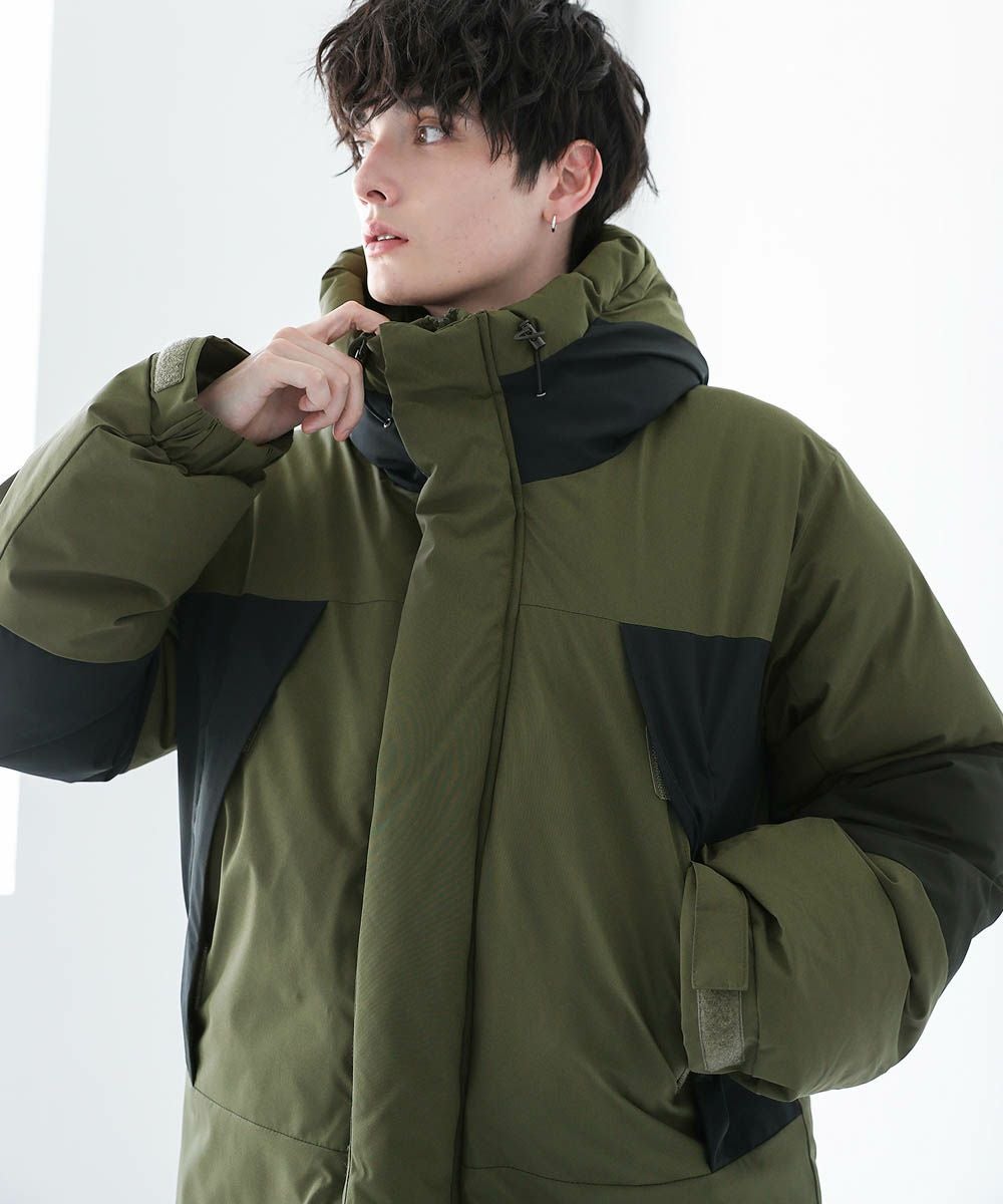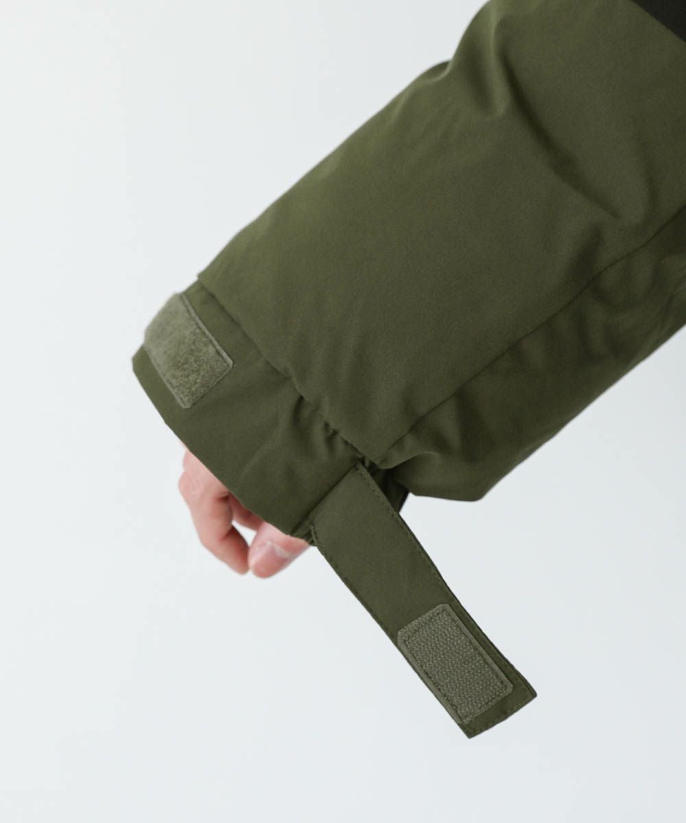 ボリュームのあるスタンドネックフードが防寒性を高める中綿ブルゾン。身幅を広く取ったビッグシルエットが今っぽく、存在感のある1着。風の侵入を防ぐスタンドネック仕様のフードや、比翼仕立てのフロントジップ、袖口のストラップなど、寒さを防ぐためのディティールにも拘って作られています。また、裾にはドローコードを施しているため風の侵入を防ぐ他、シルエットに変化をつけることも可能。フードまでしっかりと詰まった中綿がボリューム感を出しつつも、シームレスデザインですっきりとした印象で着こなせます。