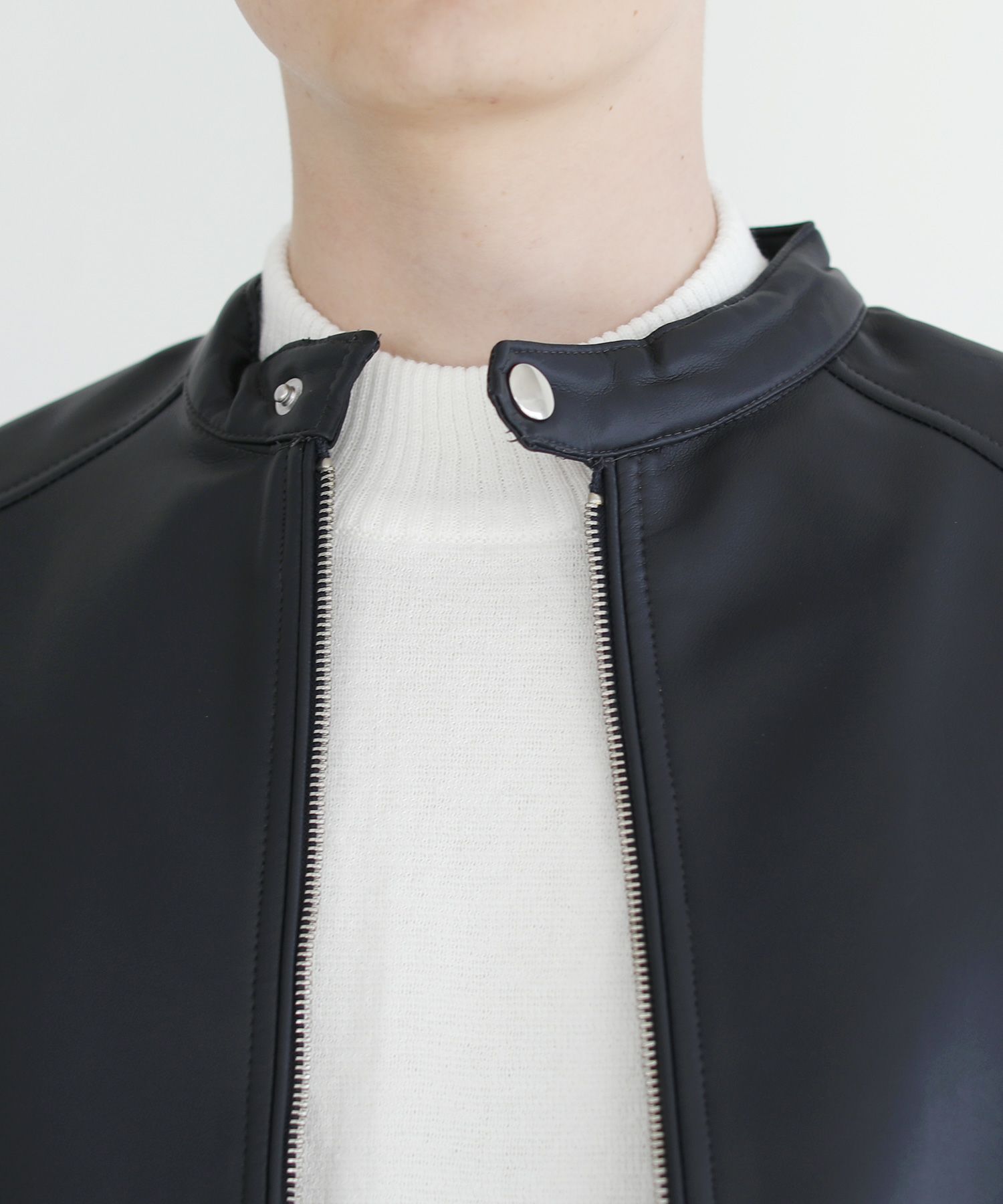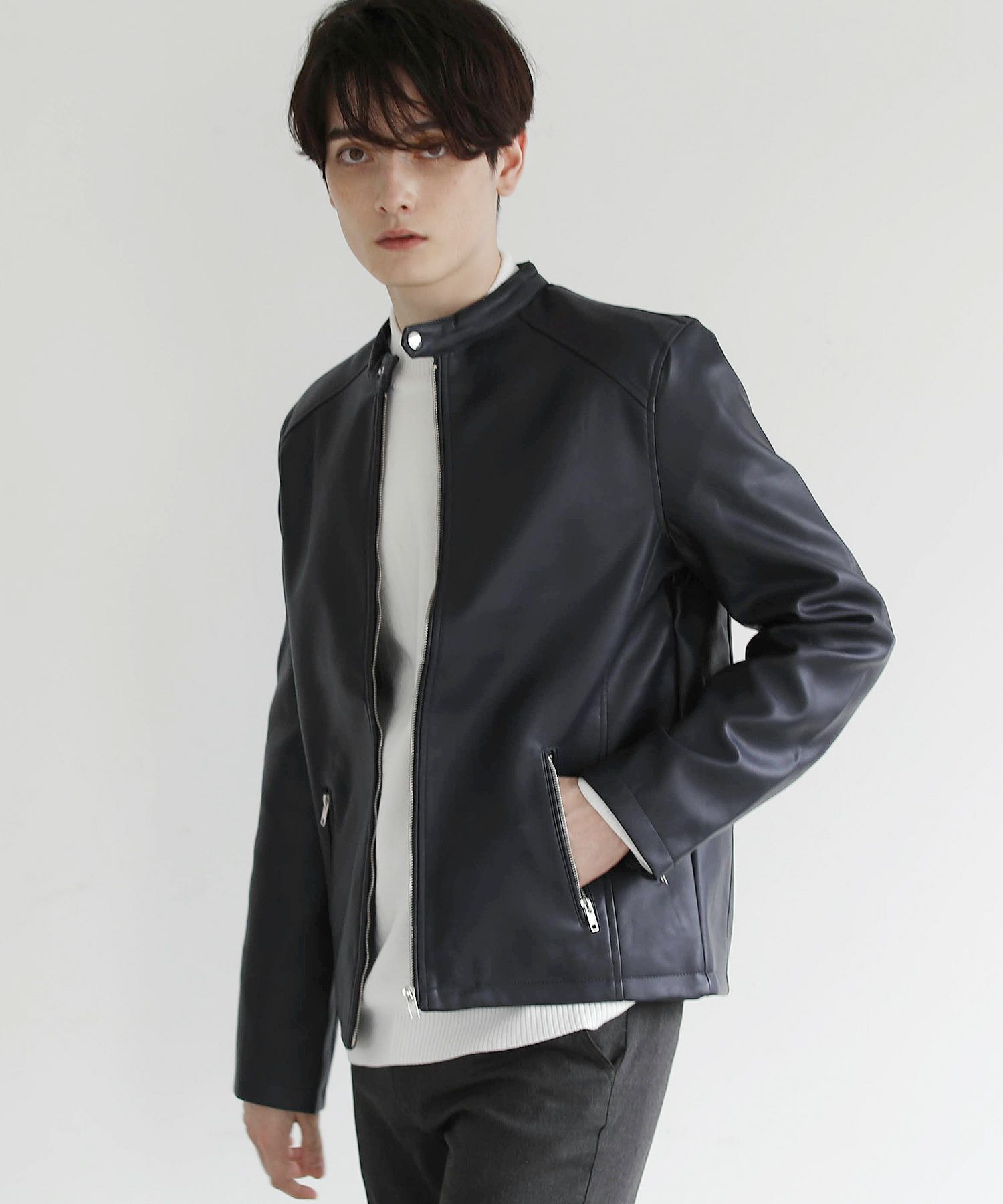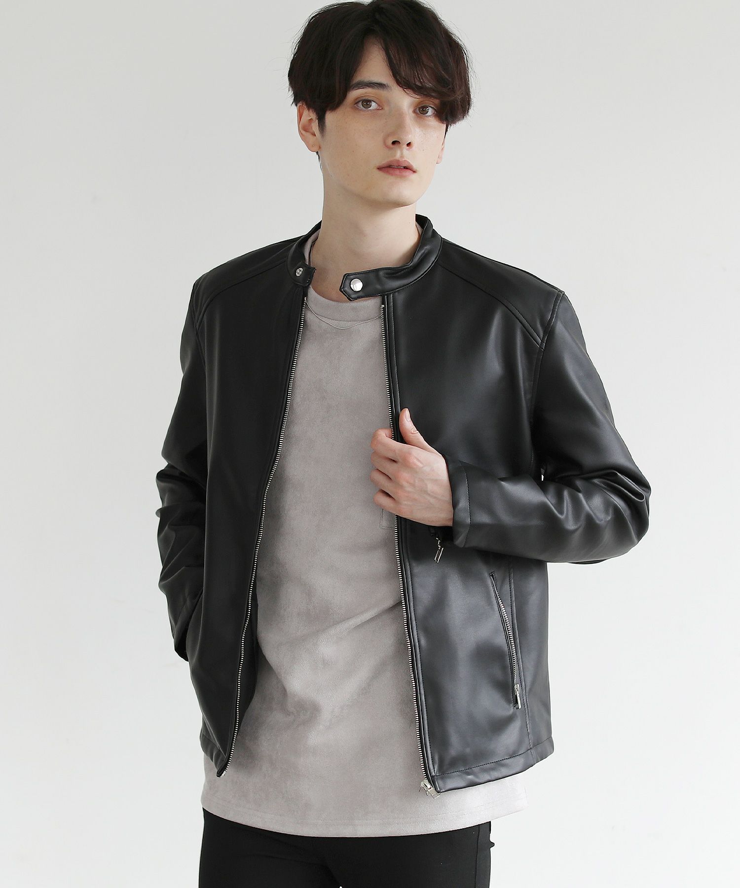 本革のような風合いのPUレザーで仕立てた定番のシングルライダースジャケット。