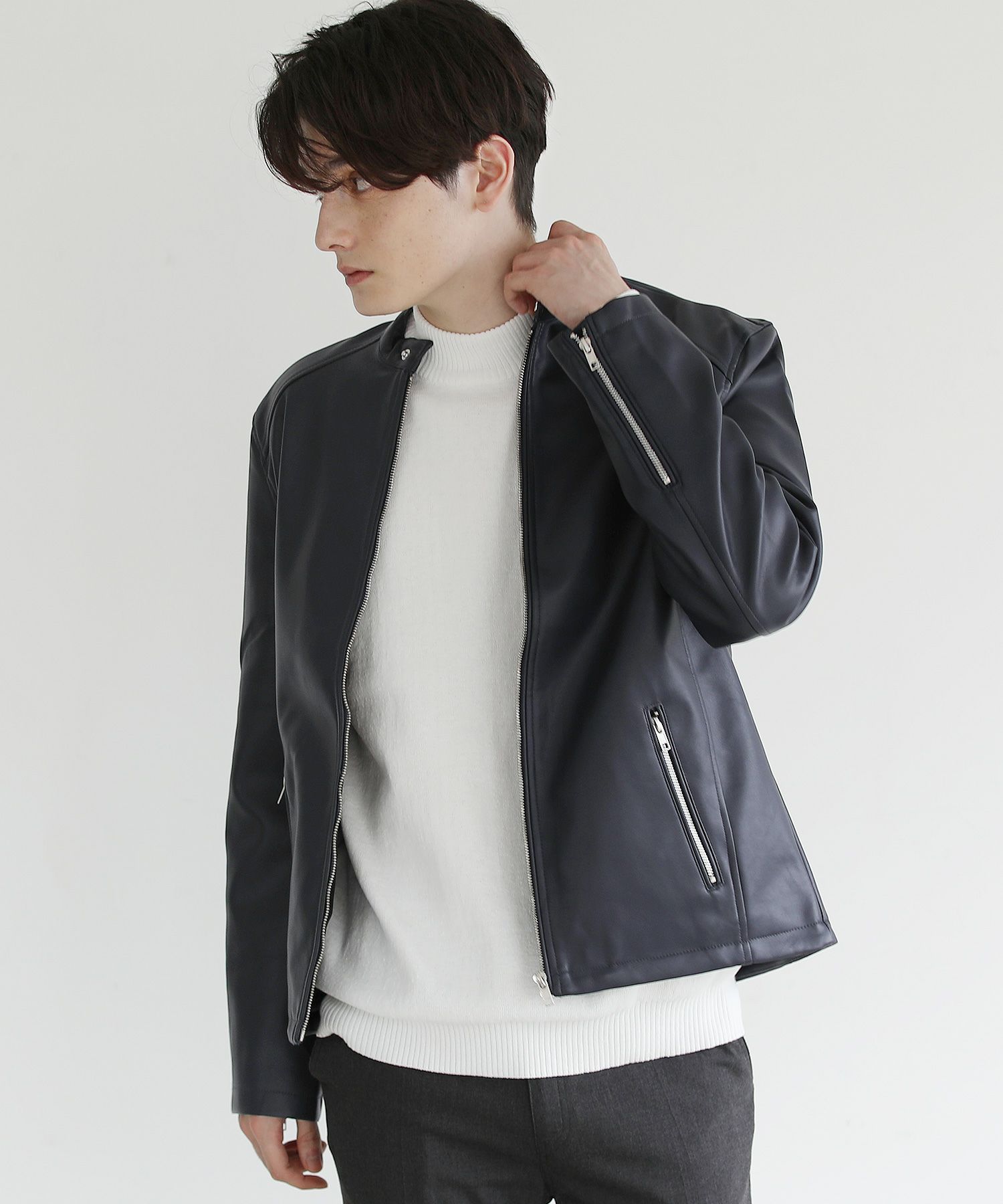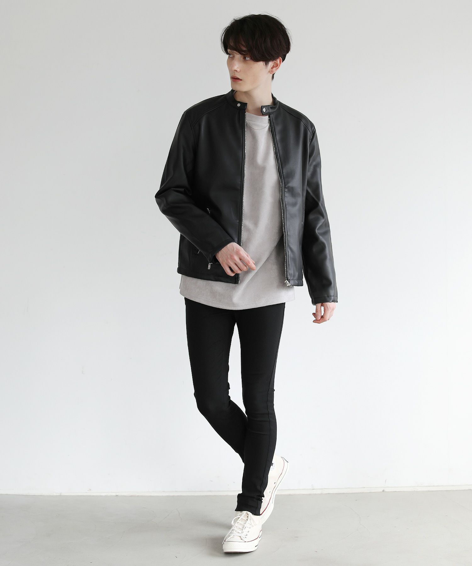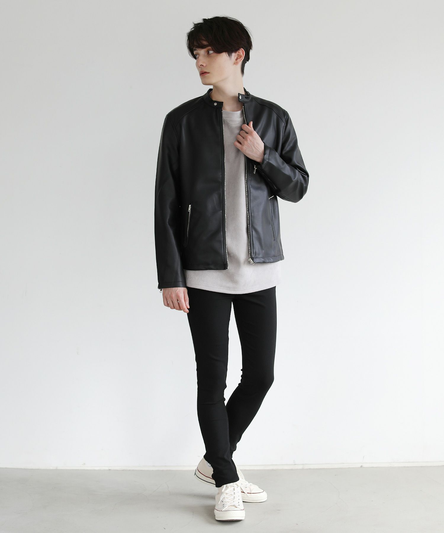 本革のような風合いのPUレザーで仕立てた定番のシングルライダースジャケット。