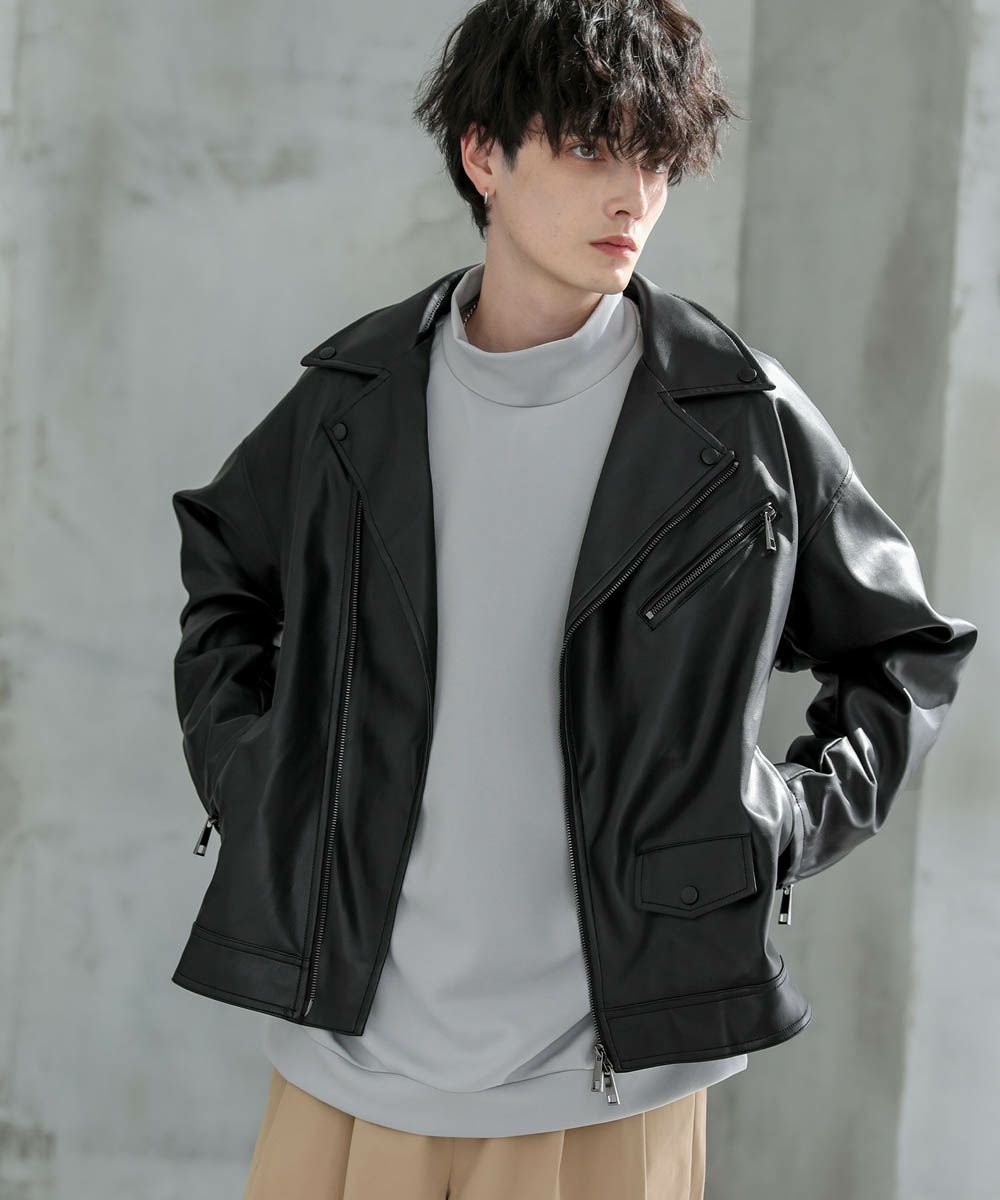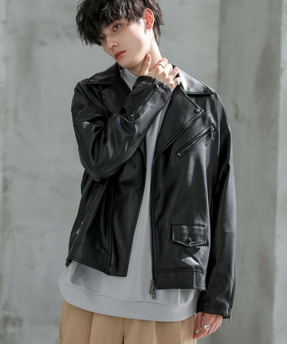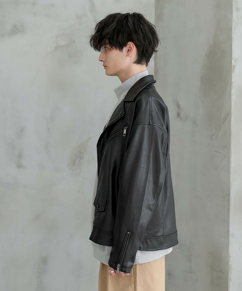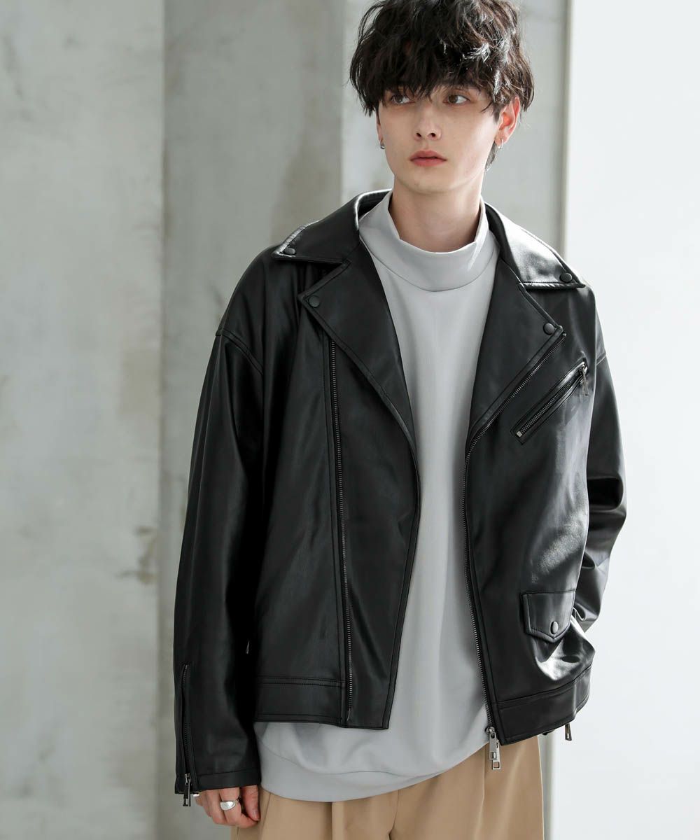 モードかつクリーンな印象のダブルライダースジャケット。ワイドめの身幅にドロップショルダー、着丈は長すぎないのでオーバーサイズながらすっきりと着こなせるバランスが魅力です。