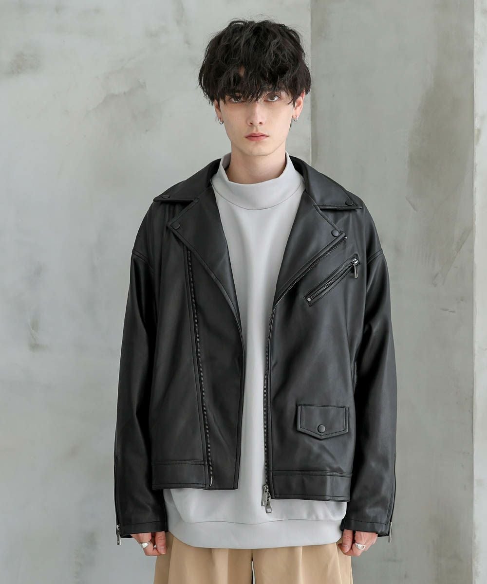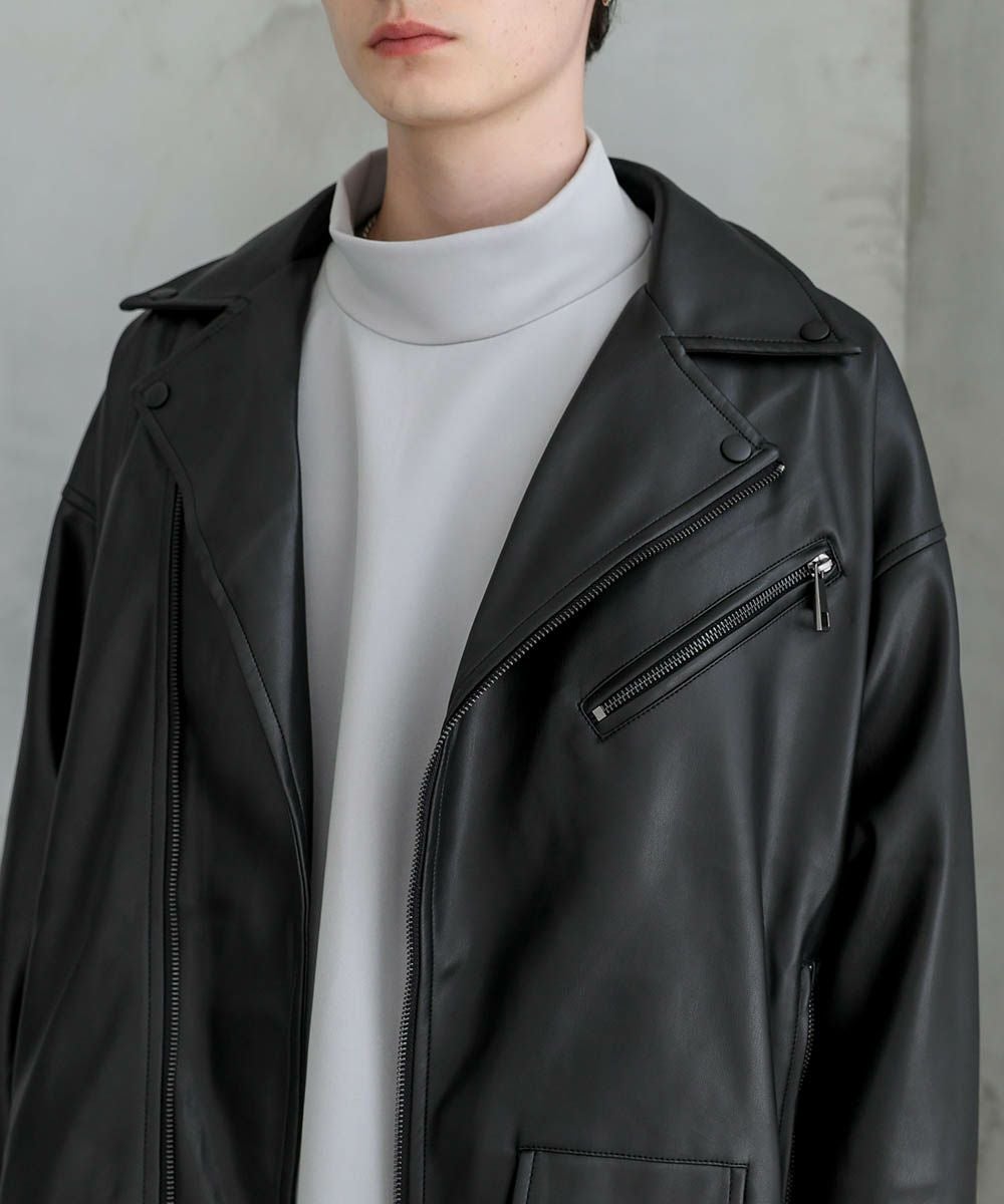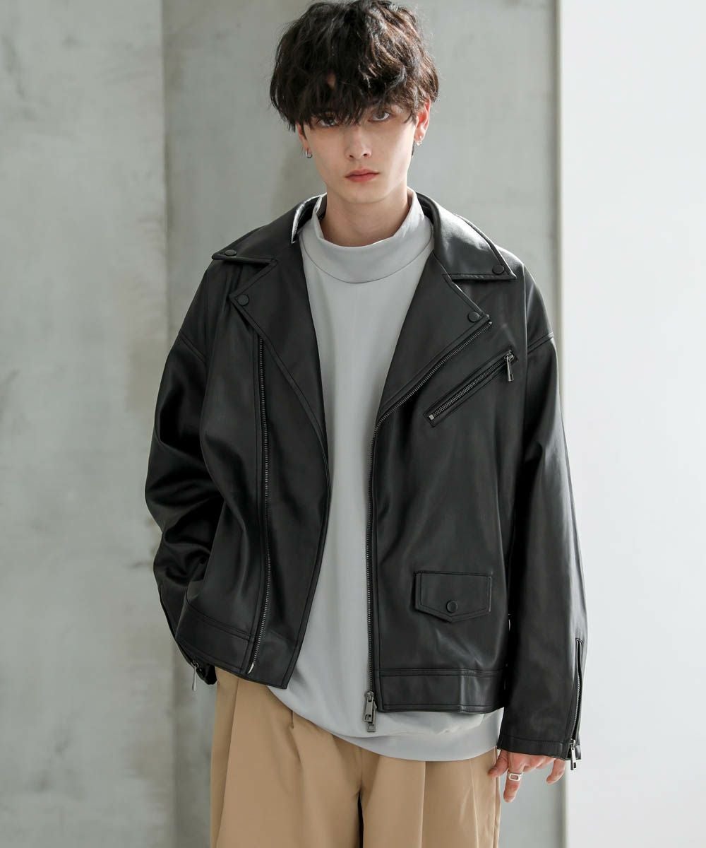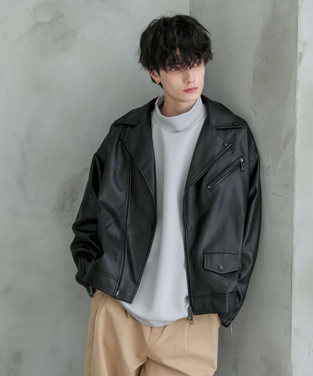 モードかつクリーンな印象のダブルライダースジャケット。ワイドめの身幅にドロップショルダー、着丈は長すぎないのでオーバーサイズながらすっきりと着こなせるバランスが魅力です。