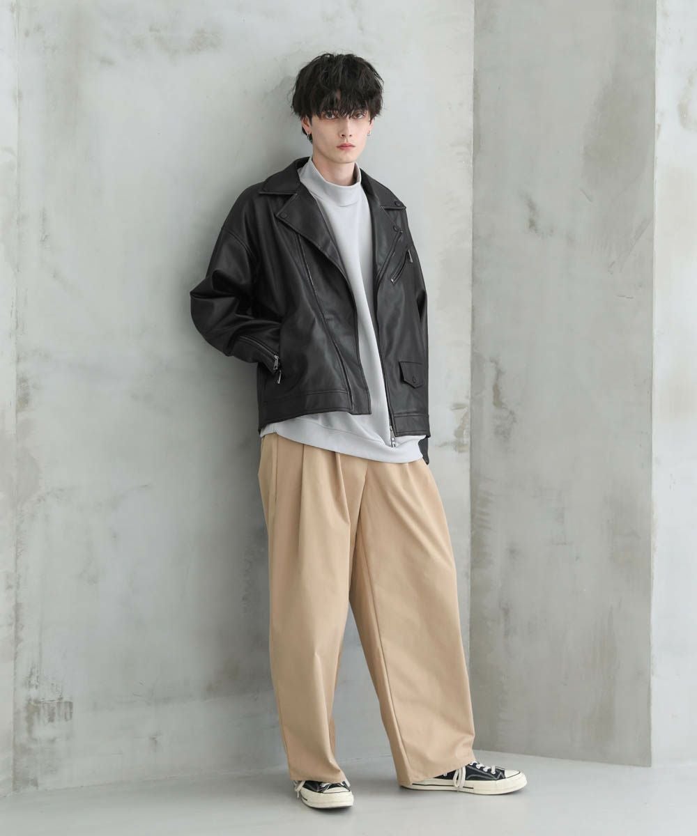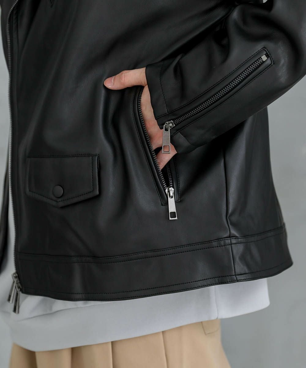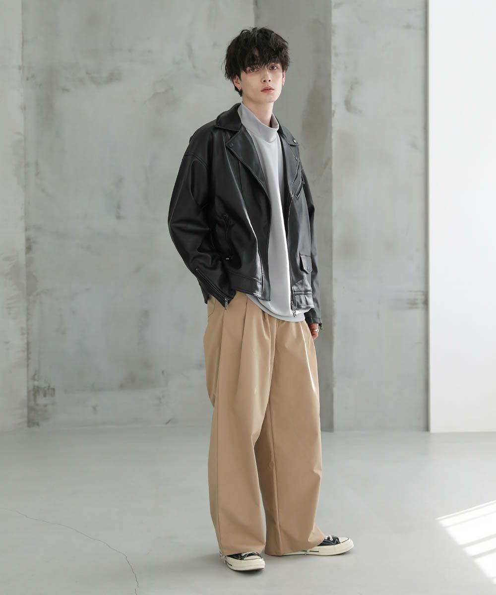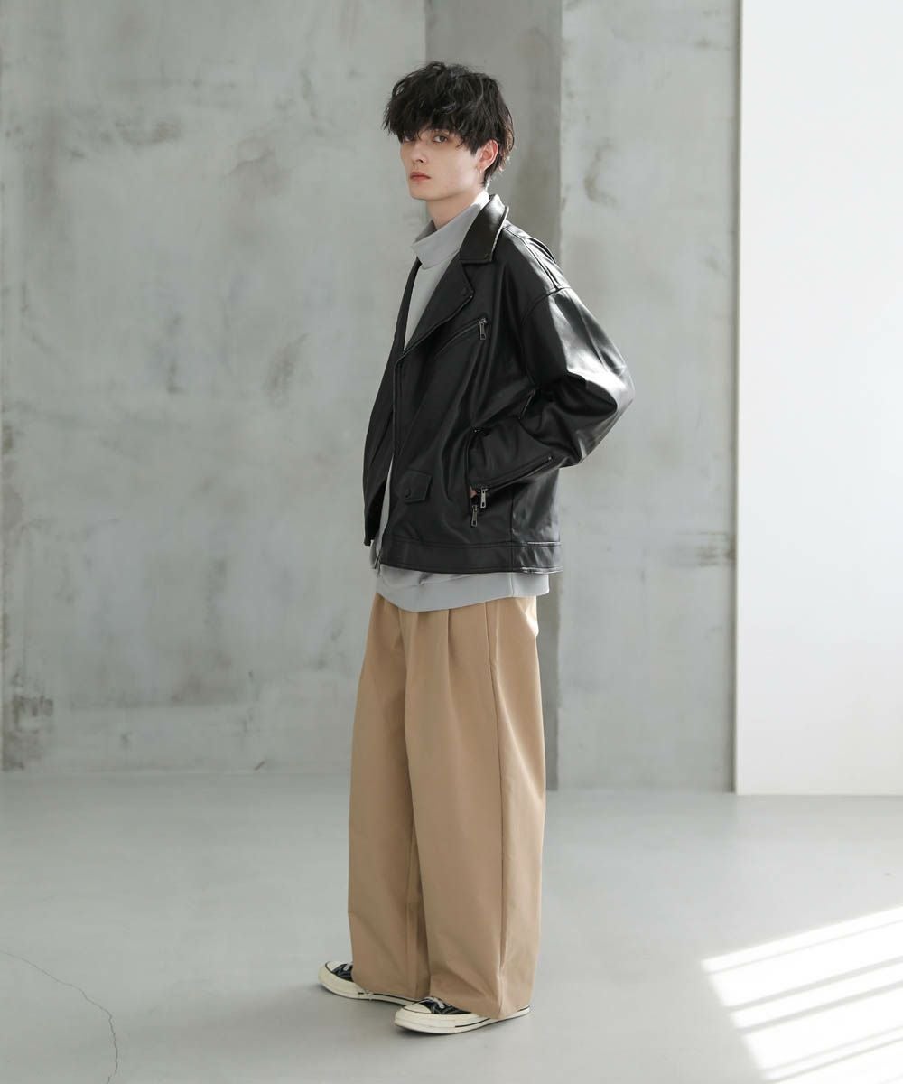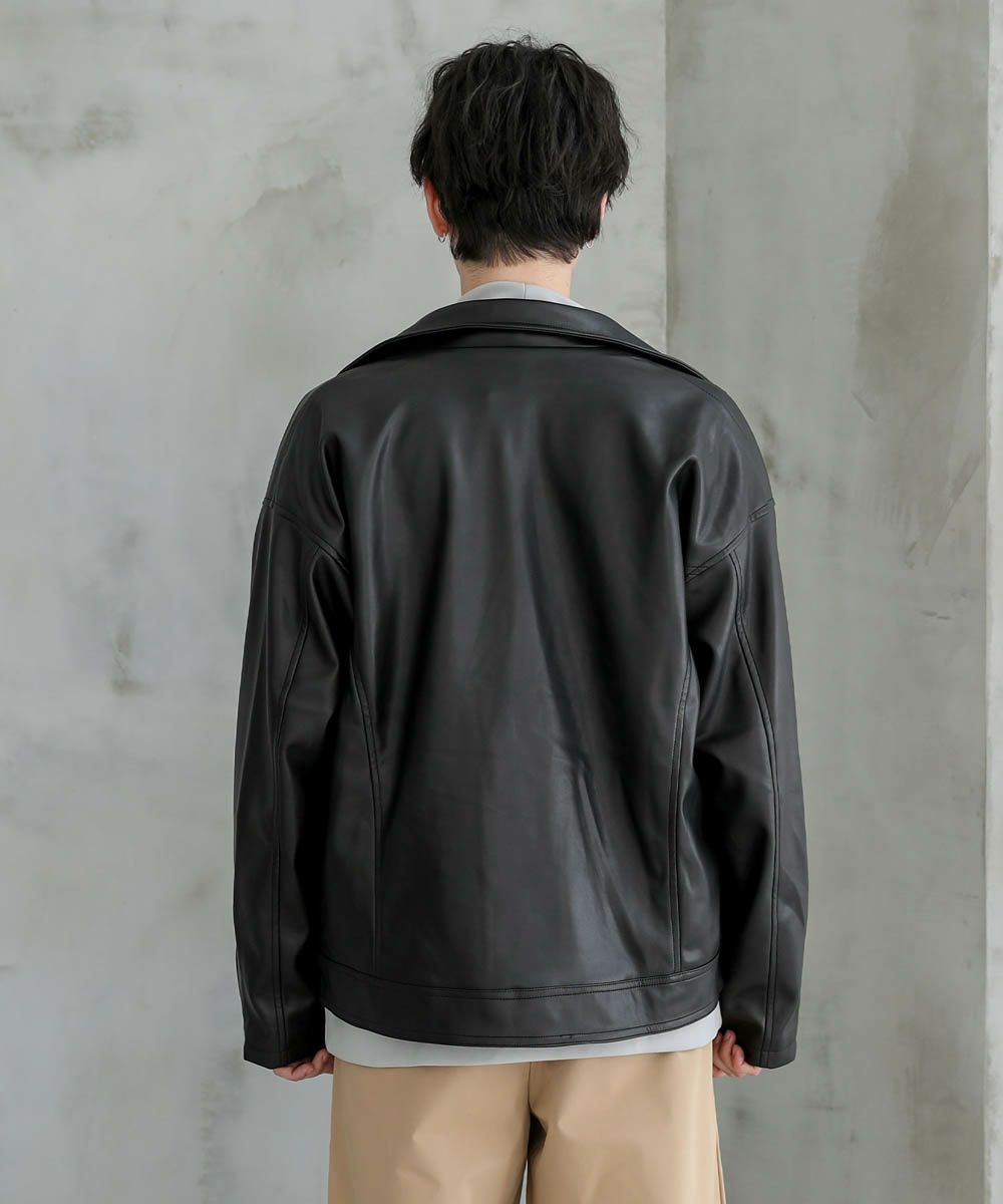モードかつクリーンな印象のダブルライダースジャケット。ワイドめの身幅にドロップショルダー、着丈は長すぎないのでオーバーサイズながらすっきりと着こなせるバランスが魅力です。