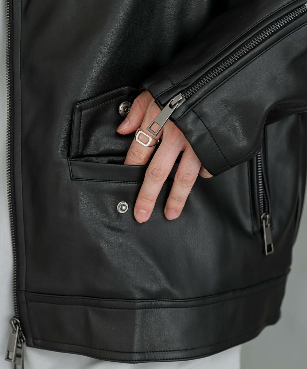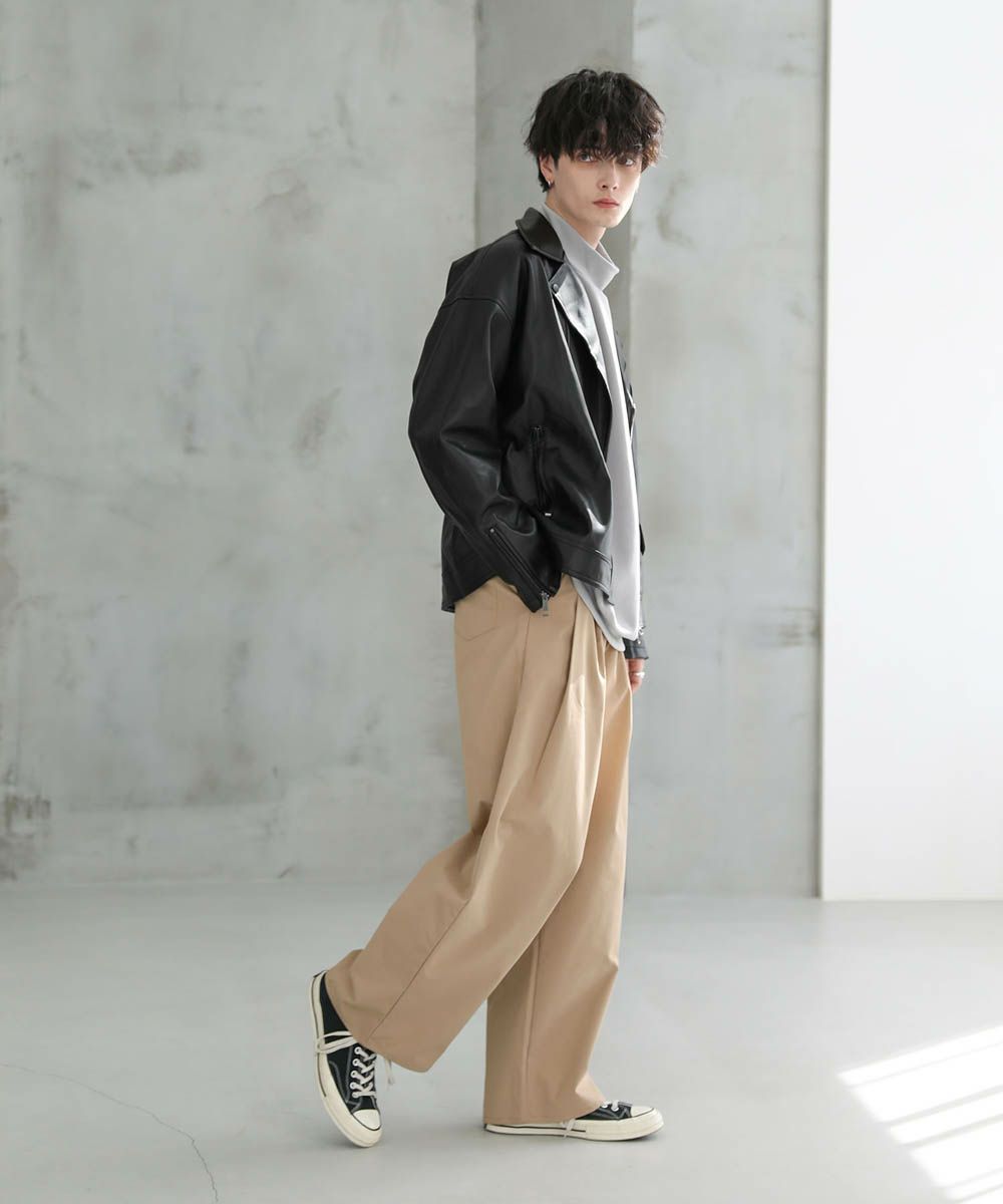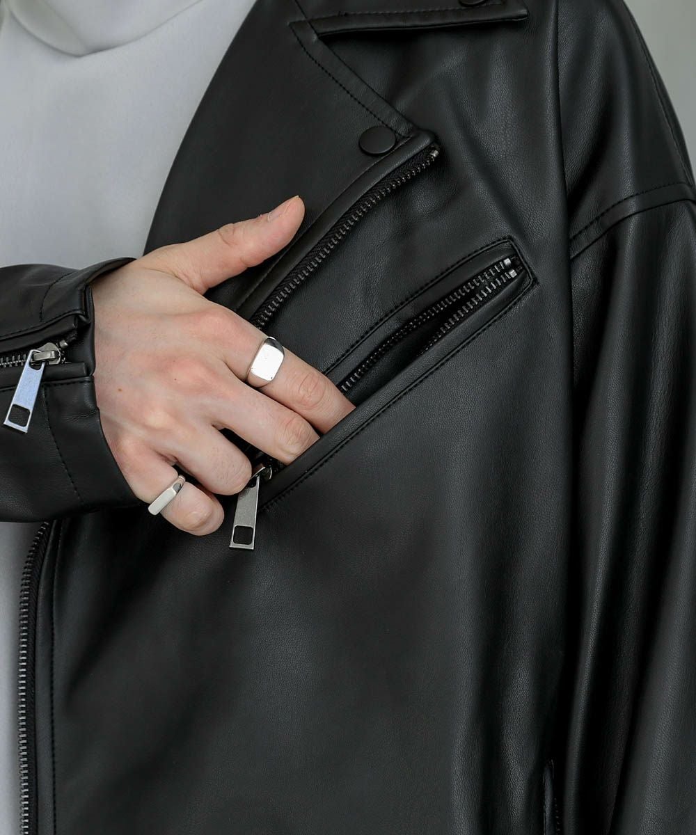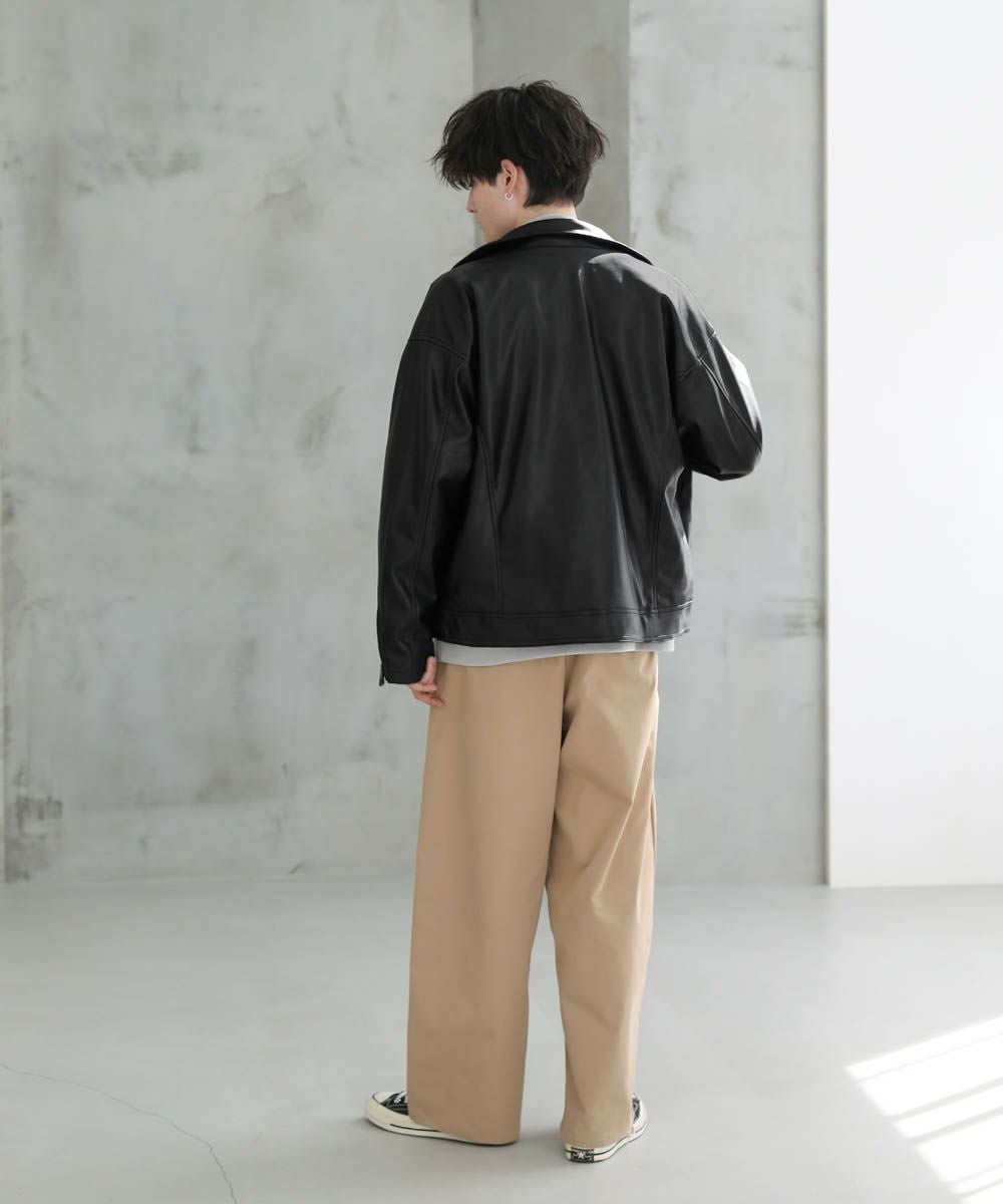 モードかつクリーンな印象のダブルライダースジャケット。ワイドめの身幅にドロップショルダー、着丈は長すぎないのでオーバーサイズながらすっきりと着こなせるバランスが魅力です。