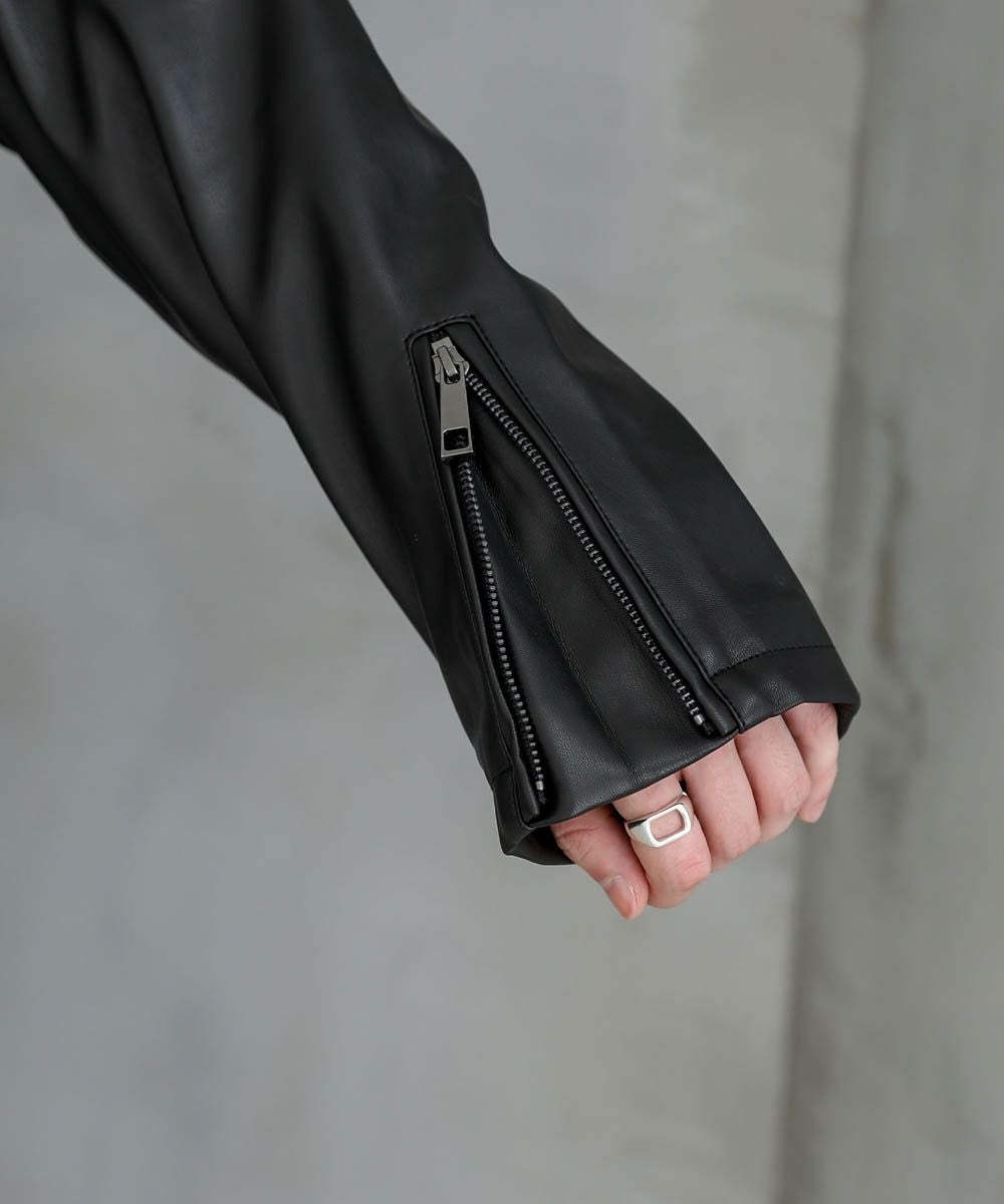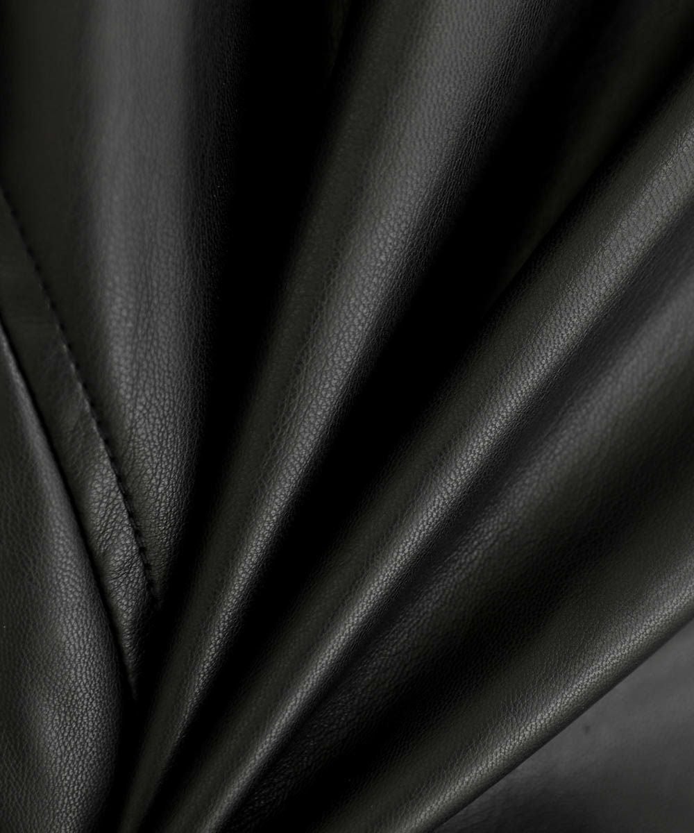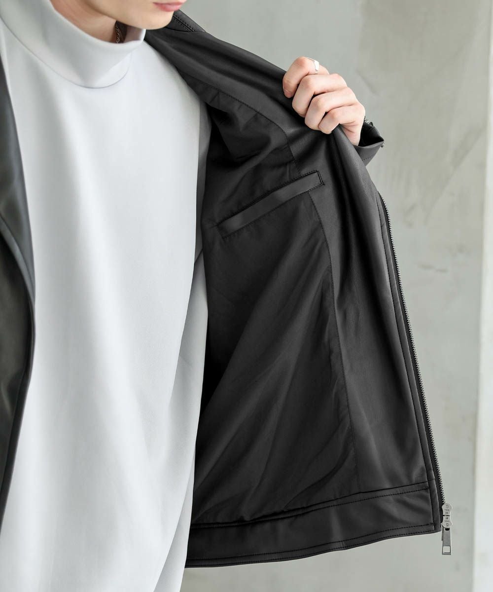 細かなシボ感のあるPUレザーはほんのりと光沢があり、上品な印象で着こなせます。裏地付きで引っ掛かりがなくスムーズに着脱可能。また内ポケット付きで実用性にも優れています。