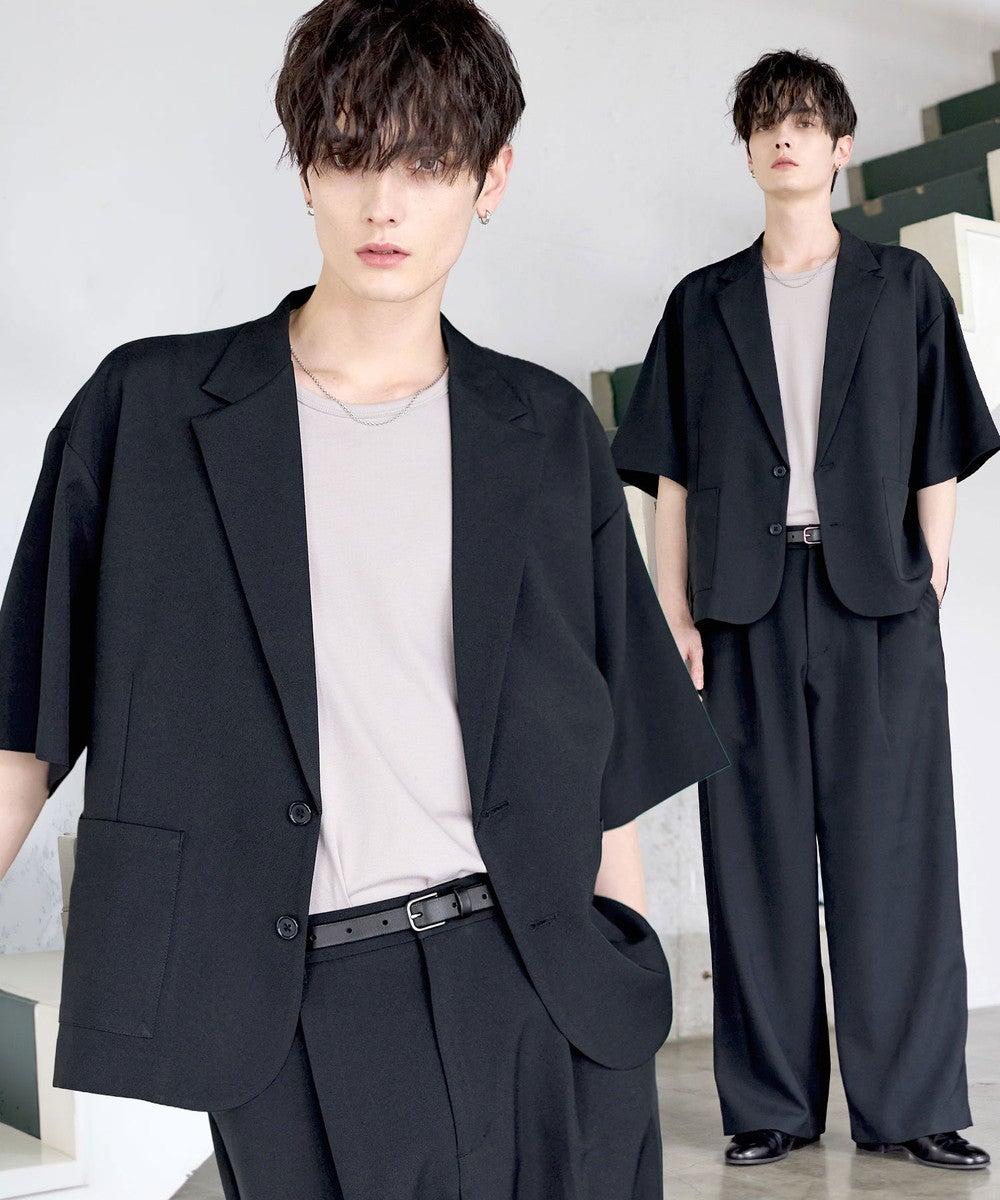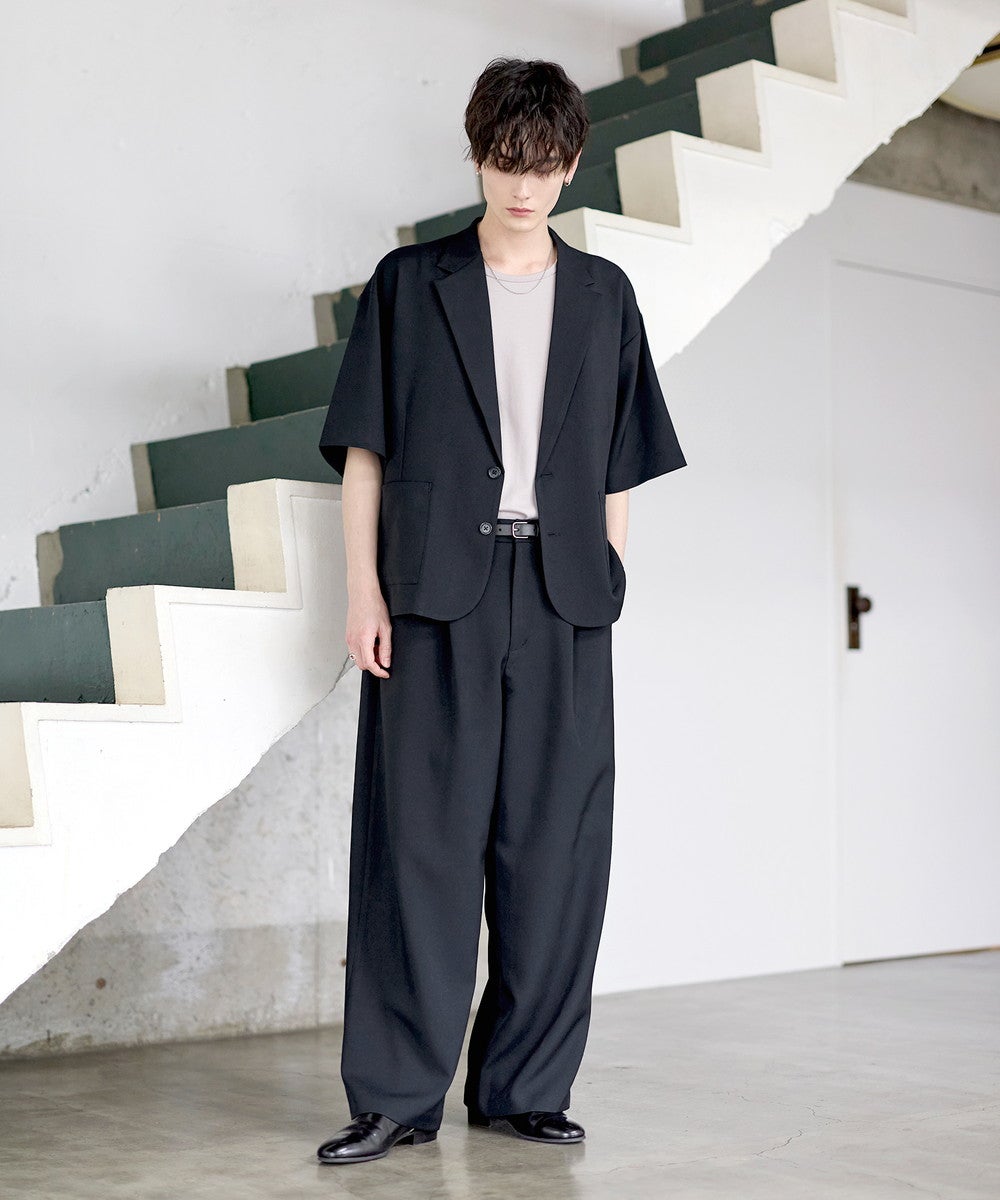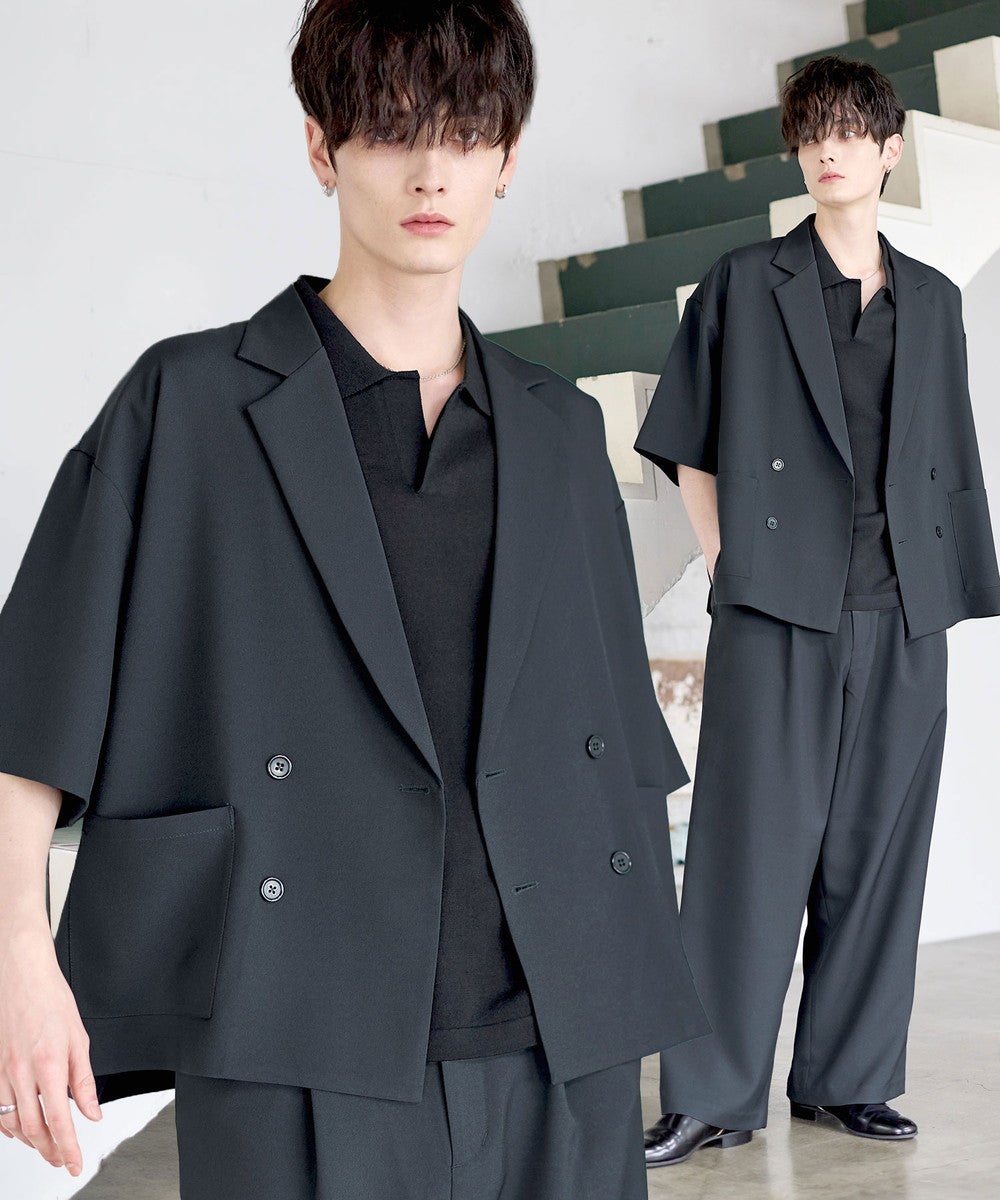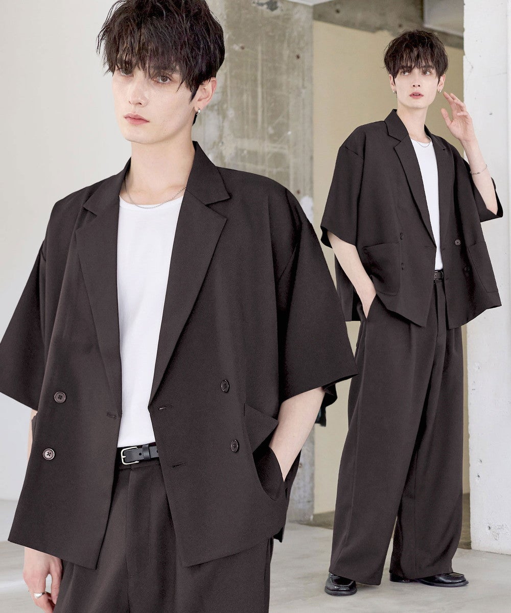 【セットアップ 2点セット】ダブルテーラード半袖シャツ+ワイドバギーイージーパンツ