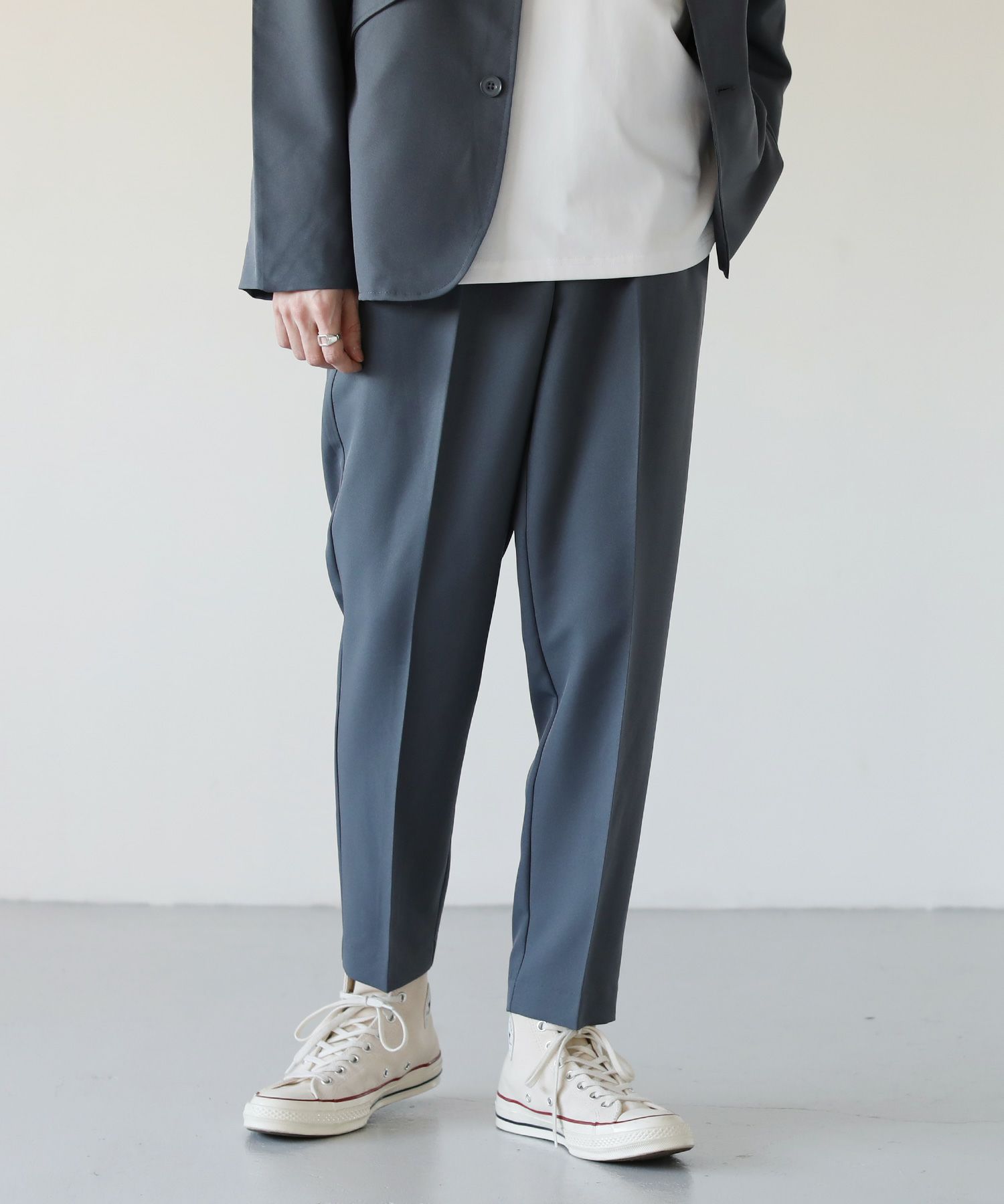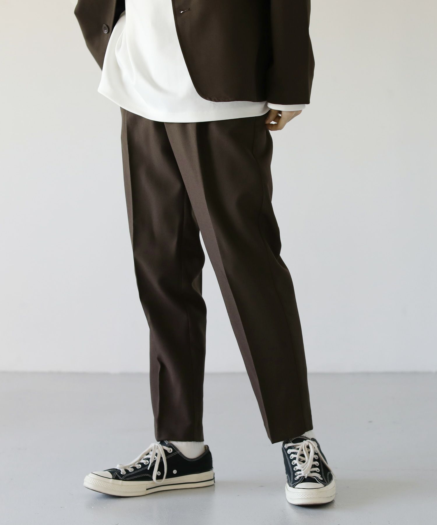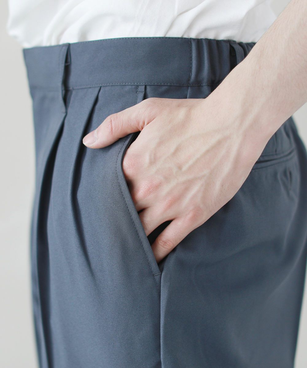 腰回りにゆとりを持たせ、裾に向かって緩やかにテーパードをかけたリラックス感のあるスラックスパンツ。ワンタック、センタープレスなどきれいめな要素を取り入れ、カジュアルになりすぎずお使いいただけます。