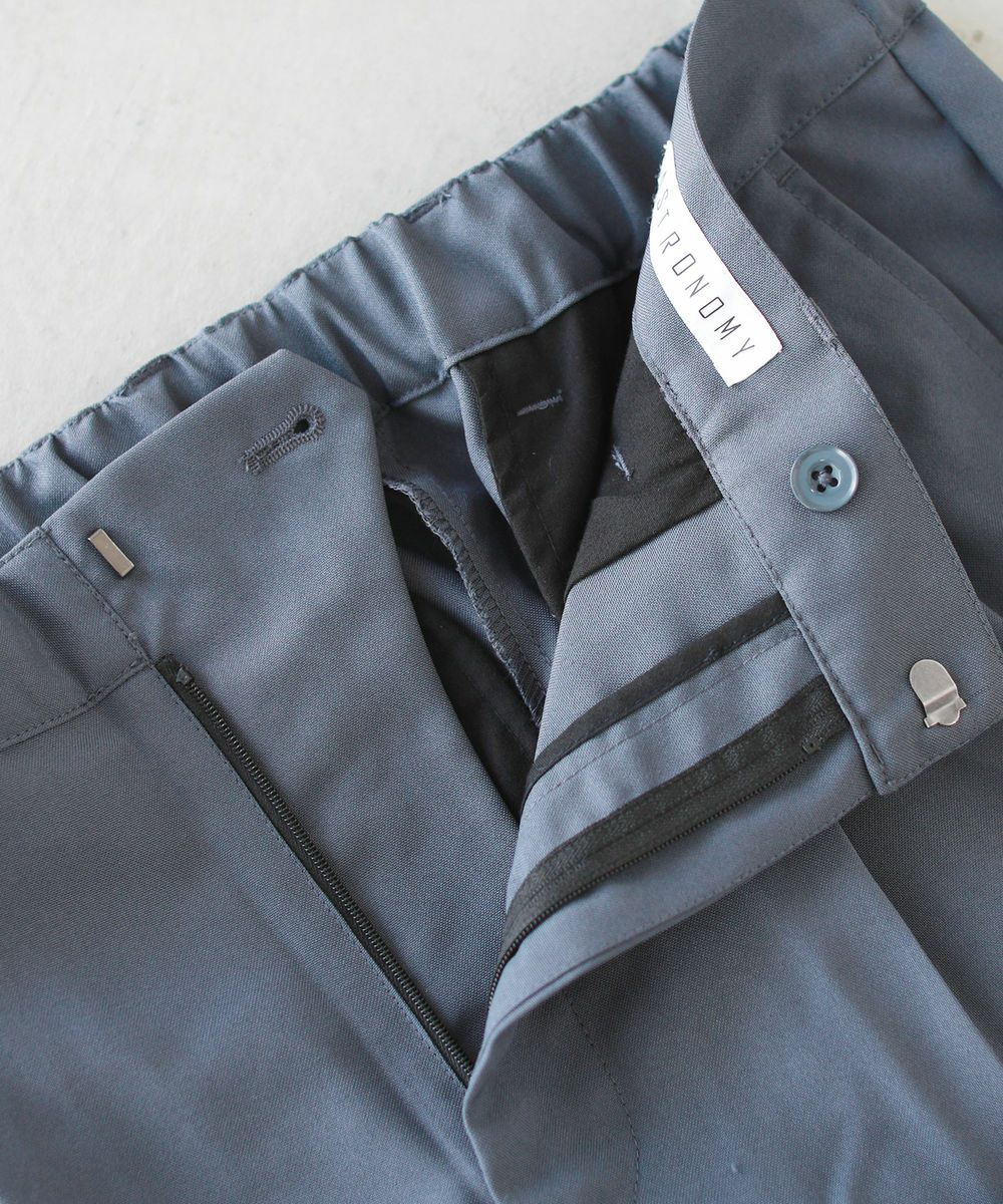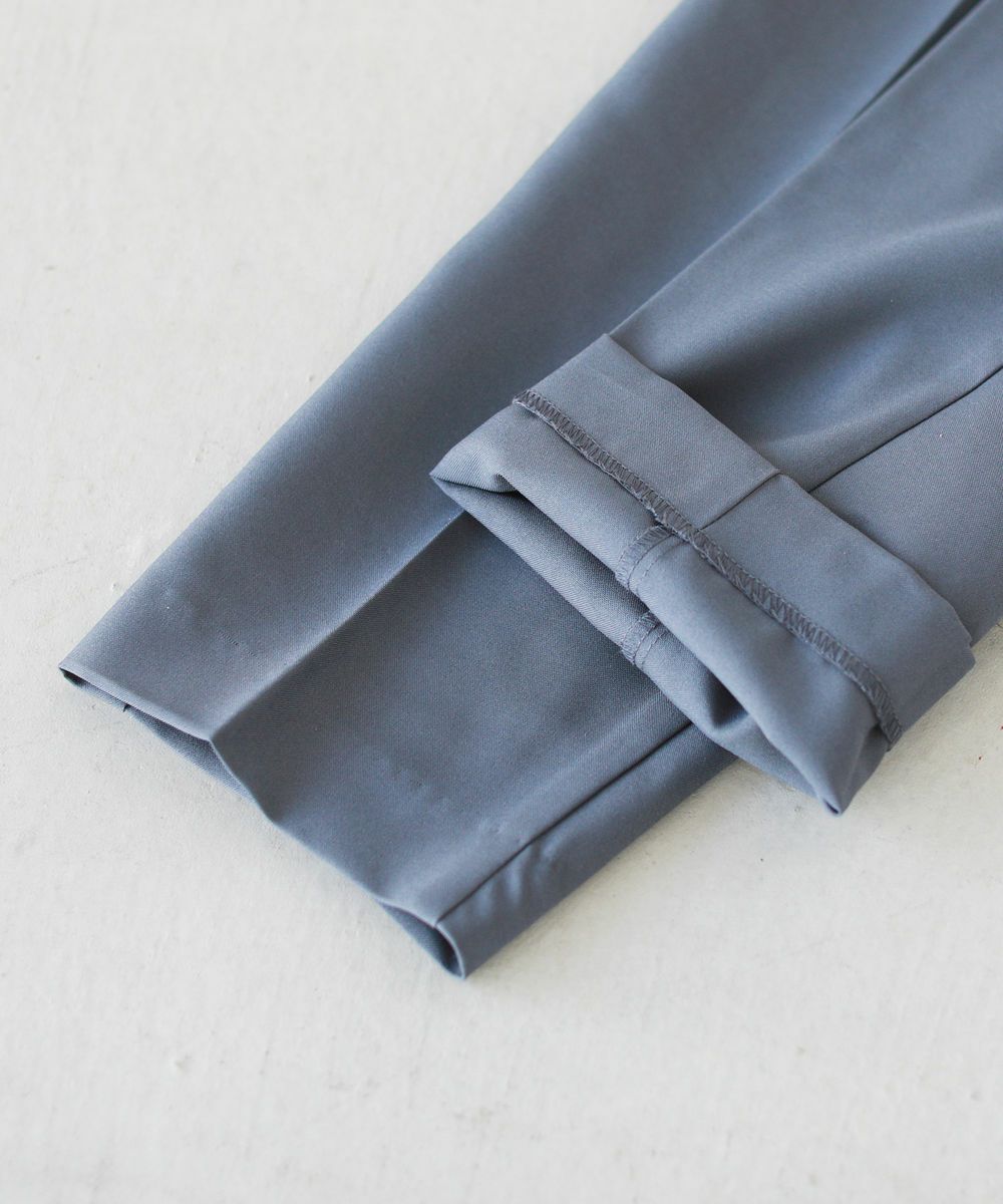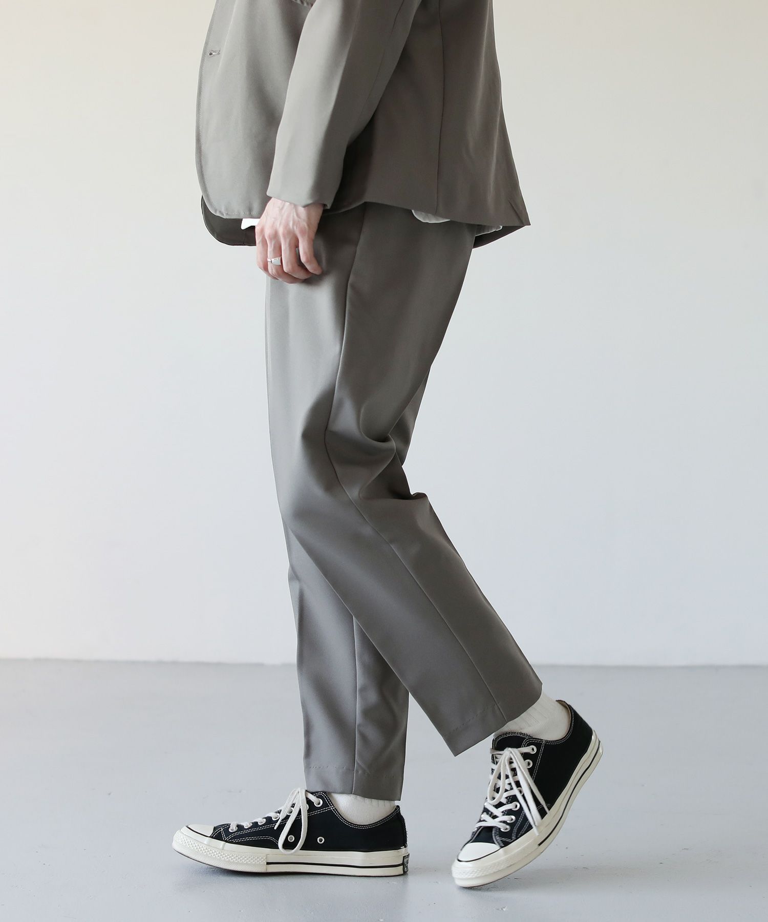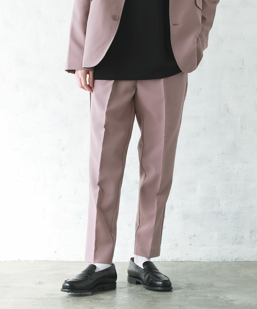 腰回りにゆとりを持たせ、裾に向かって緩やかにテーパードをかけたリラックス感のあるスラックスパンツ。ワンタック、センタープレスなどきれいめな要素を取り入れ、カジュアルになりすぎずお使いいただけます。