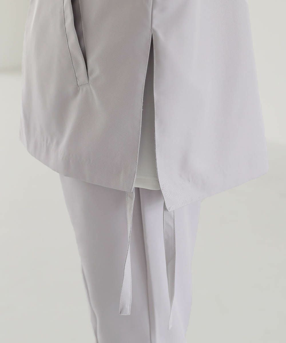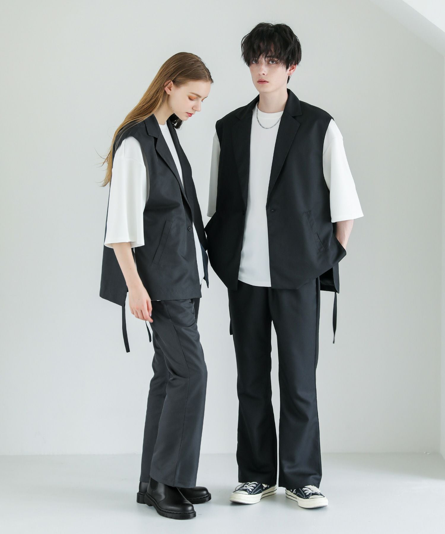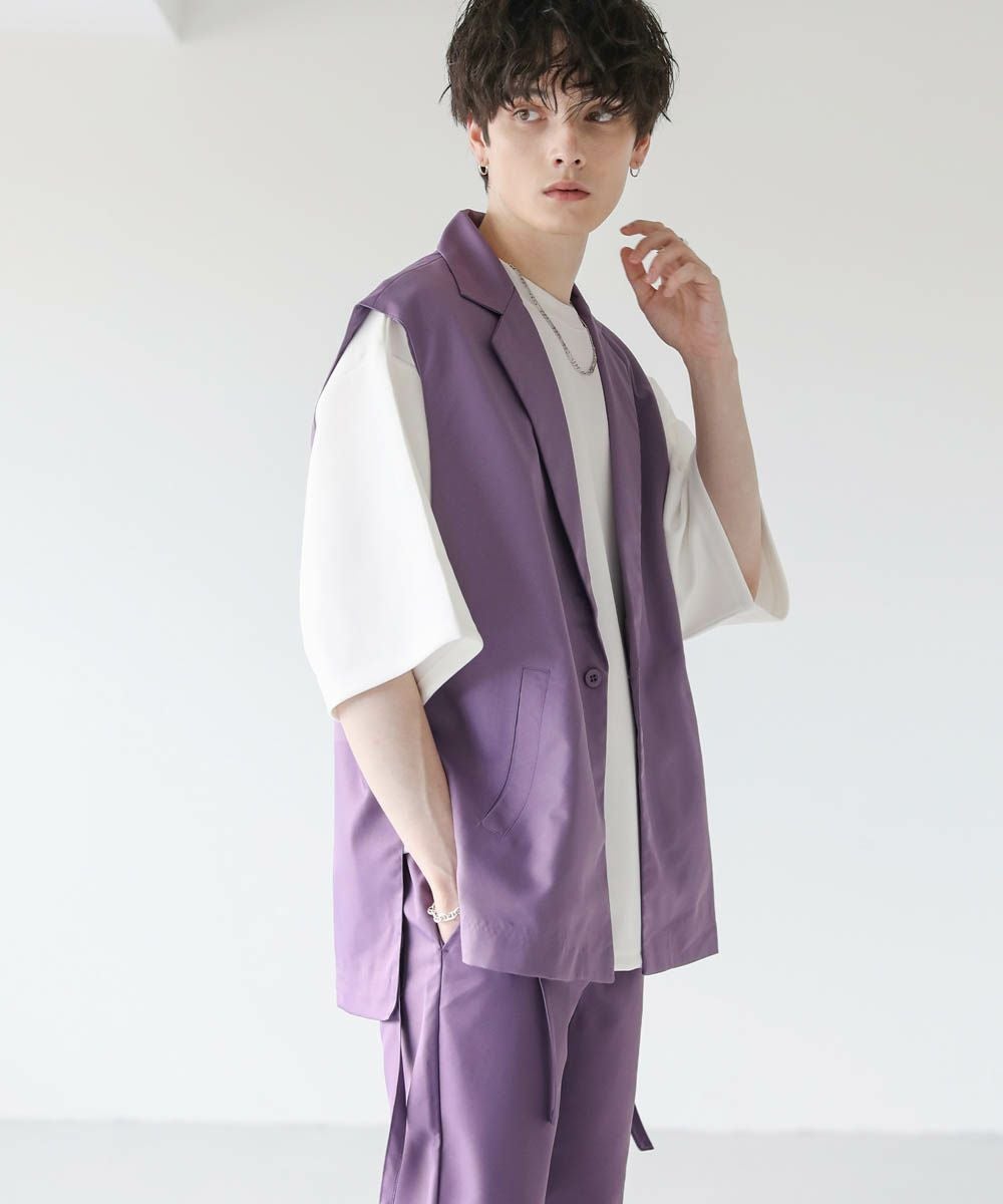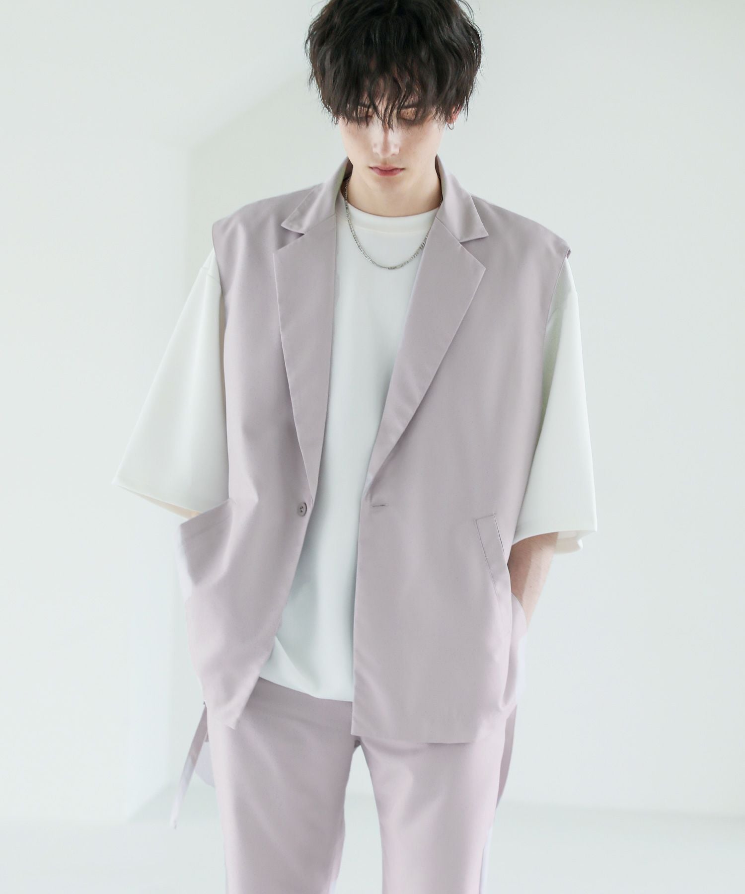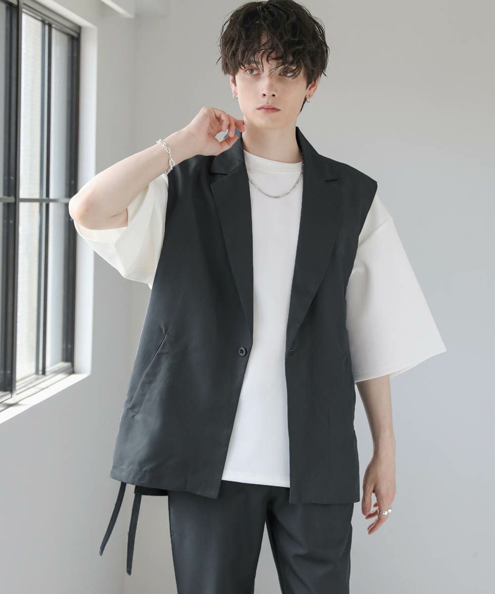 注目度の高いジレベスト。ゆったりとしたオーバーサイズに、スッキリとシャープな印象のテーラーカラー、深めのサイドスリット&サイドコードでアクセントをプラス。腕ぐりが大きく作られているので、オーバーサイズのインナーと合わせてもレイヤードが綺麗に決まります。裏地付きなので着脱もひっかかりがなくスムーズ。セットのカットソーはもちろんお手持ちのシャツや長袖カットソーなどと合わせて様々な着こなしを楽しめます。
