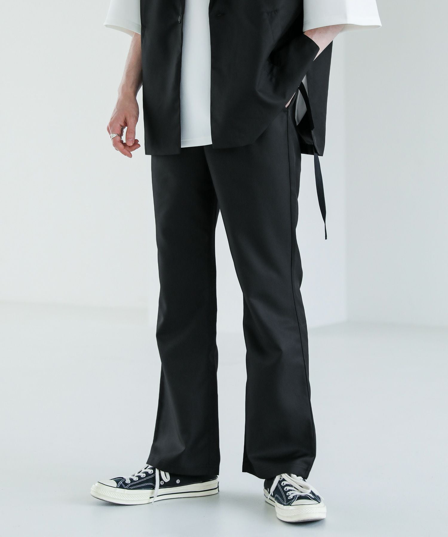 裾に向かってやや広がりを持たせたフレアパンツ。ジャストレングスのスッキリとしたシルエットでスタイルアップの叶うアイテムです。ウエストがゴム&紐で調節できるイージー仕様になっており、キレイめな見た目ながら楽な穿き心地なのもポイント。スニーカーやローダーなどの革靴、またサンダルとも合わせやすい丈感で合わせるシューズを選ばす着用していただけます。