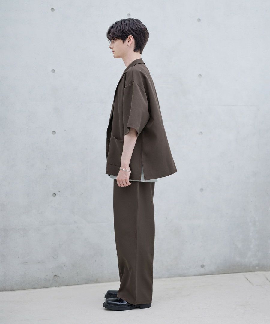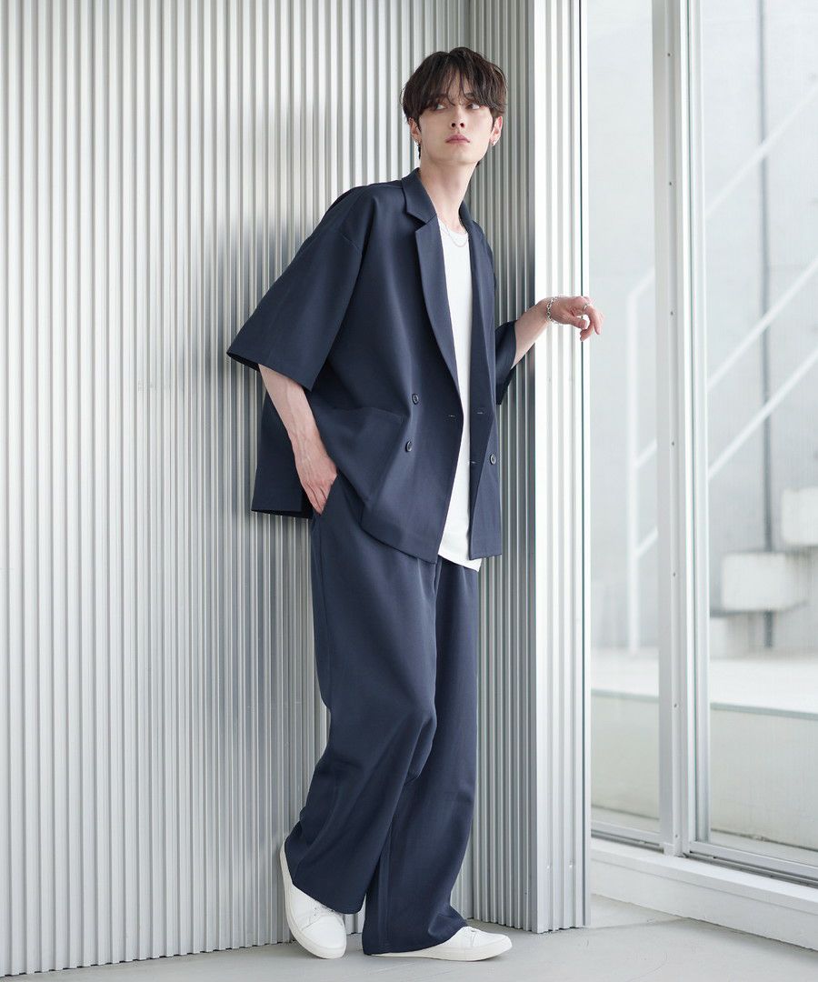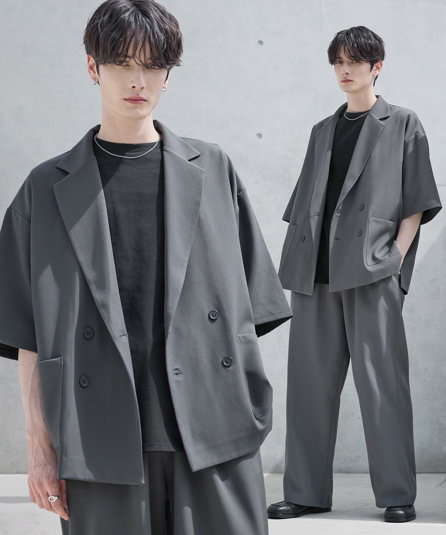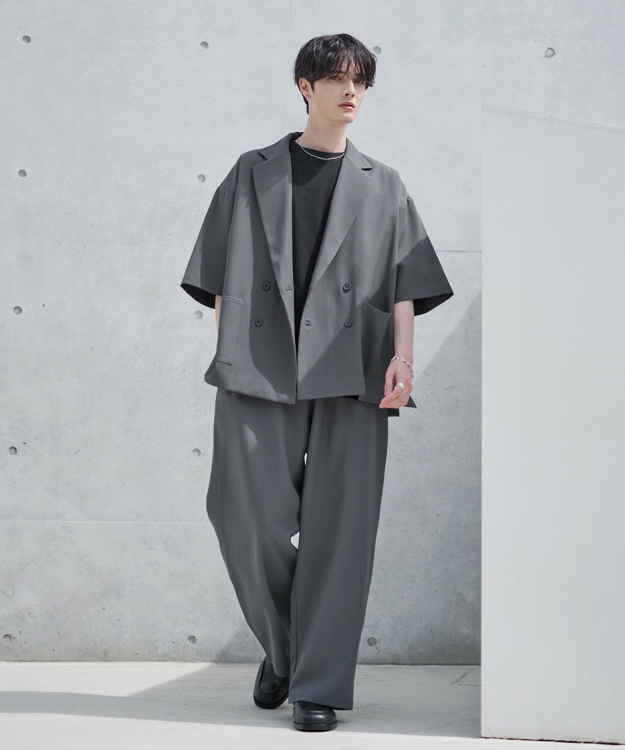 【セットアップ 2点セット】ダブルテーラード半袖シャツ+ワイドバギーイージーパンツ