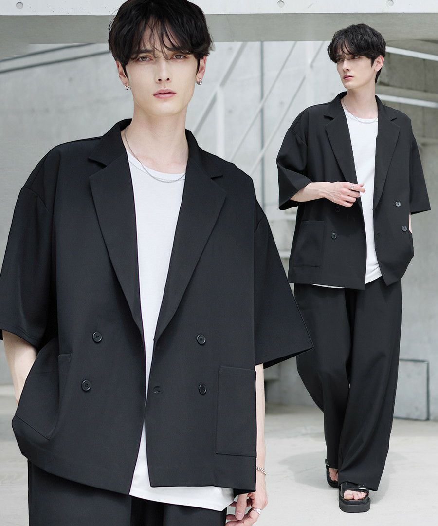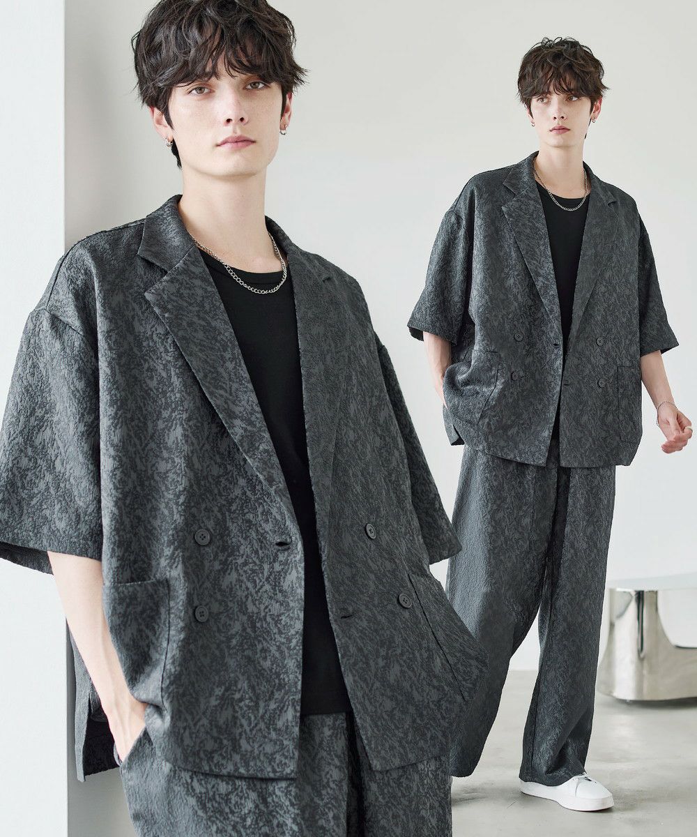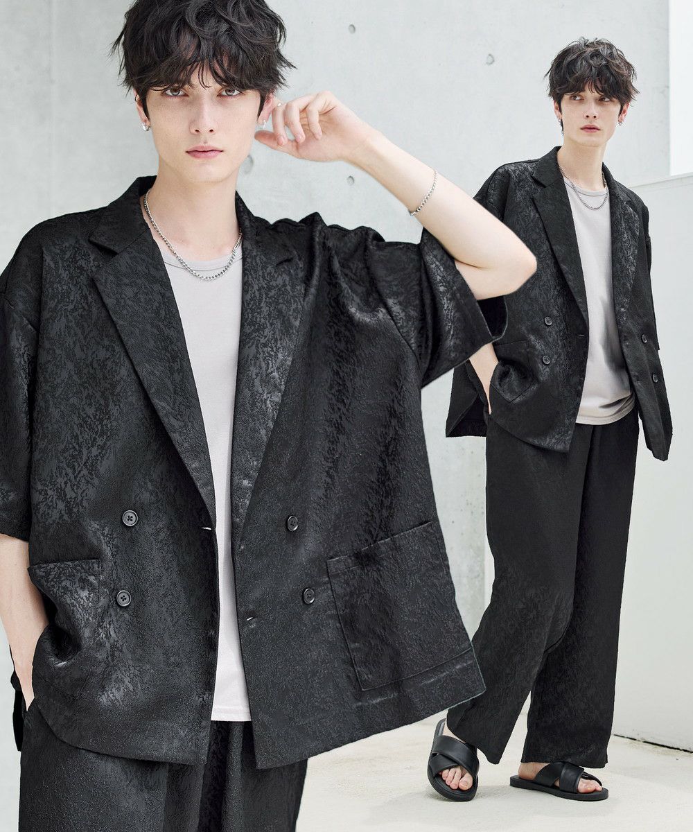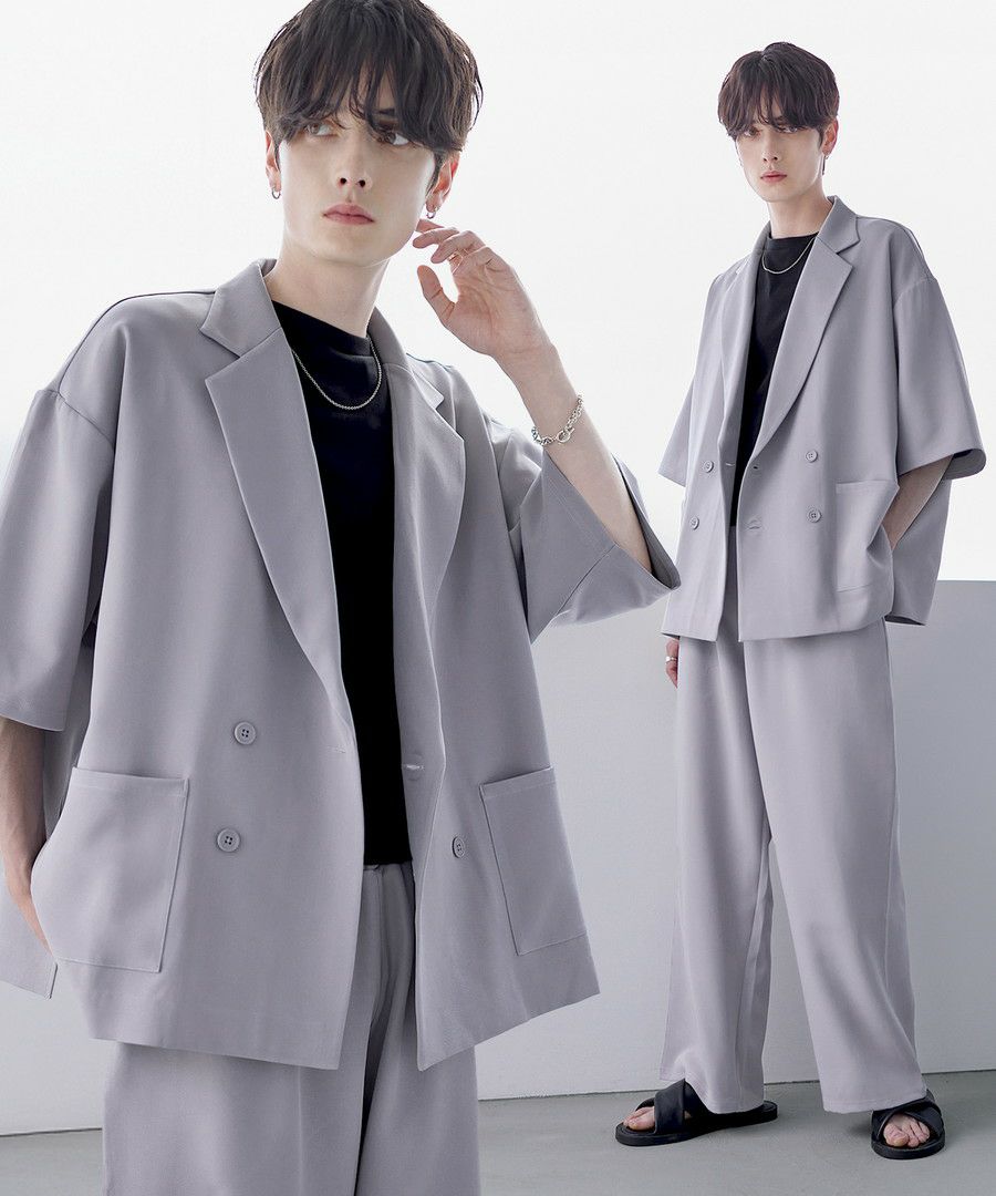 【セットアップ 2点セット】ダブルテーラード半袖シャツ+ワイドバギーイージーパンツ