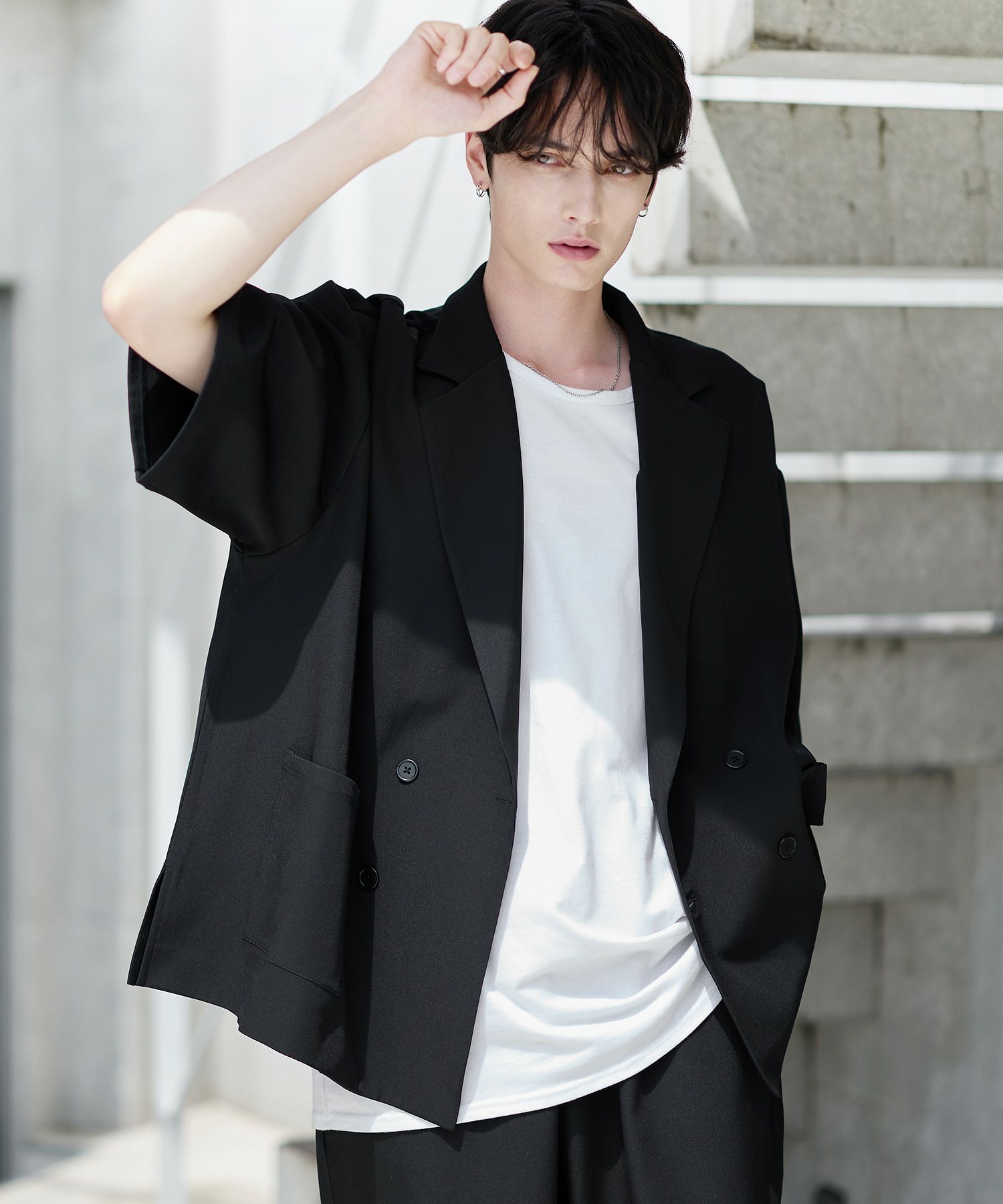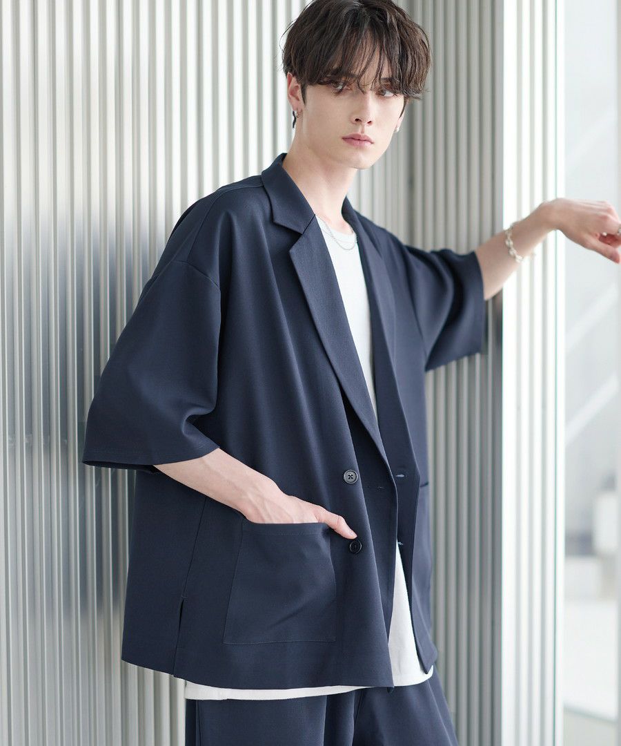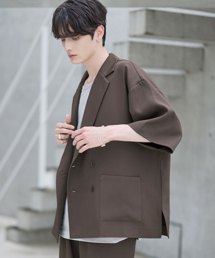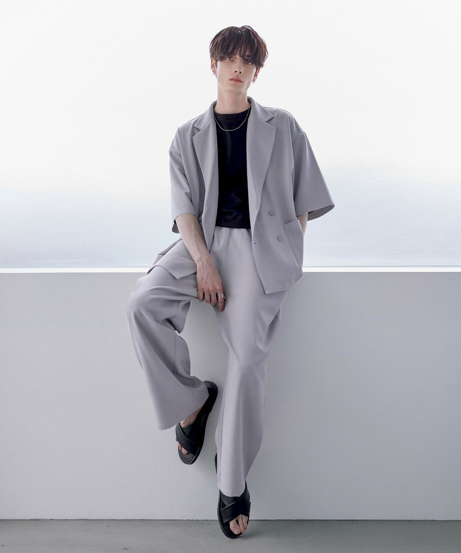 半袖のダブルテーラードシャツとワイドバギーパンツの2点がセットになった、春夏用セットアップ。リラックス感のあるサイジンングが今っぽく、ラフさと上品さを兼ね備えています。セットで着用した時にベストなバランスで着こなせるように計算されたデザインながら、単品使いでも活躍するコストパフォーマンスに優れたアイテムです。