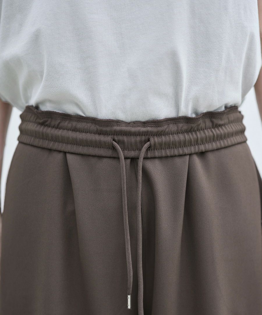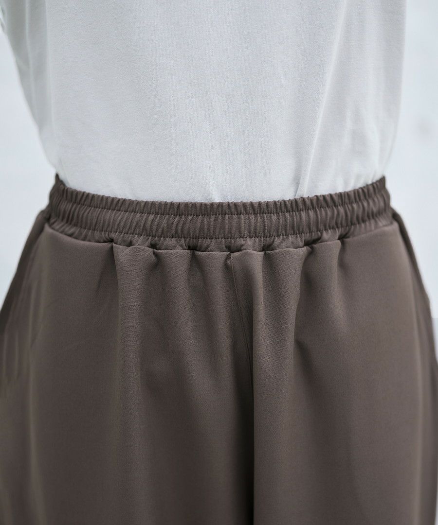落ち感のあるワイドバギーシルエットパンツ。太め&ストレートのストンとしたシルエットが脚を綺麗に見せてくれます。上品なルックスながら、ウエストはゴム&紐で調整可能なイージーパンツ仕様で楽に着用できるのも魅力です。