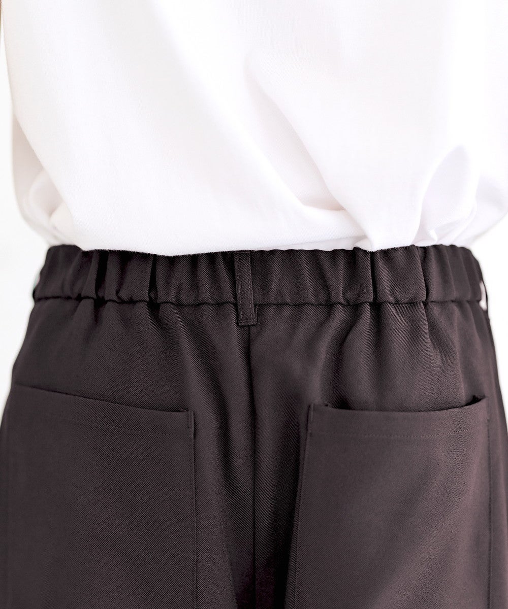 防シワ性に優れたポリエステル・ポリウレタン混紡素材を使用しており、デイリー使いに最適な生地です。軽やかでさらっとしたタッチが特徴で、長時間の着用でもストレスを感じにくい仕上がりに。ゆったりとしつつも適度なハリがあるため、シルエットをきれいに保ってくれます。