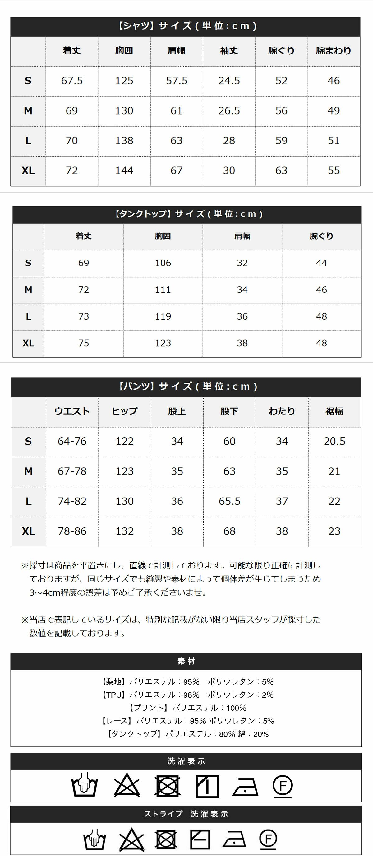 「梨地シャツ・TPUパンツ」「梨地シャツ・梨地パンツ」「柄プリントシャツ・TPUパンツ」「TPUシャツ・TPUパンツ」「レースシャツ・TPUパンツ」の5パターンの組み合わせで計14の豊富なバリエーション展開も魅力。