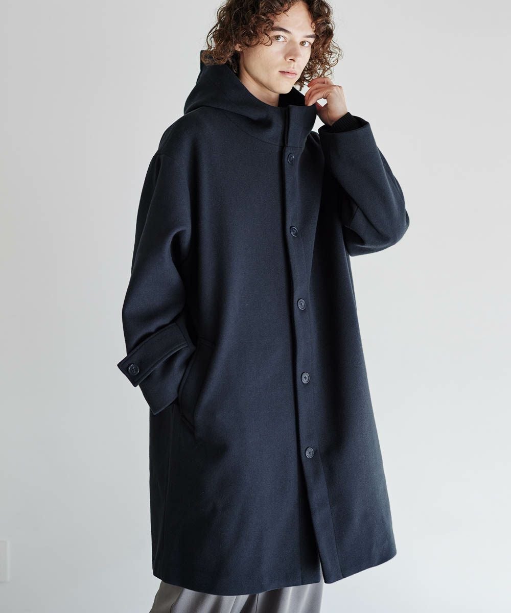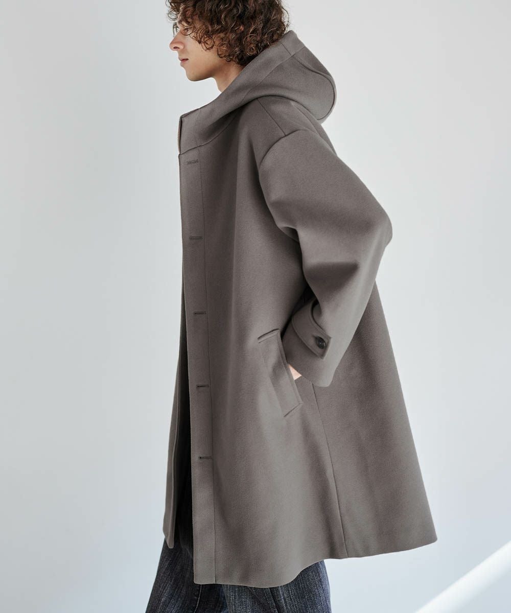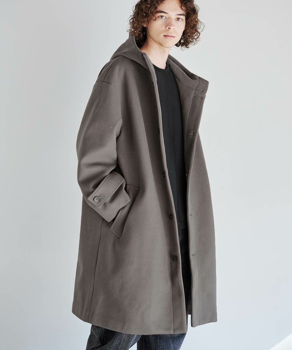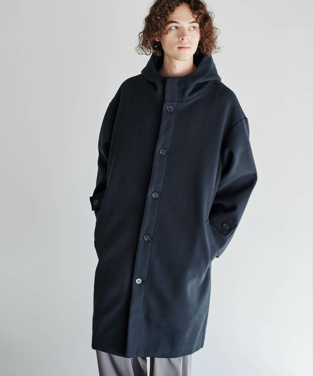 メルトン生地で仕立てた、キレイめカジュアルに着回しが楽しめるフーデッドコート。