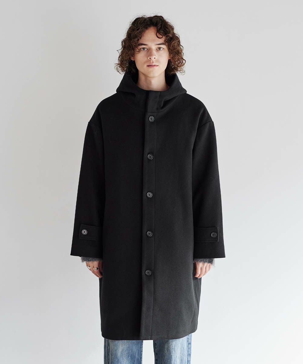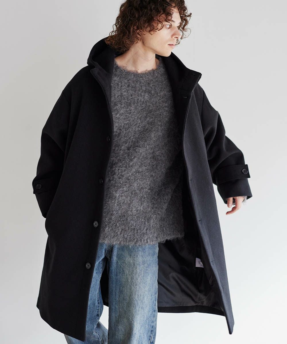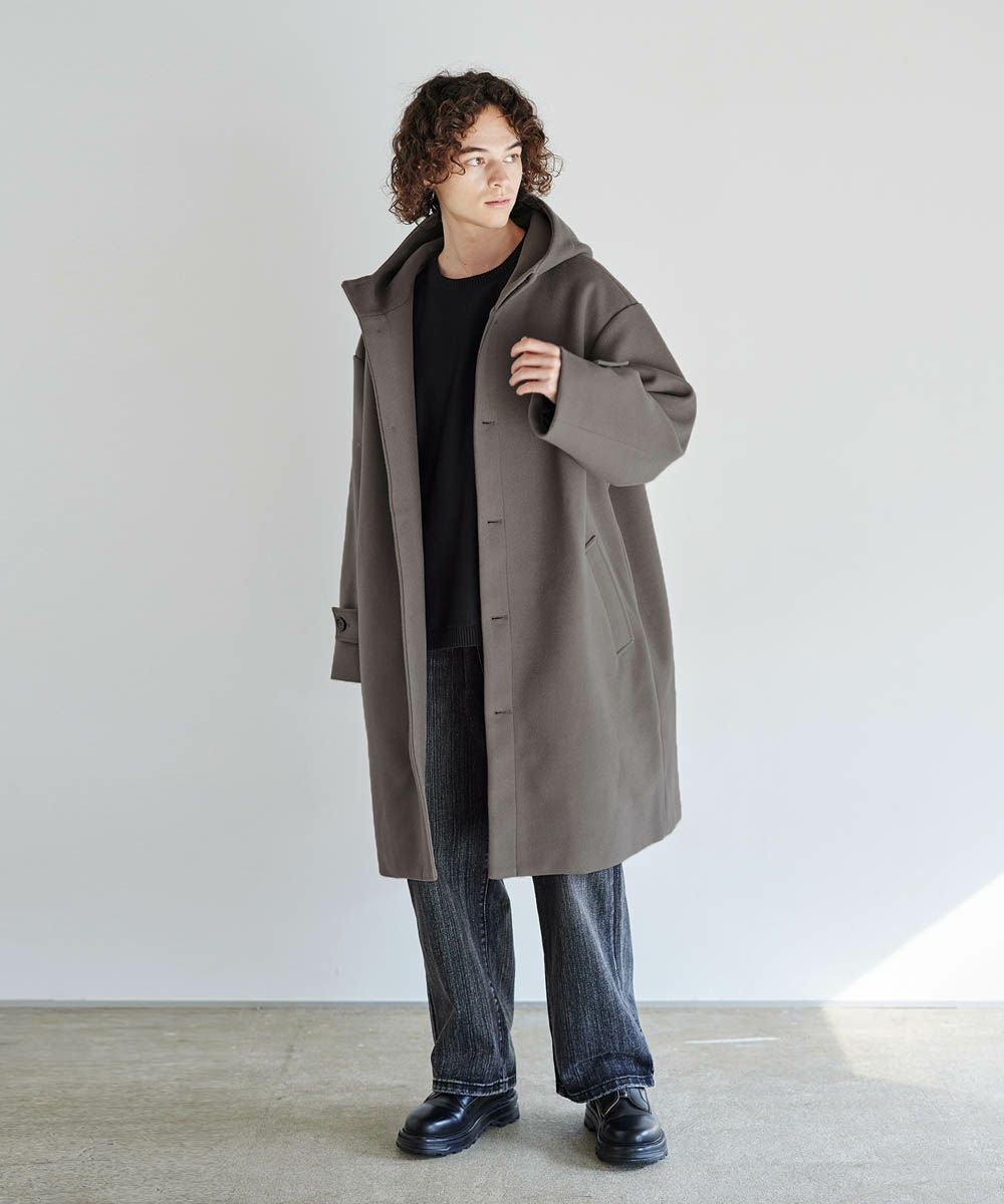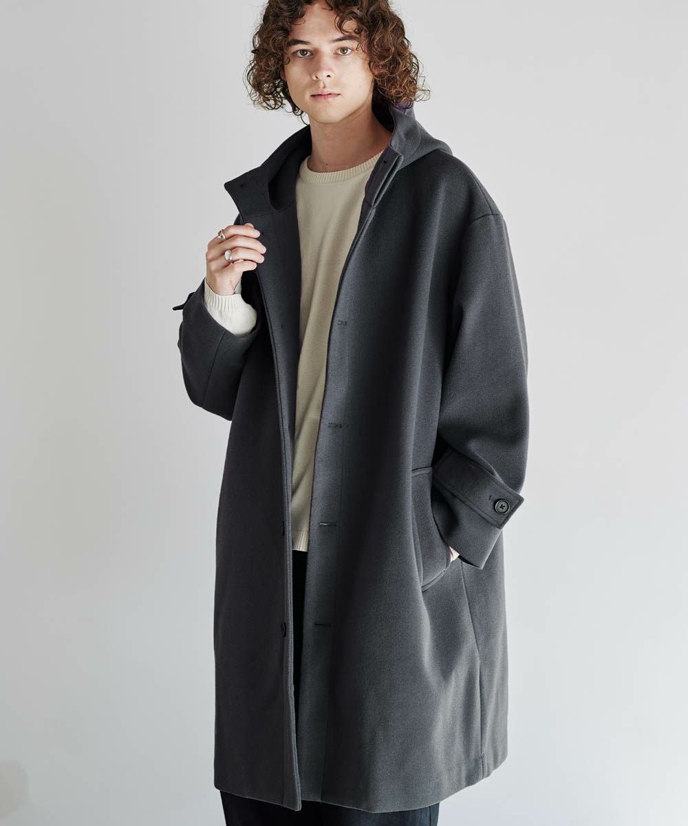 メルトン生地で仕立てた、キレイめカジュアルに着回しが楽しめるフーデッドコート。