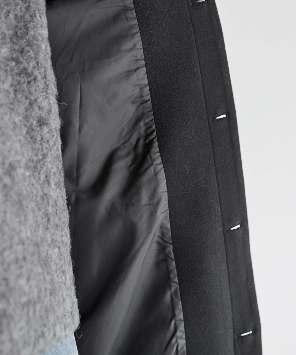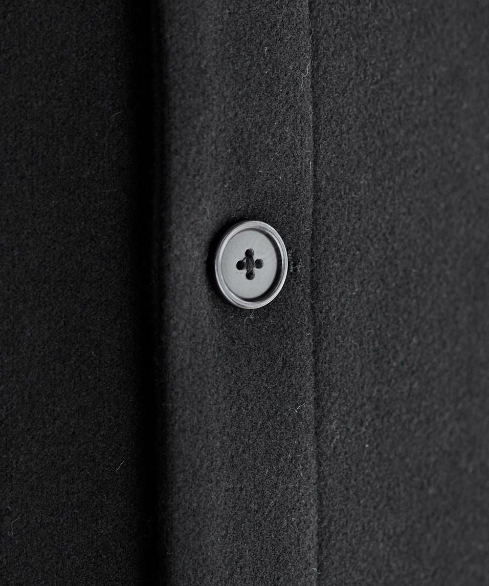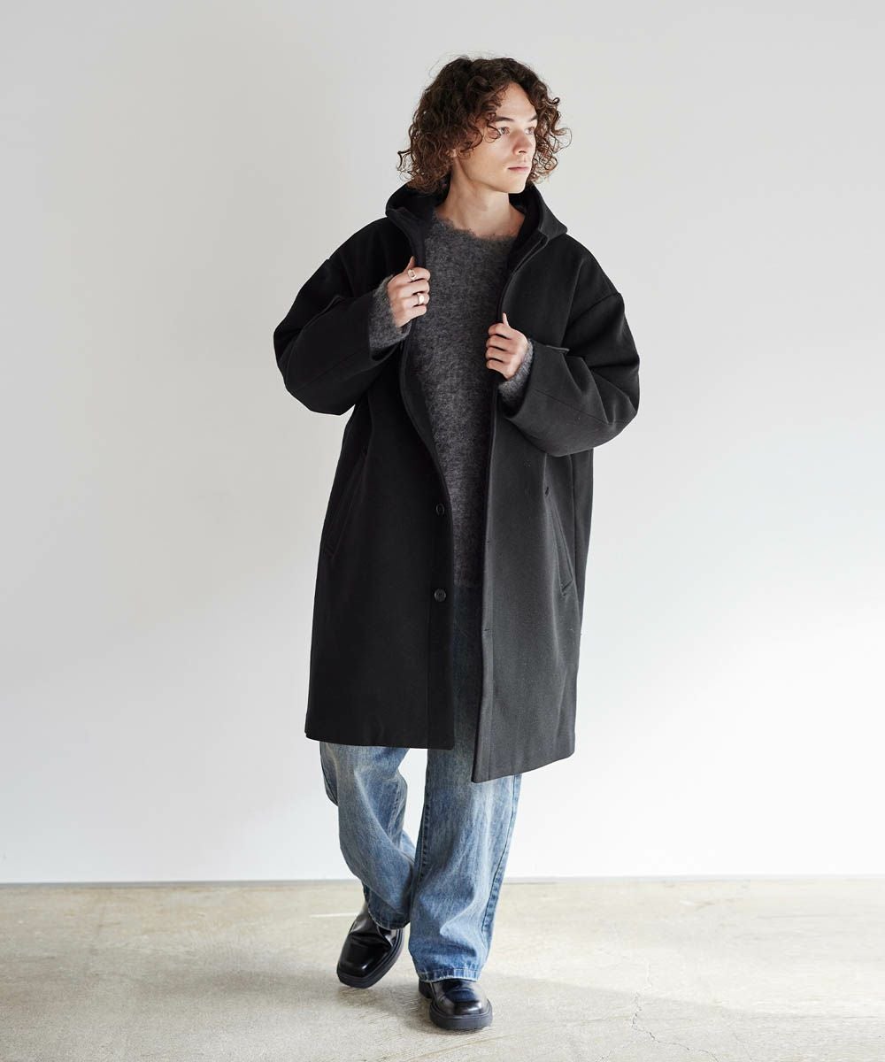 上品なメルトン生地のコートに、フードを付けて程よい抜け感をプラスしました。首元のスナップボタンを留めるとスタンドネックになり、暖かく着用いただけます。