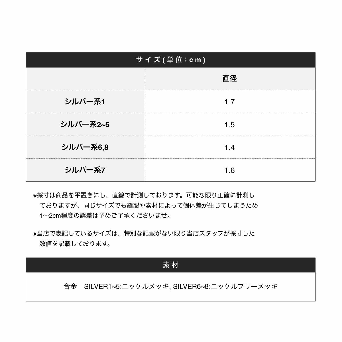 合金 シルバー系1~5:ニッケルメッキ, シルバー系6~8:ニッケルフリーメッキ