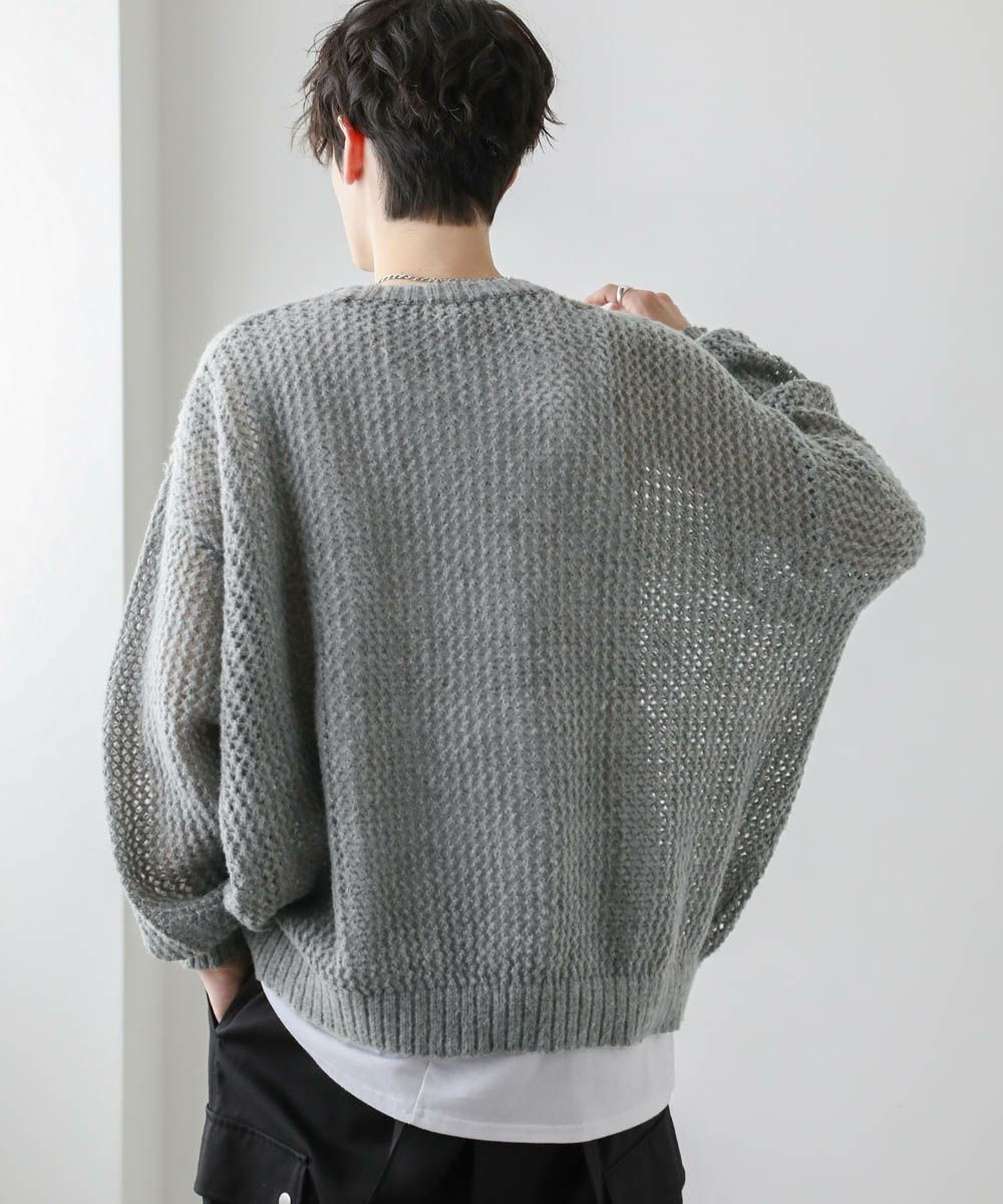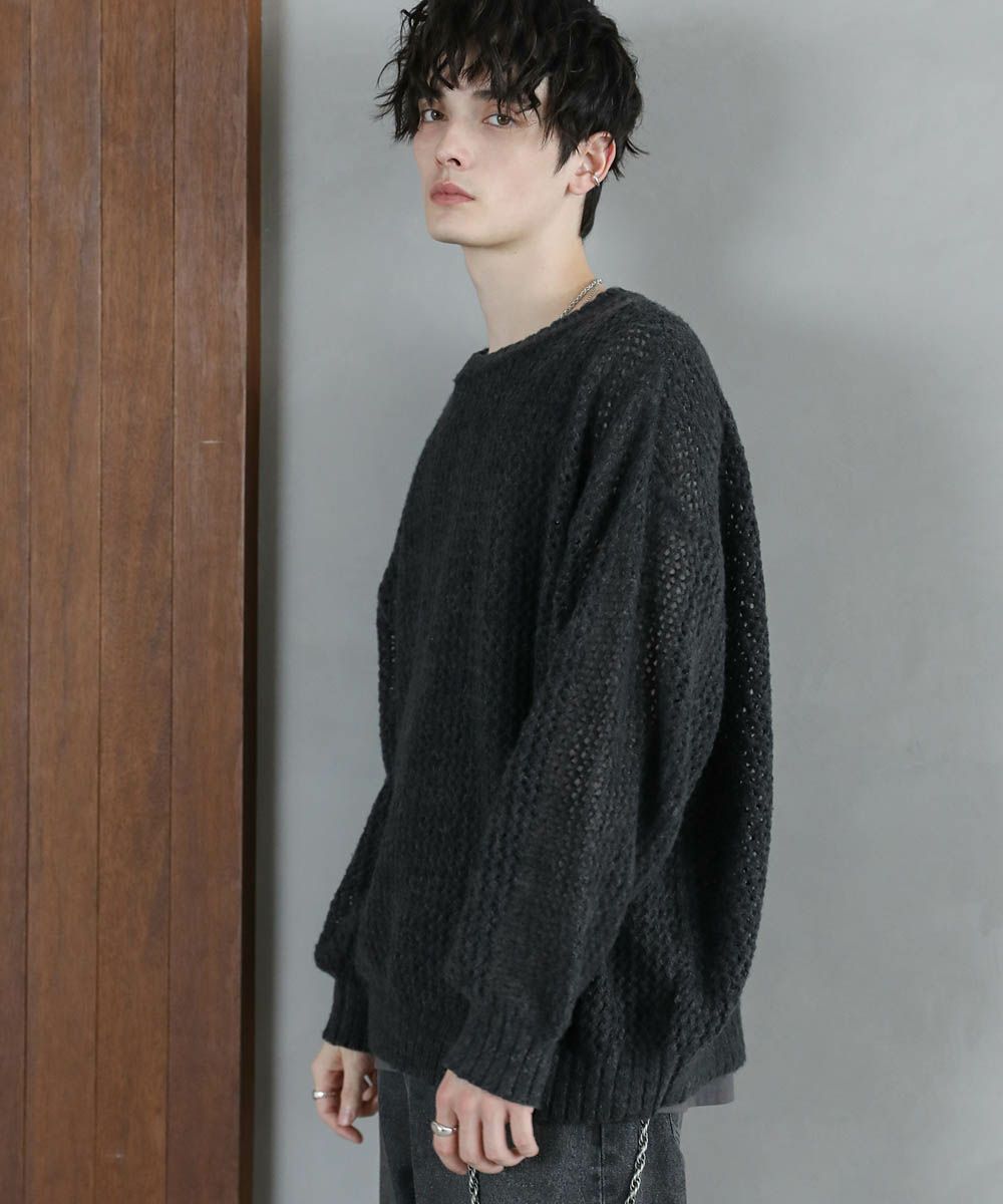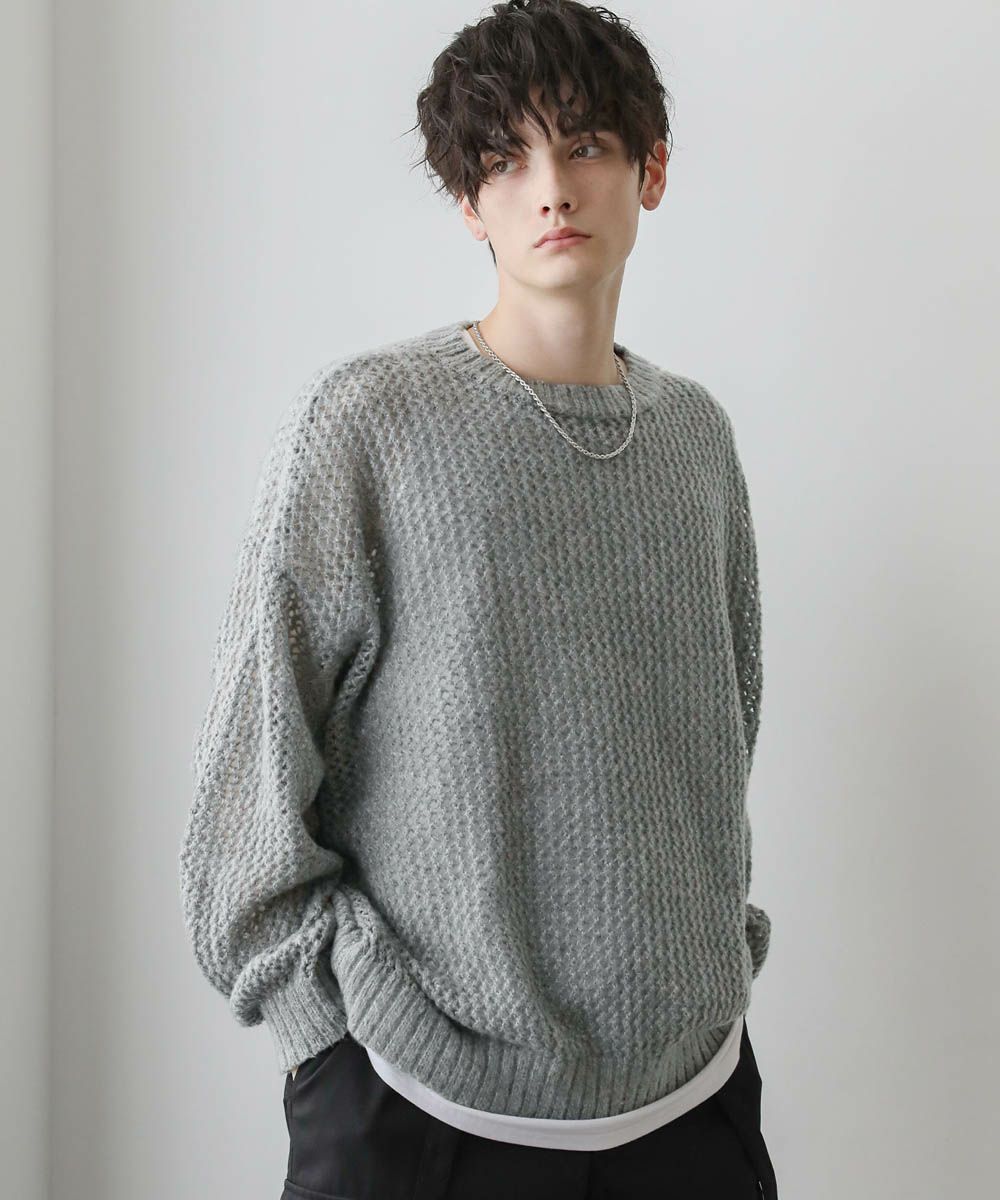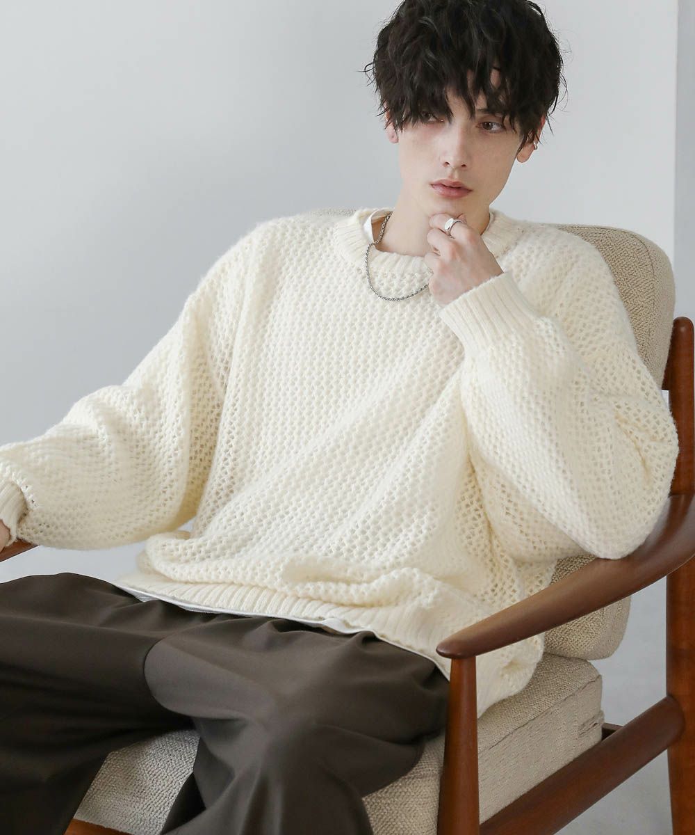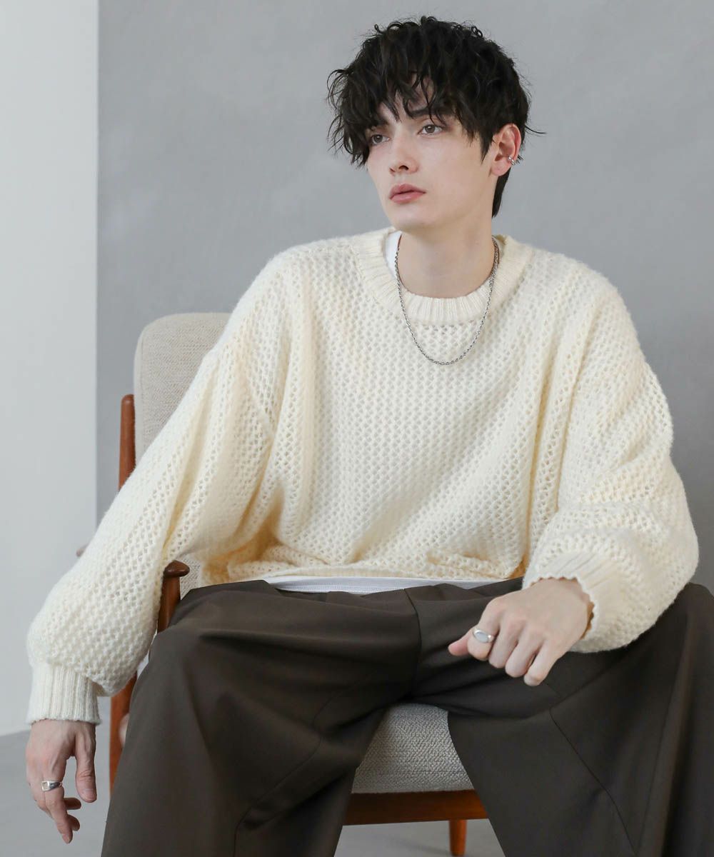 1枚でトレンドの着こなしを作る、透かし編みニットが登場。ざっくりとした編み地で、インナーとのレイヤードを楽しめる1着です。ゆとりのあるルーズシルエットにドロップショルダー、丸みのある溜まり袖がアクセントに。起毛感のあるモヘアタッチのニットは、秋冬らしい温かみのある雰囲気をプラスしてくれます。
