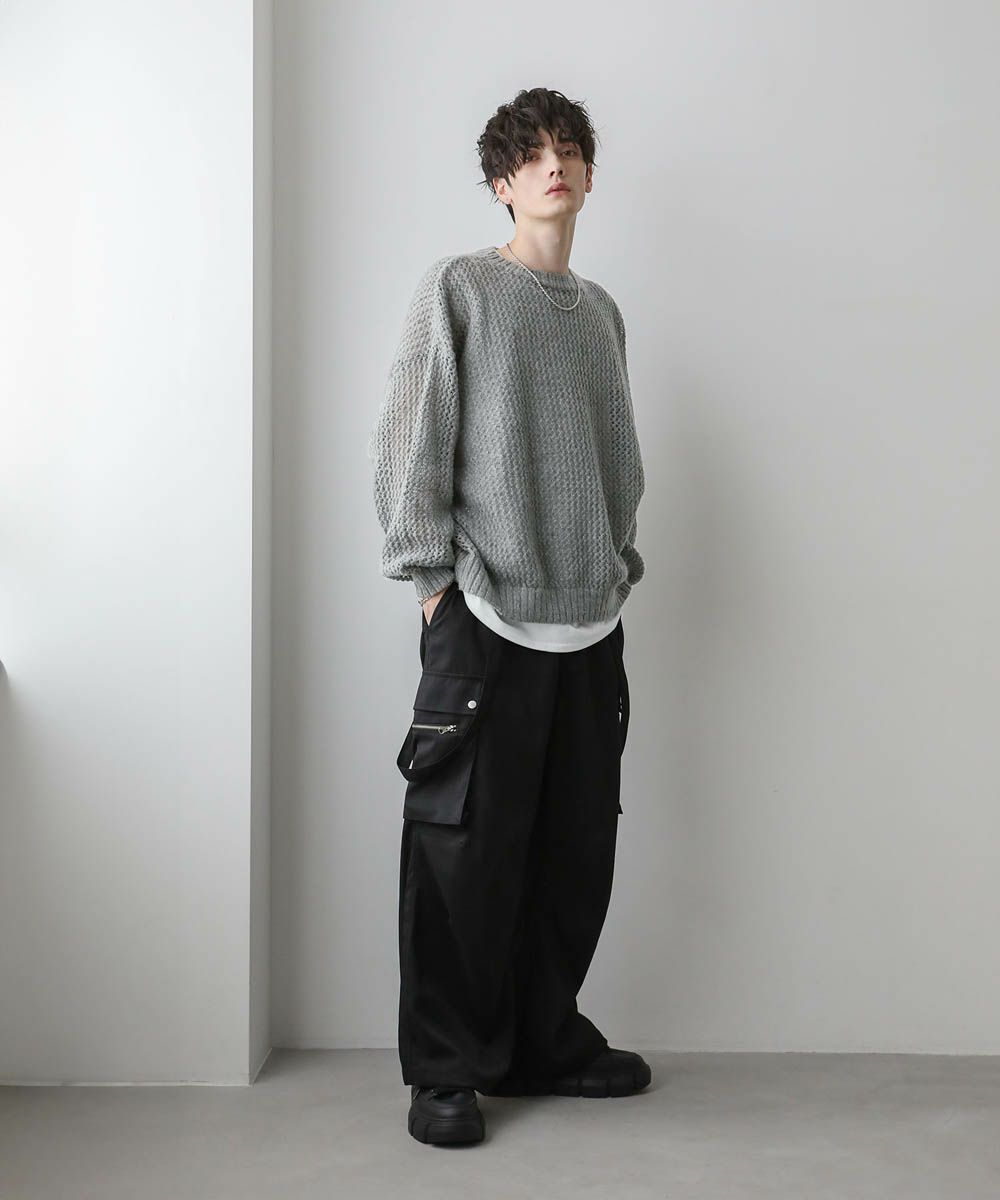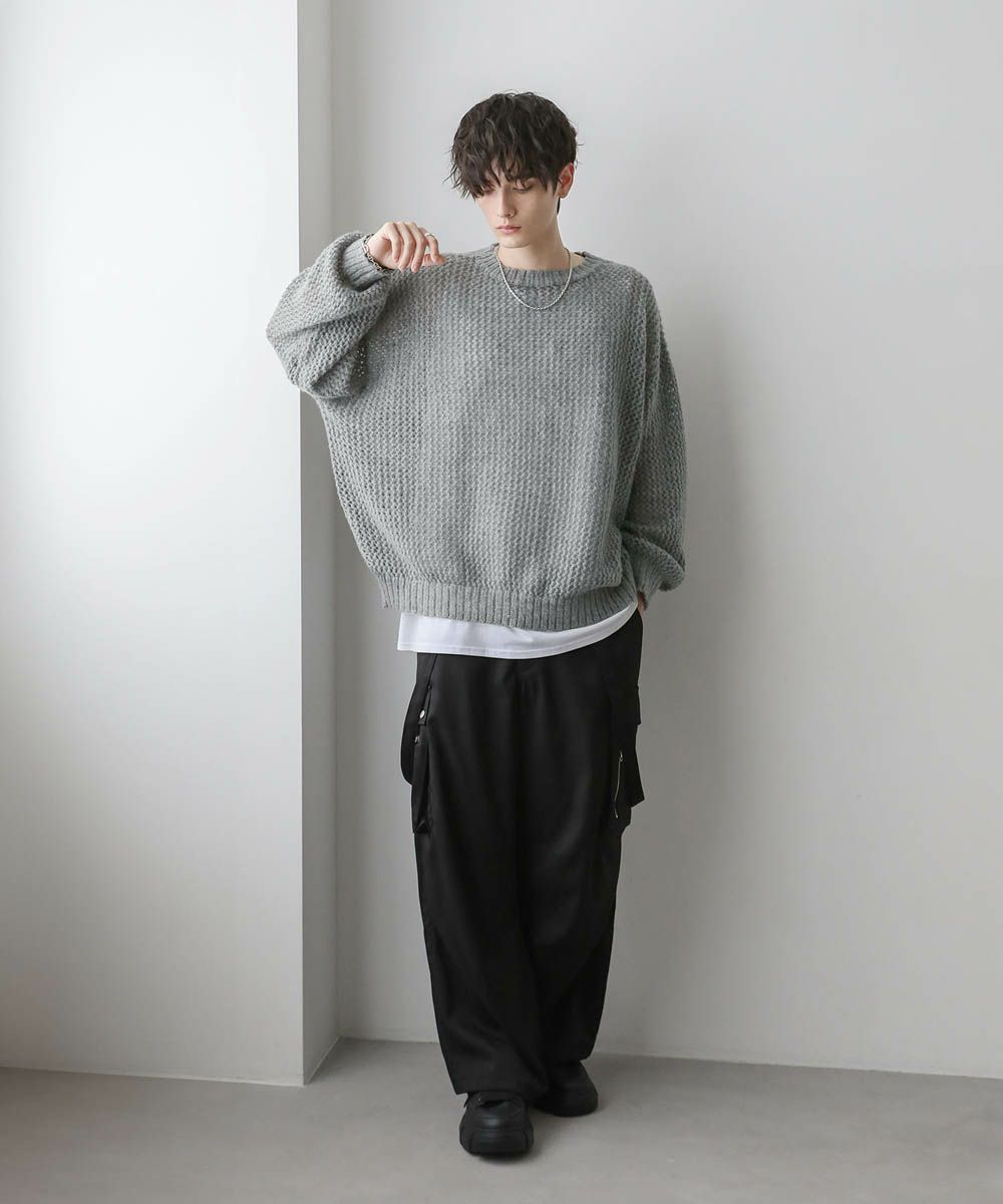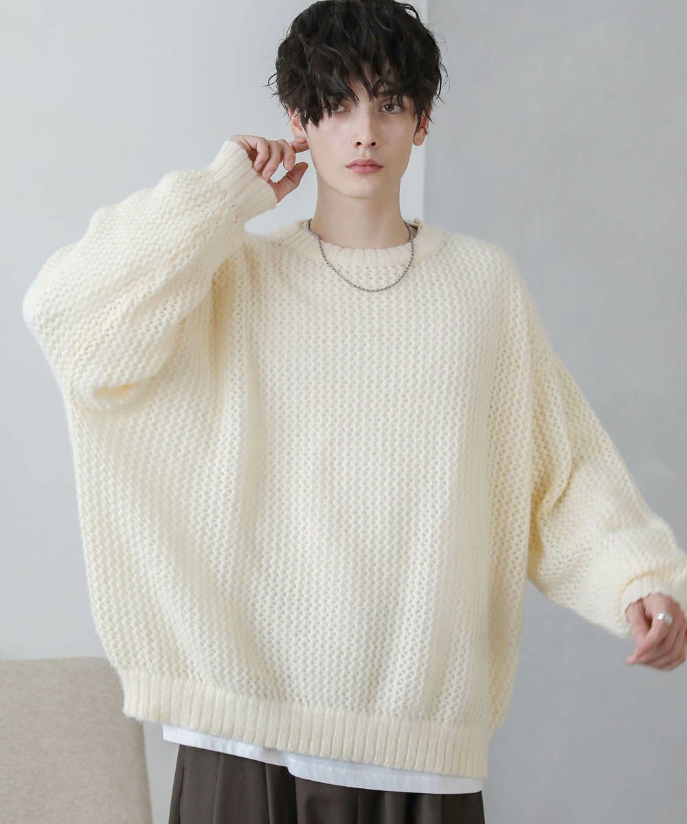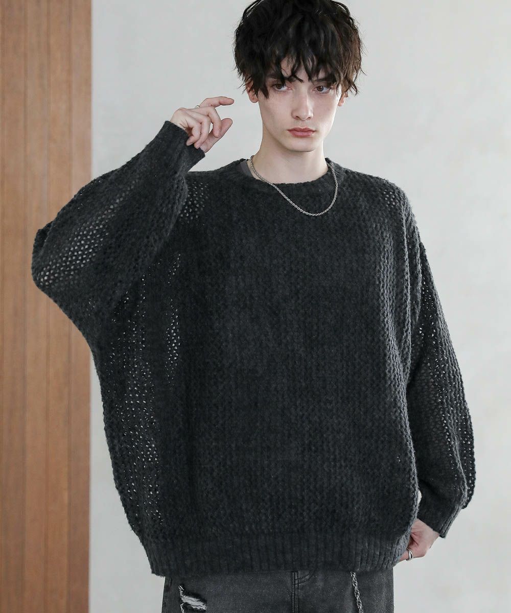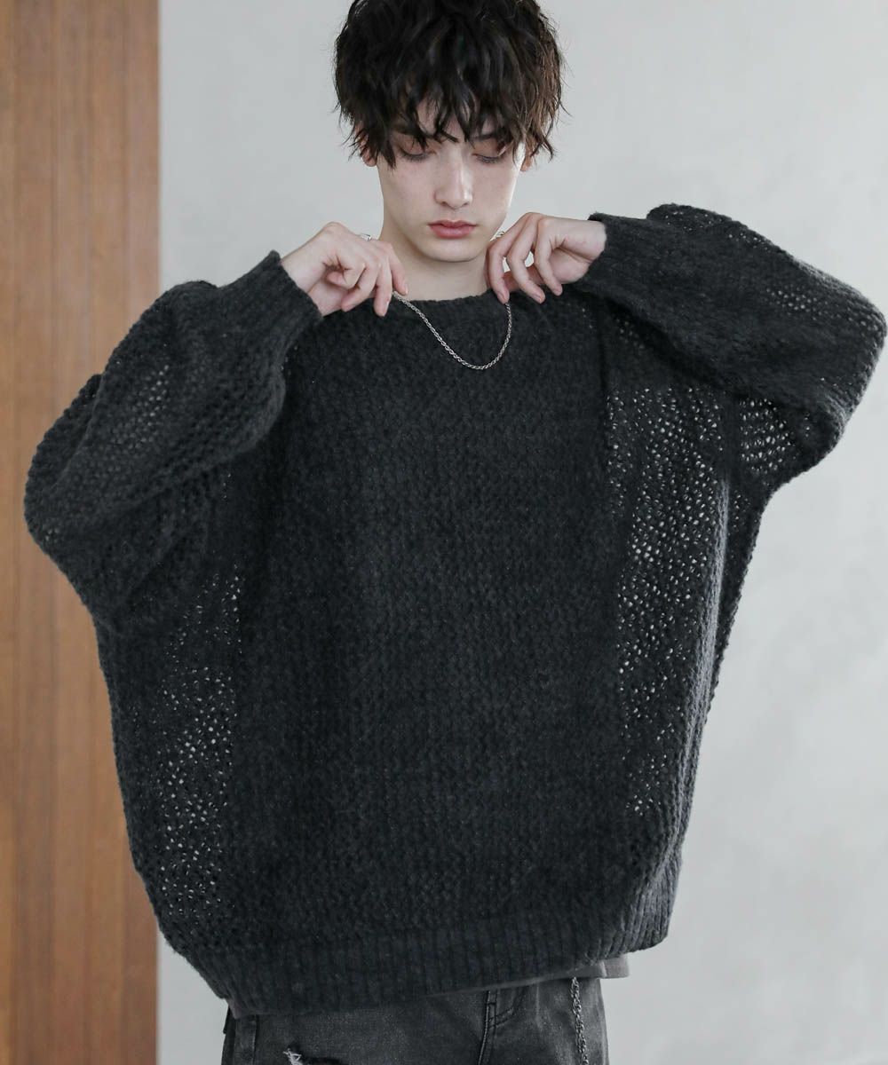 1枚でトレンドの着こなしを作る、透かし編みニットが登場。ざっくりとした編み地で、インナーとのレイヤードを楽しめる1着です。ゆとりのあるルーズシルエットにドロップショルダー、丸みのある溜まり袖がアクセントに。起毛感のあるモヘアタッチのニットは、秋冬らしい温かみのある雰囲気をプラスしてくれます。