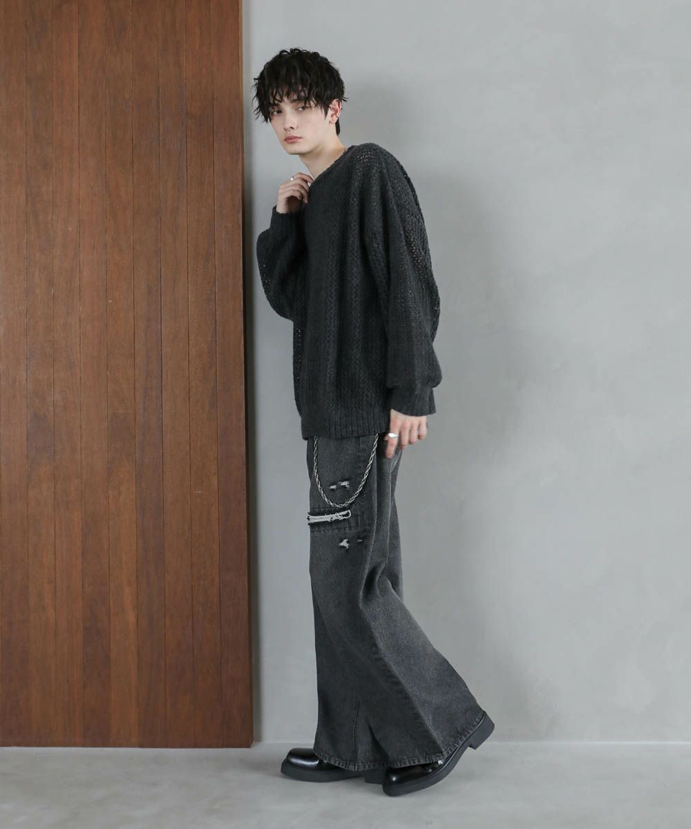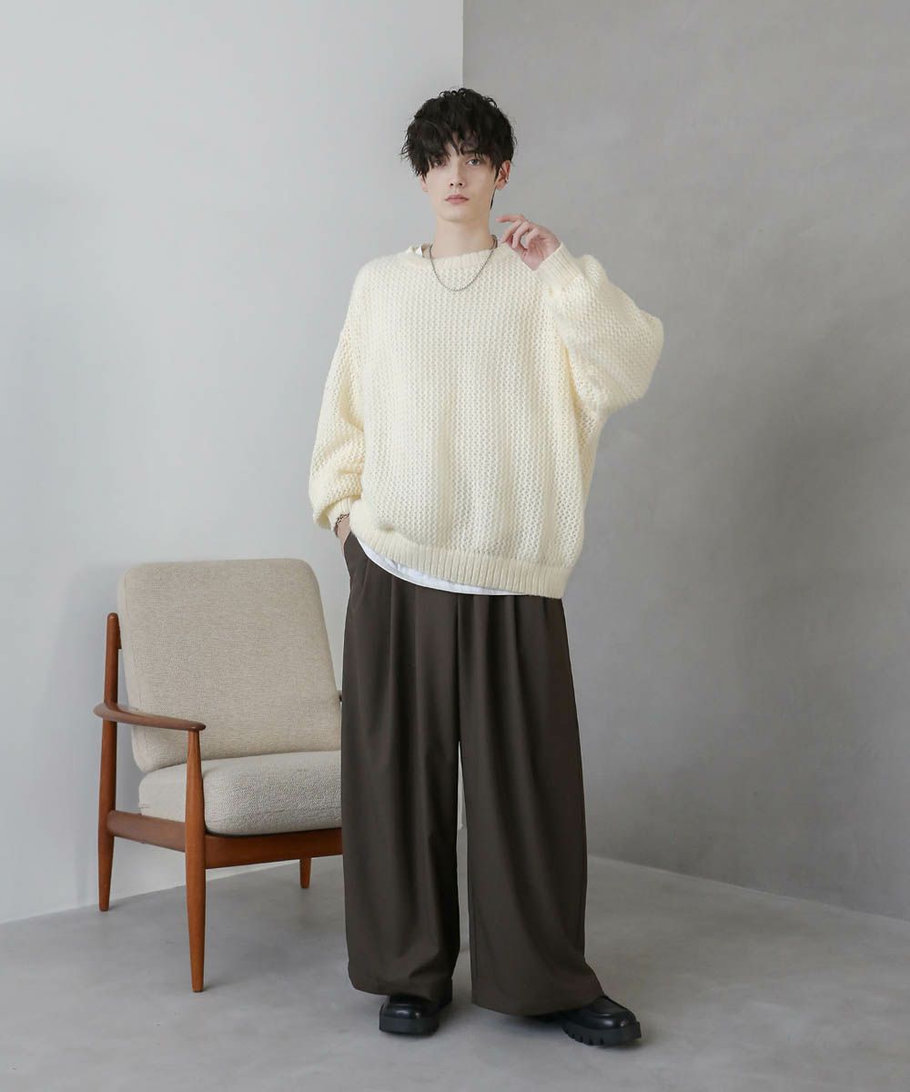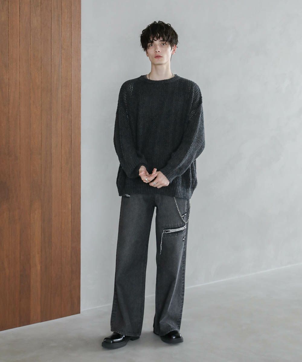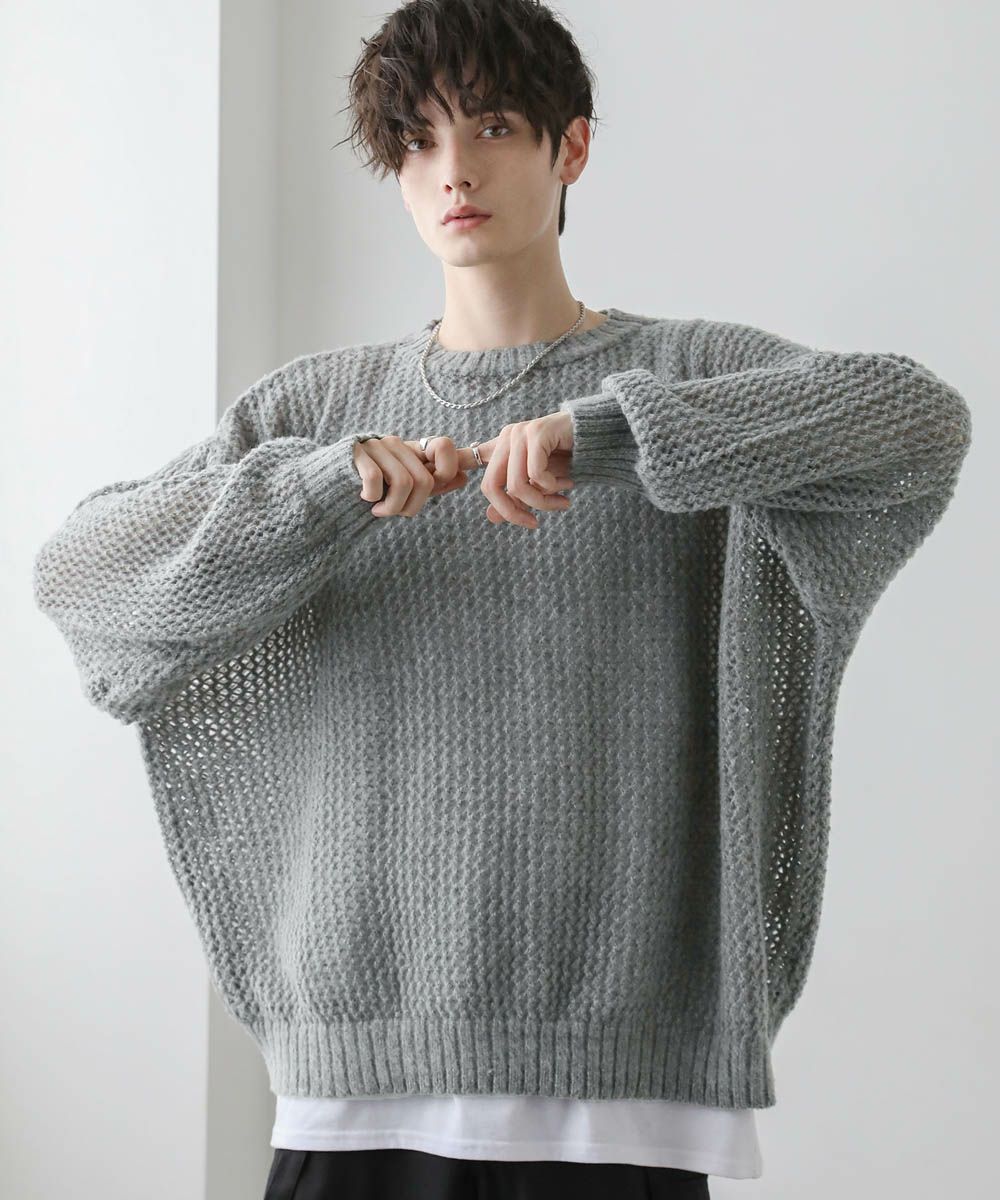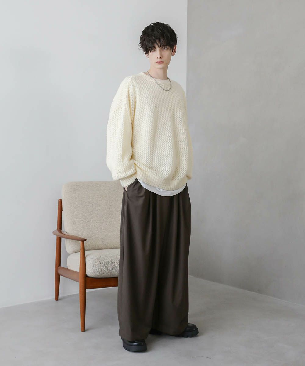 1枚でトレンドの着こなしを作る、透かし編みニットが登場。ざっくりとした編み地で、インナーとのレイヤードを楽しめる1着です。ゆとりのあるルーズシルエットにドロップショルダー、丸みのある溜まり袖がアクセントに。起毛感のあるモヘアタッチのニットは、秋冬らしい温かみのある雰囲気をプラスしてくれます。