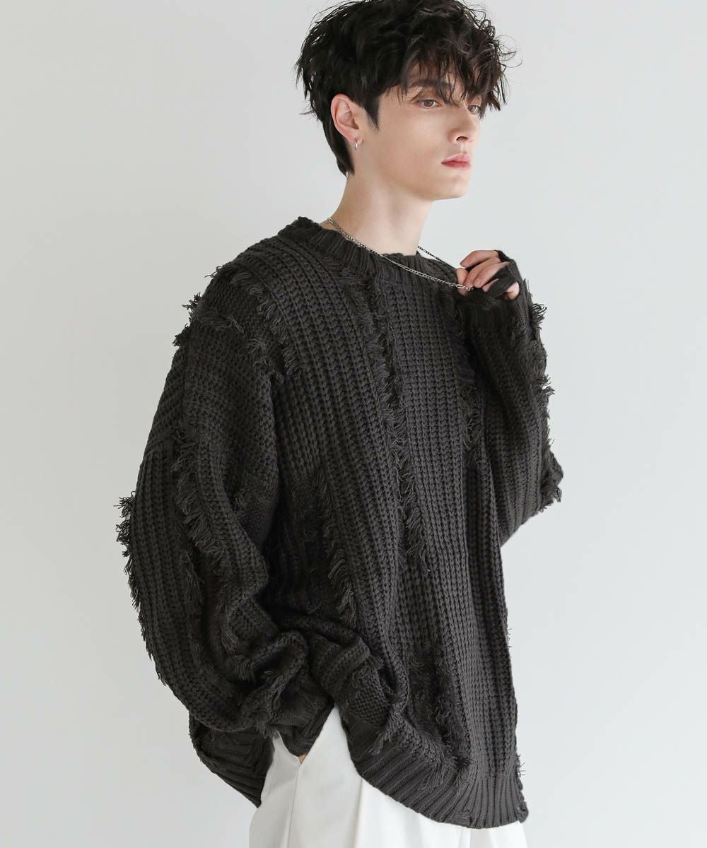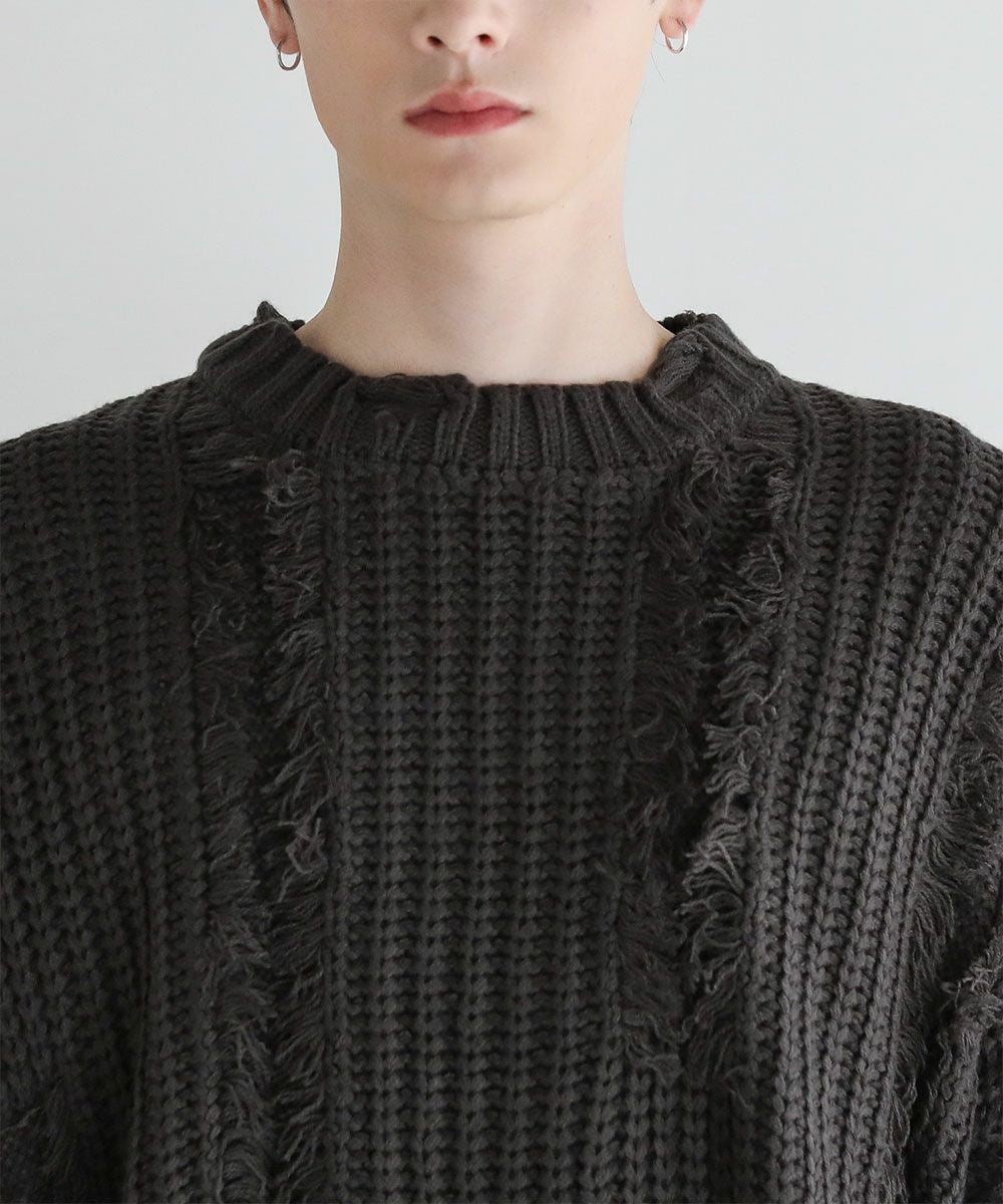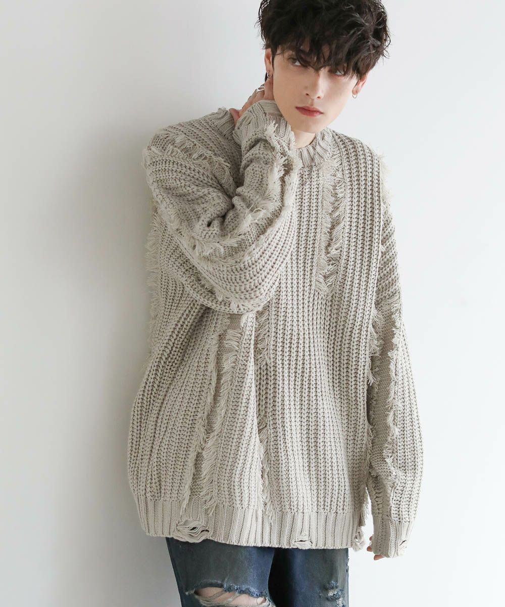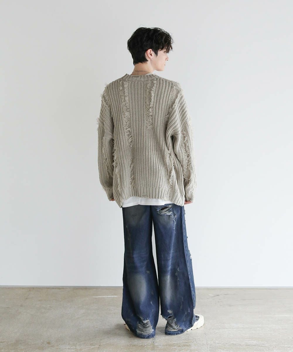ビッグシルエットダメージフリンジケーブルニット