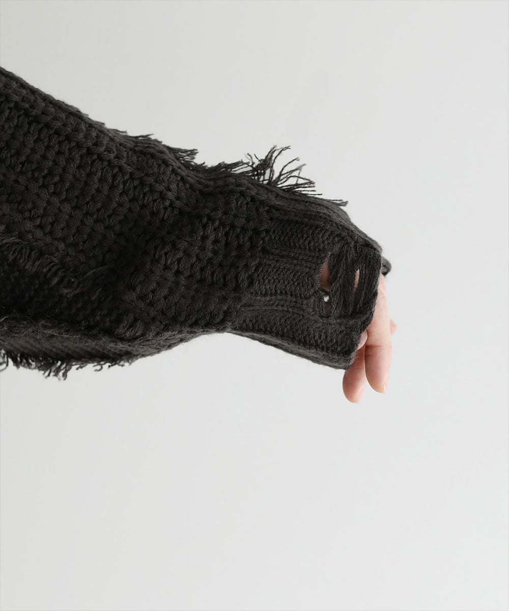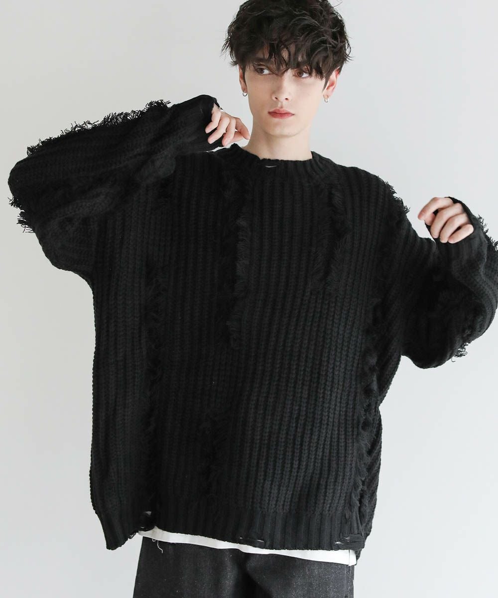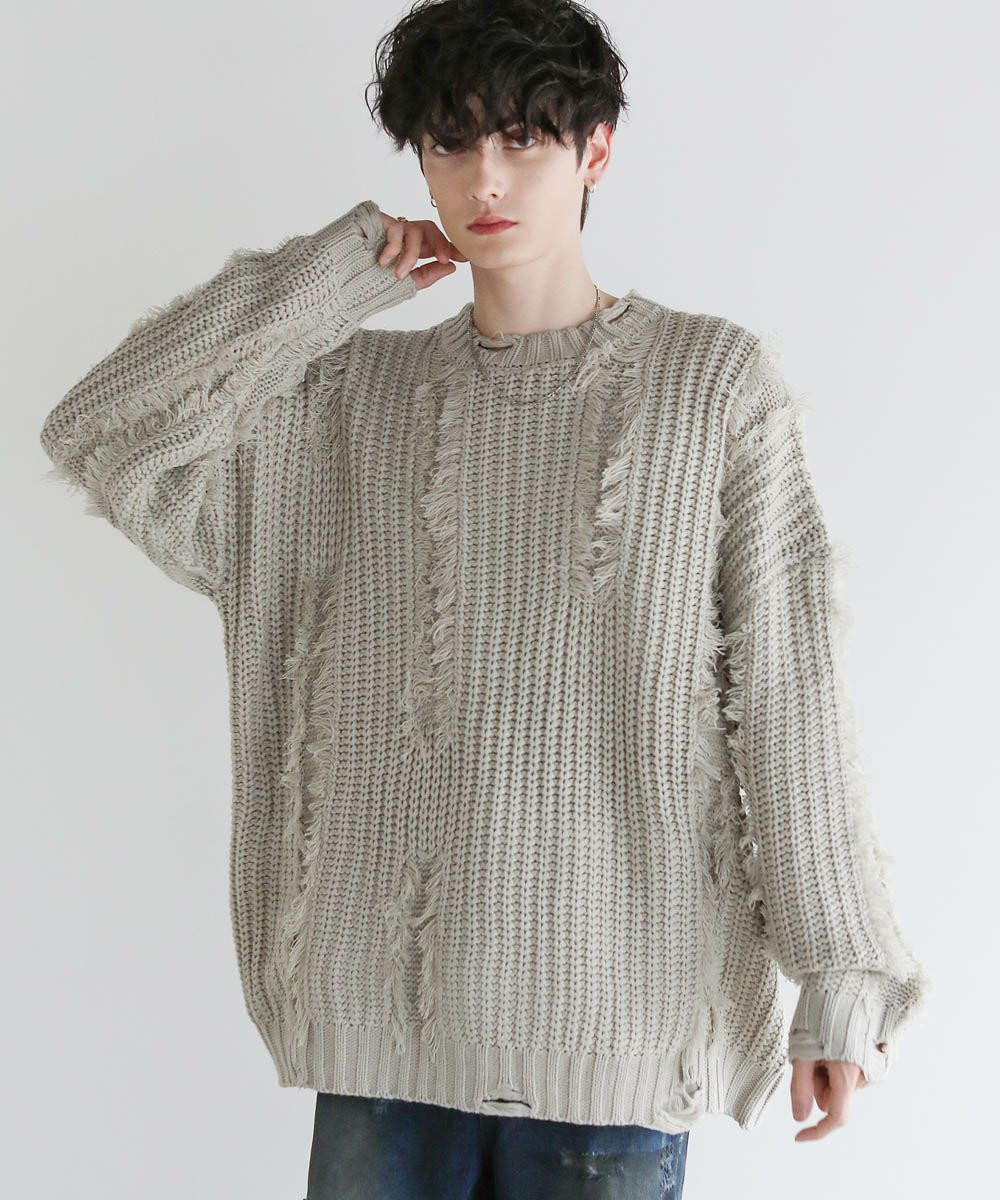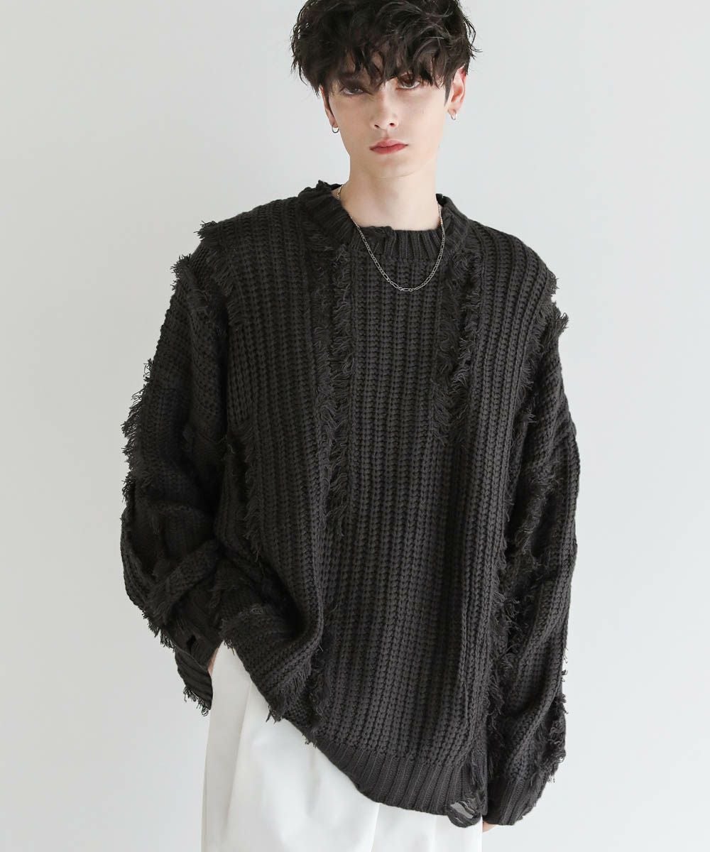 ビッグシルエットダメージフリンジケーブルニット