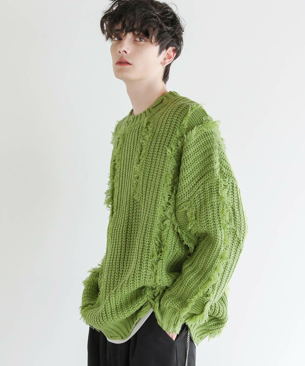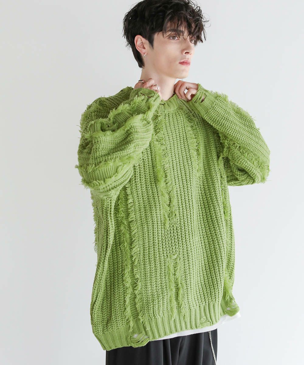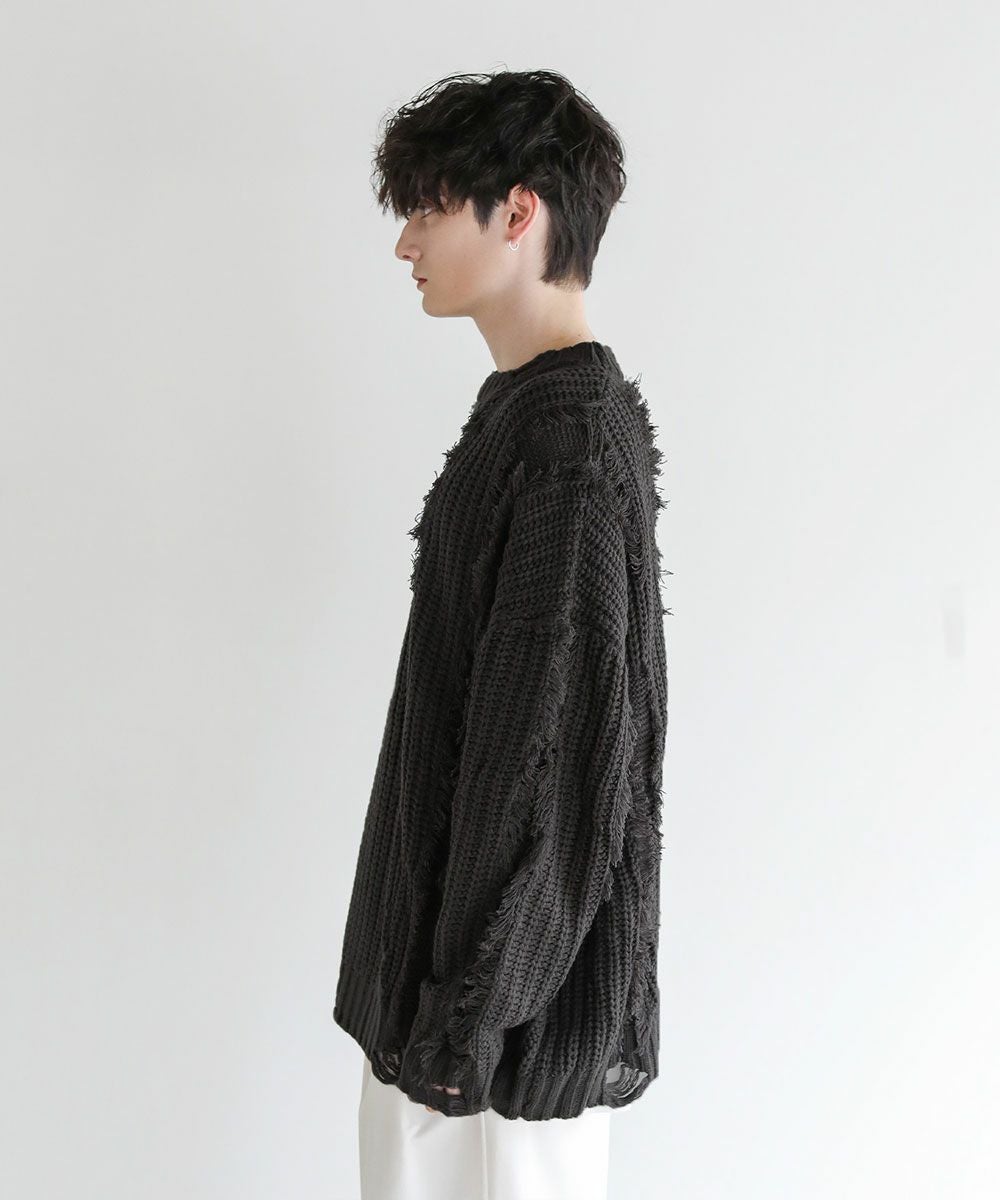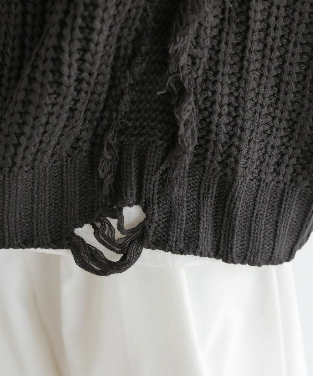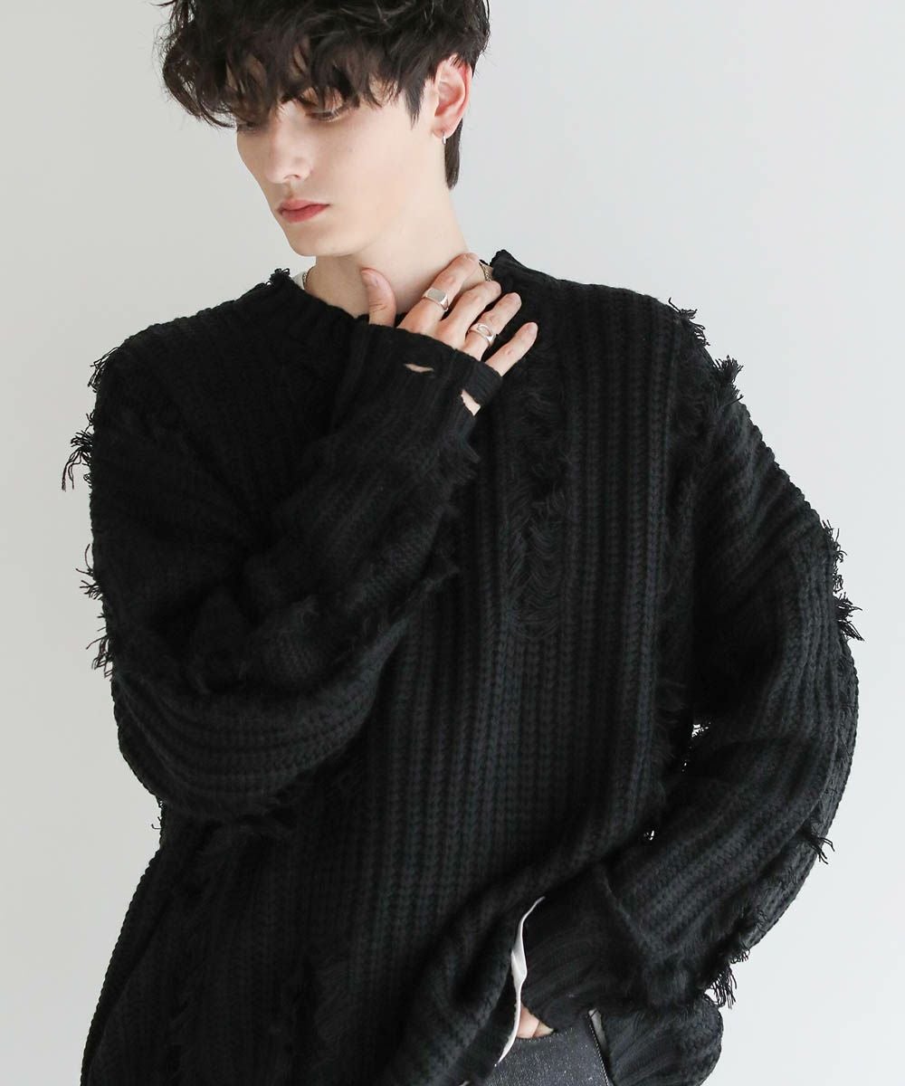 ビッグシルエットダメージフリンジケーブルニット