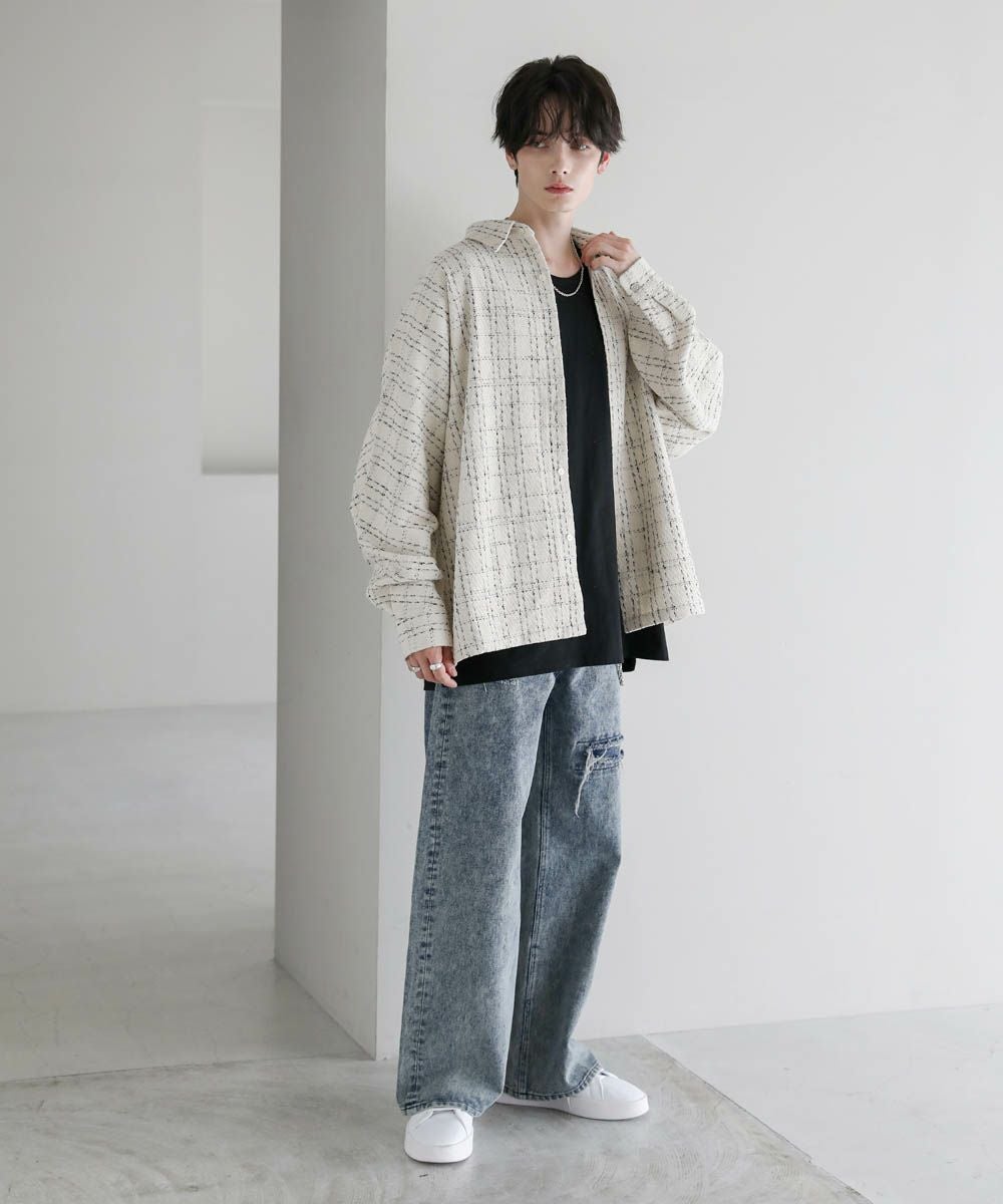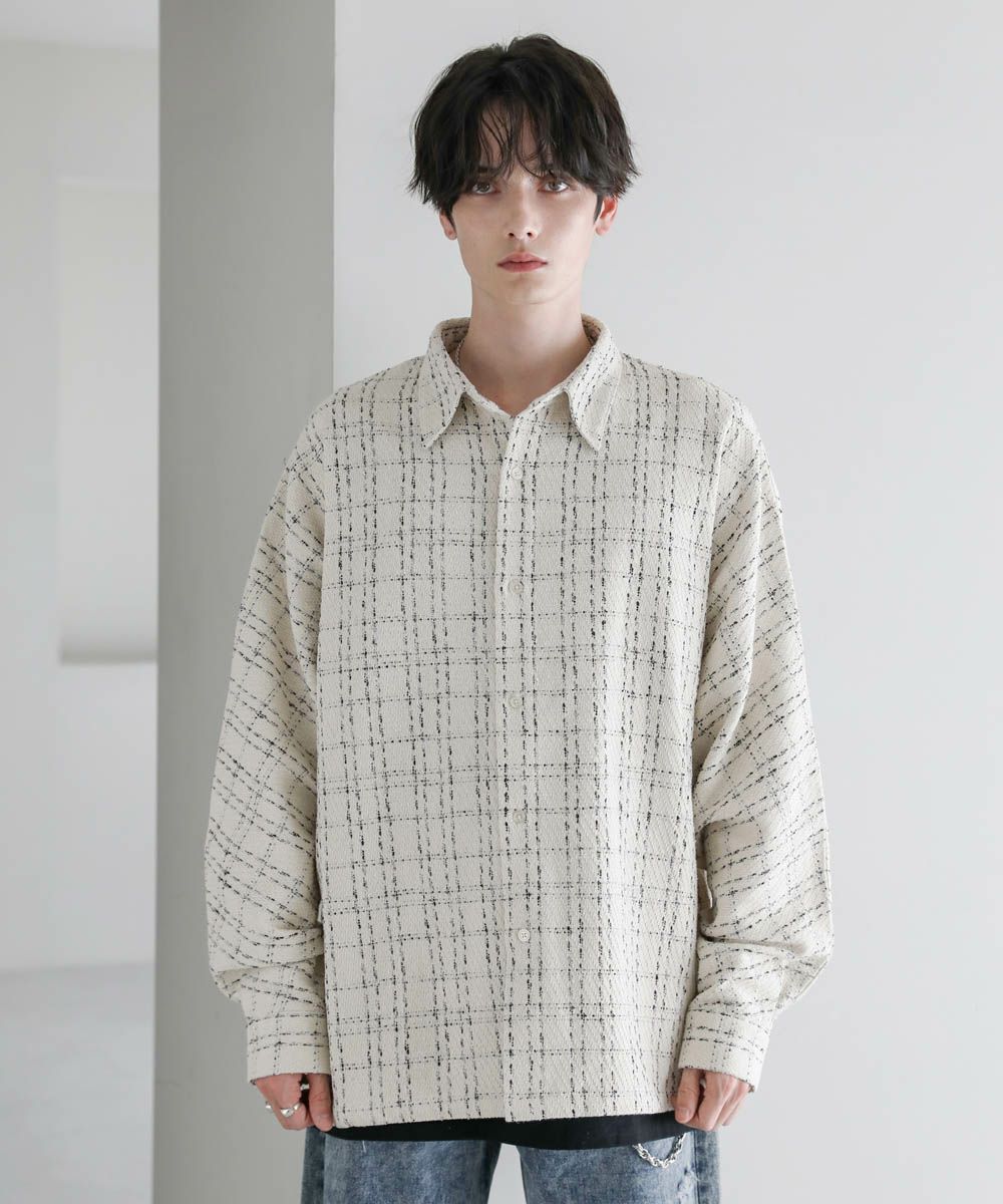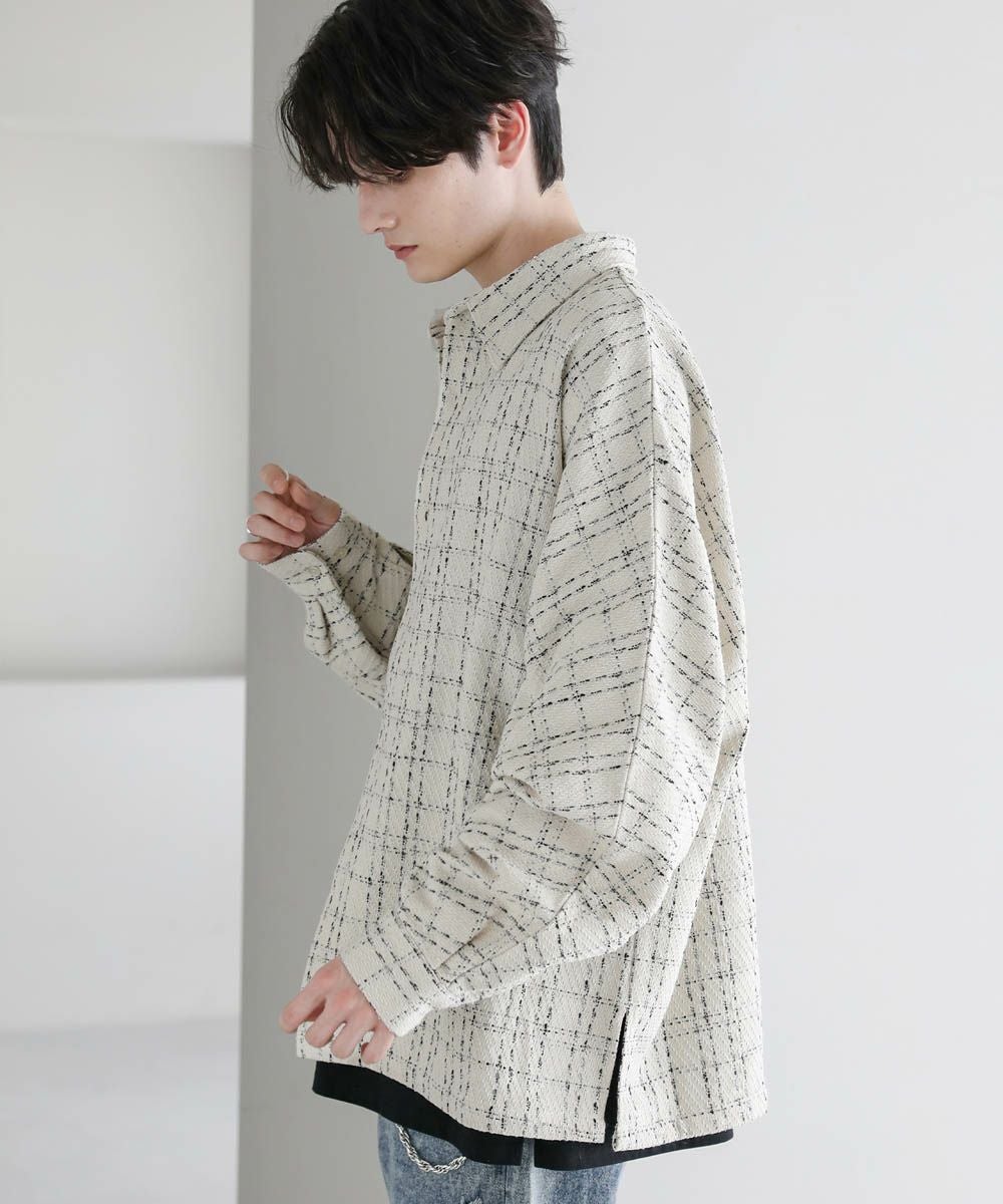 秋冬らしい季節感を演出するツイード生地のドルマンシャツ。ビッグシルエットとドルマンスリーブ、サイドスリットが抜け感のある着こなしを作ります。やや厚みのある生地感で、季節の変わり目のライトアウターとしても活躍。糸が織り込まれた生地表面の立体感がアクセントとなり、1枚で着こなしが決まるアイテムです。