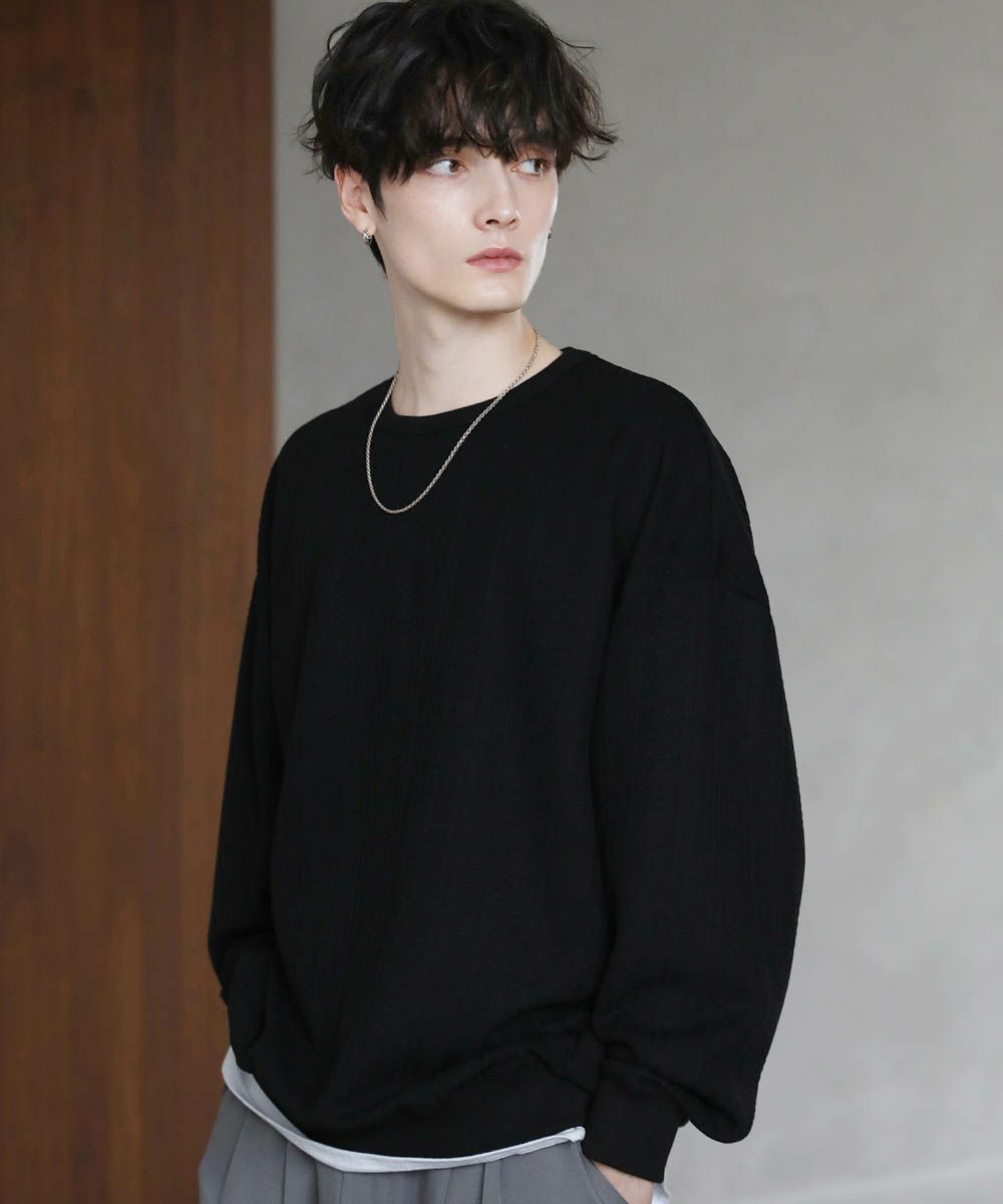 シンプルながらも表面に凹凸のあるデザインが特徴的なカットソーが登場。高級感のあるジャガード生地とキラキラ光るラメをちりばめたトレンド感ある生地の2パターンご用意。ゆとりのあるシルエットとにドルマンスリーブ仕様で、ストレスフリーな着心地です。首元はシンプルなクルーネックタイプでお手持ちのアクセサリーと合わせやすいデザイン。定番のブラックとアイボリー、クリーンな色合いのチャコール、柔らかな雰囲気のブラウンにくわえ、ラメを施したブラック系の5色展開です。1枚で着映える今期のおすすめアイテムです。