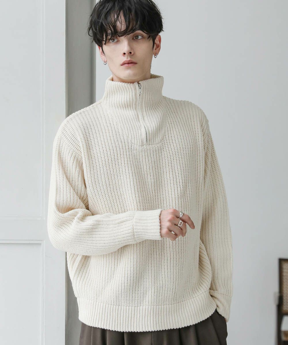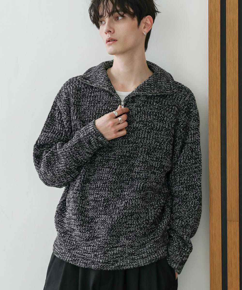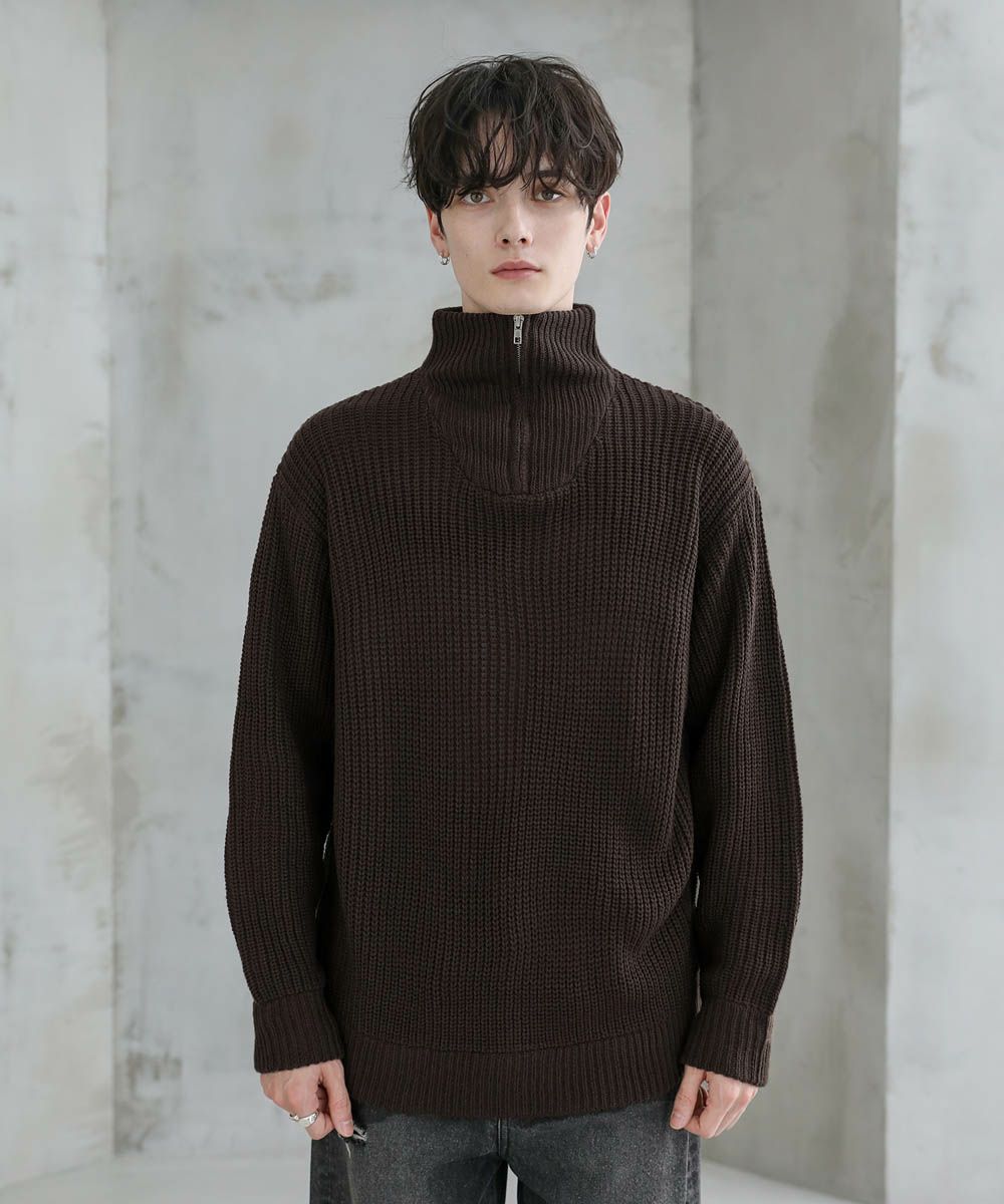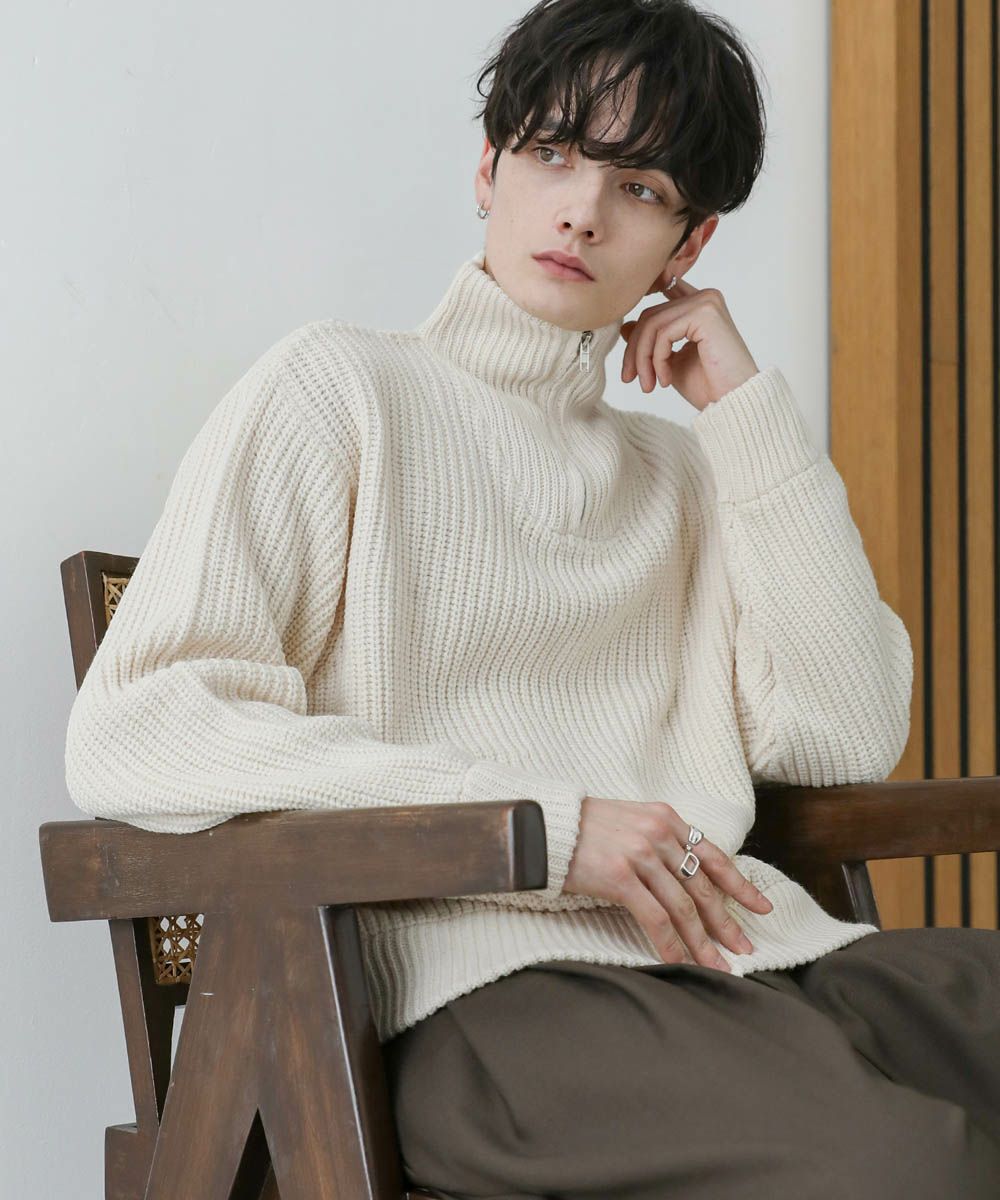 立体感のある生地が魅力の畦編みで仕上げたハーフジップニット。緩さがありつつも、大きすぎないビッグシルエットで抜け感のあるサイジング。ゆったりとした絶妙なルーズさで、取り入れるだけでトレンド感のあるコーデが完成します。ジップを開けてインナーを覗かせたり、またジップを閉めてスタンドネックとしても着こなせ、スタイイングの幅が広がる1着。秋口から春先にかけて着まわしの効くおすすめのニットです。