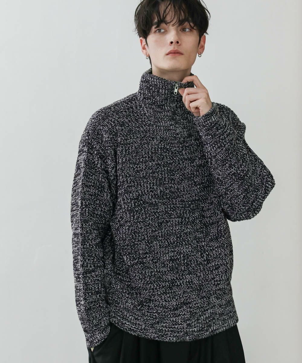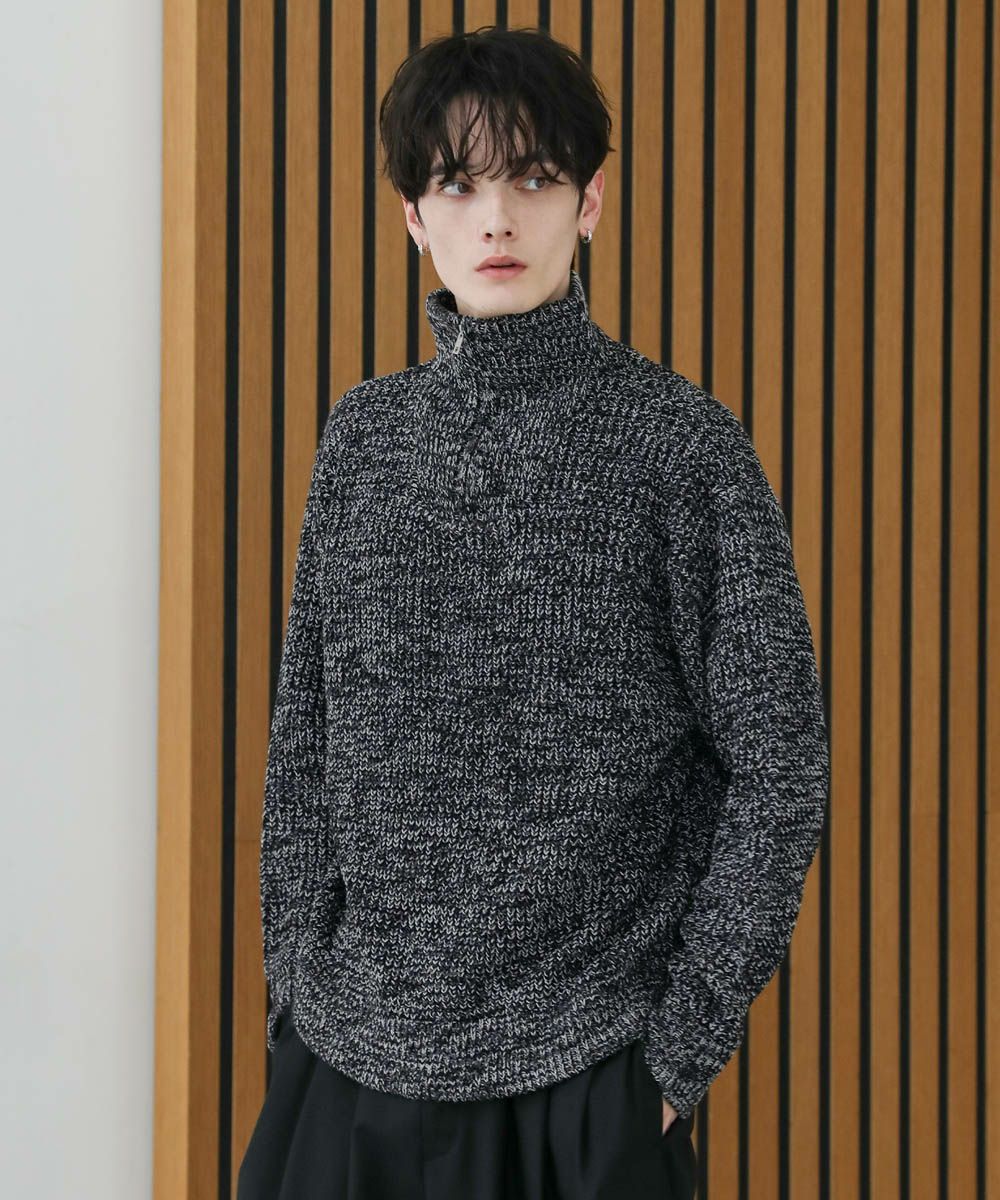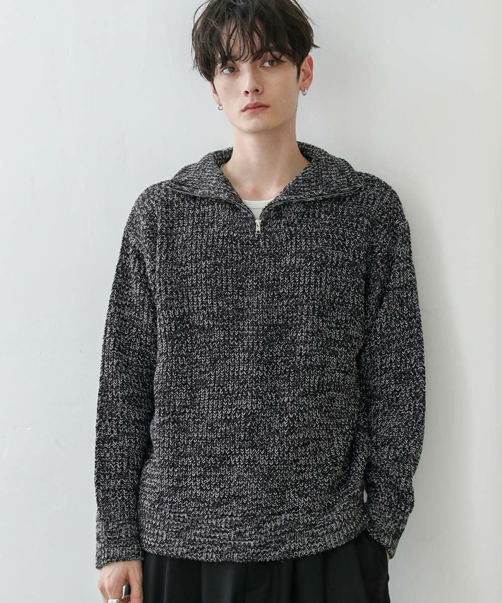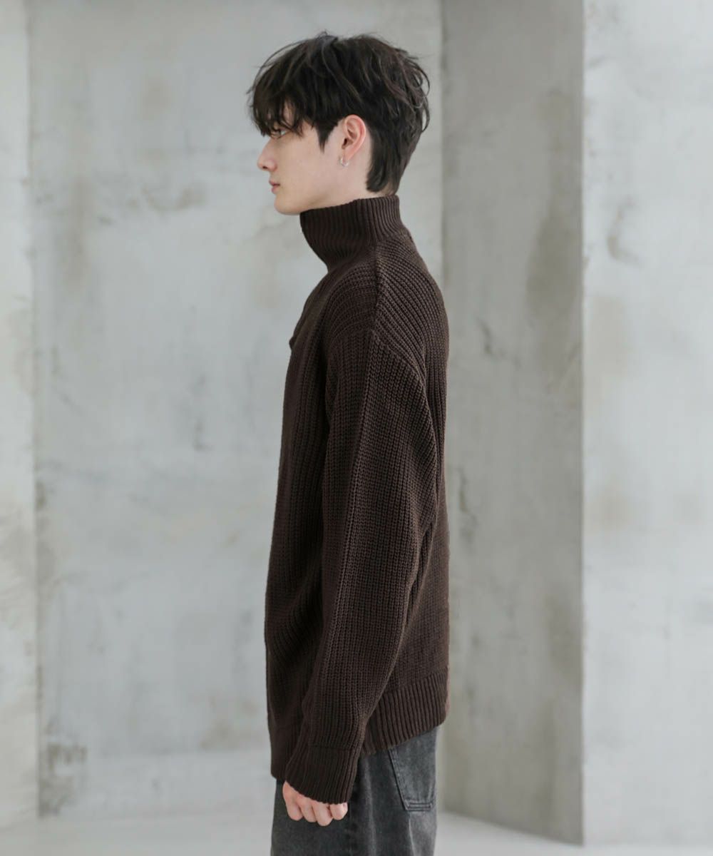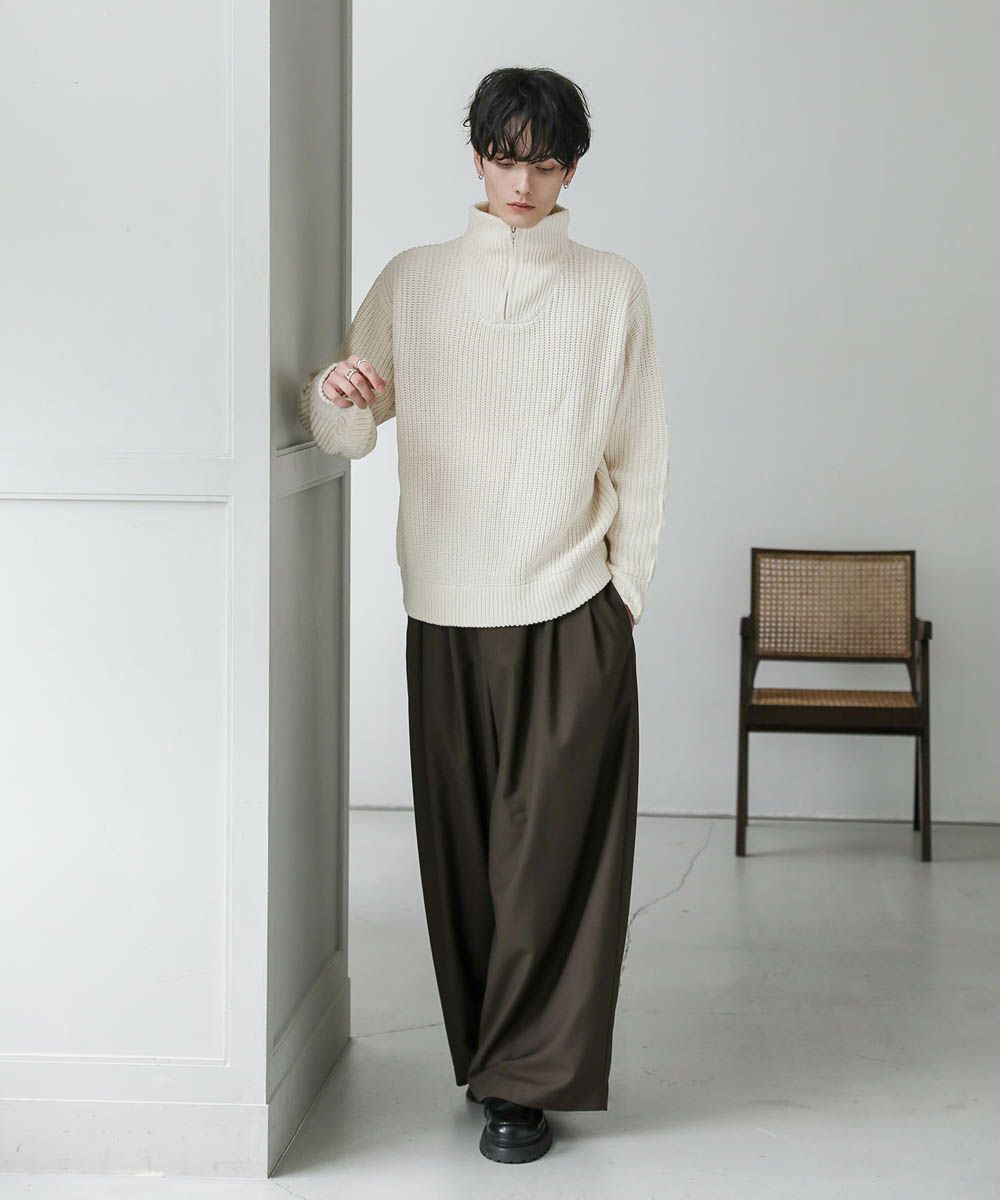 立体感のある生地が魅力の畦編みで仕上げたハーフジップニット。緩さがありつつも、大きすぎないビッグシルエットで抜け感のあるサイジング。ゆったりとした絶妙なルーズさで、取り入れるだけでトレンド感のあるコーデが完成します。ジップを開けてインナーを覗かせたり、またジップを閉めてスタンドネックとしても着こなせ、スタイイングの幅が広がる1着。秋口から春先にかけて着まわしの効くおすすめのニットです。