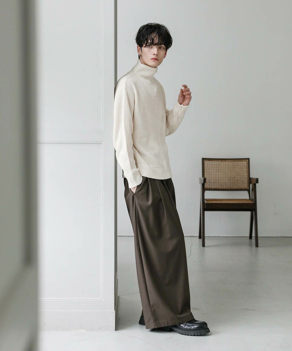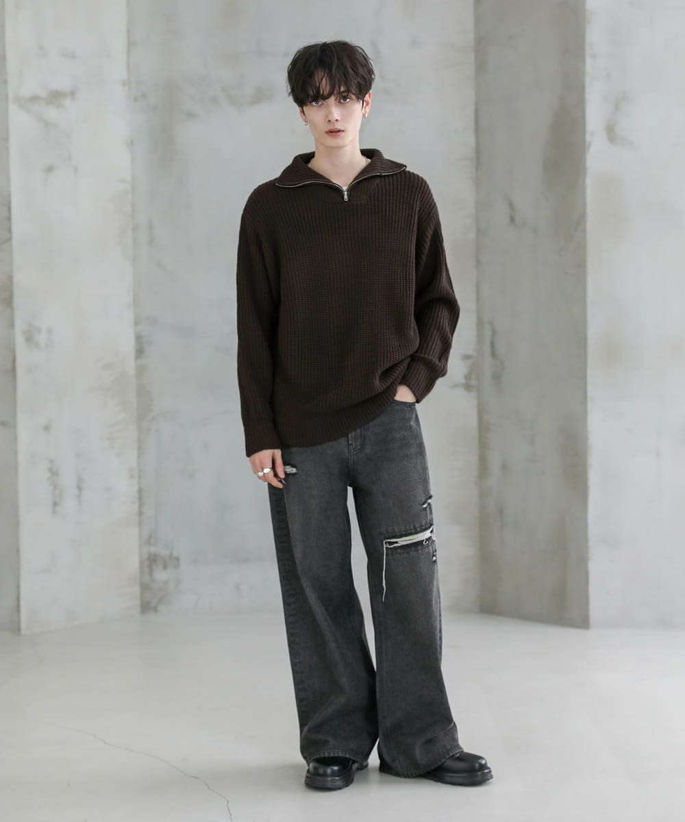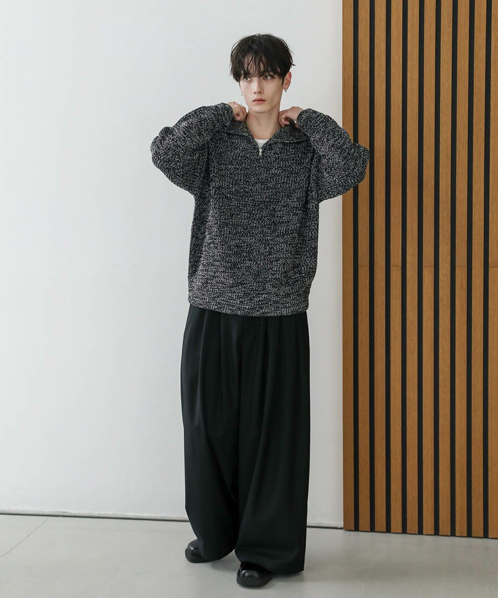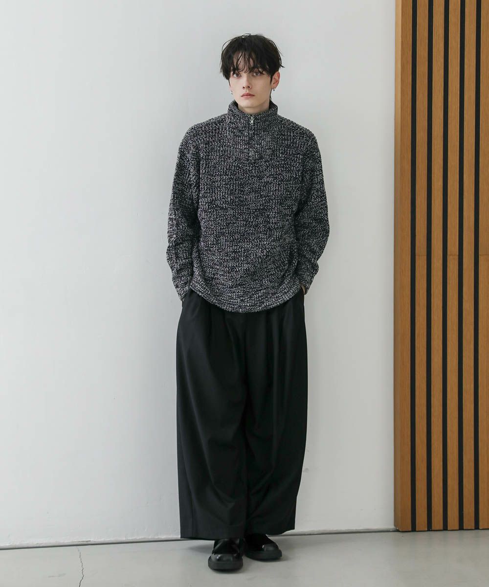 立体感のある生地が魅力の畦編みで仕上げたハーフジップニット。緩さがありつつも、大きすぎないビッグシルエットで抜け感のあるサイジング。ゆったりとした絶妙なルーズさで、取り入れるだけでトレンド感のあるコーデが完成します。ジップを開けてインナーを覗かせたり、またジップを閉めてスタンドネックとしても着こなせ、スタイイングの幅が広がる1着。秋口から春先にかけて着まわしの効くおすすめのニットです。