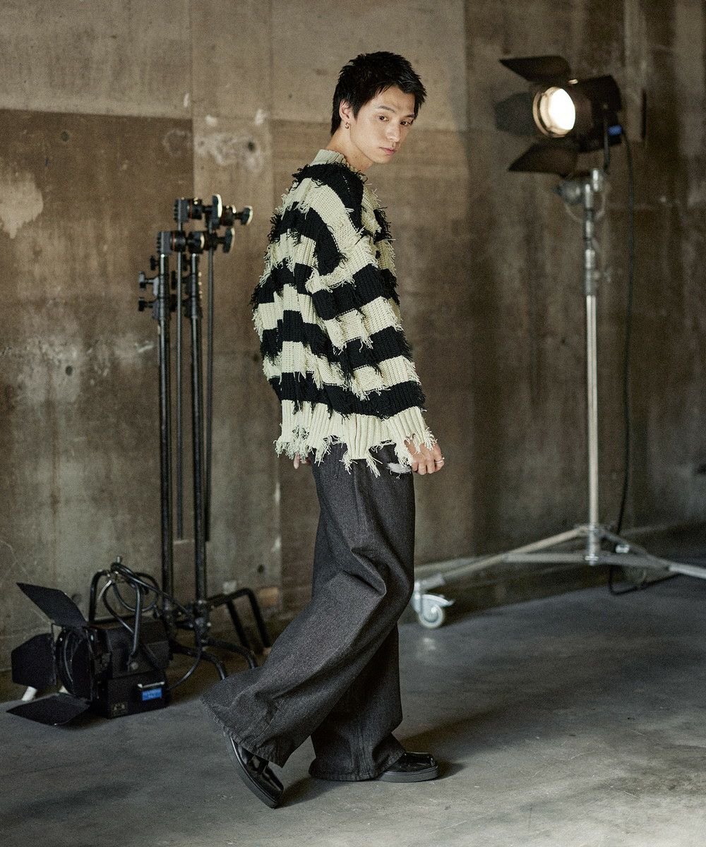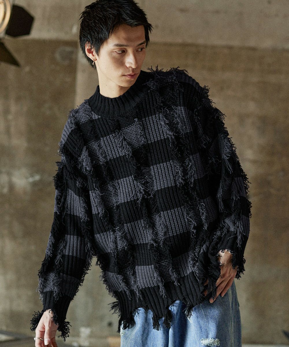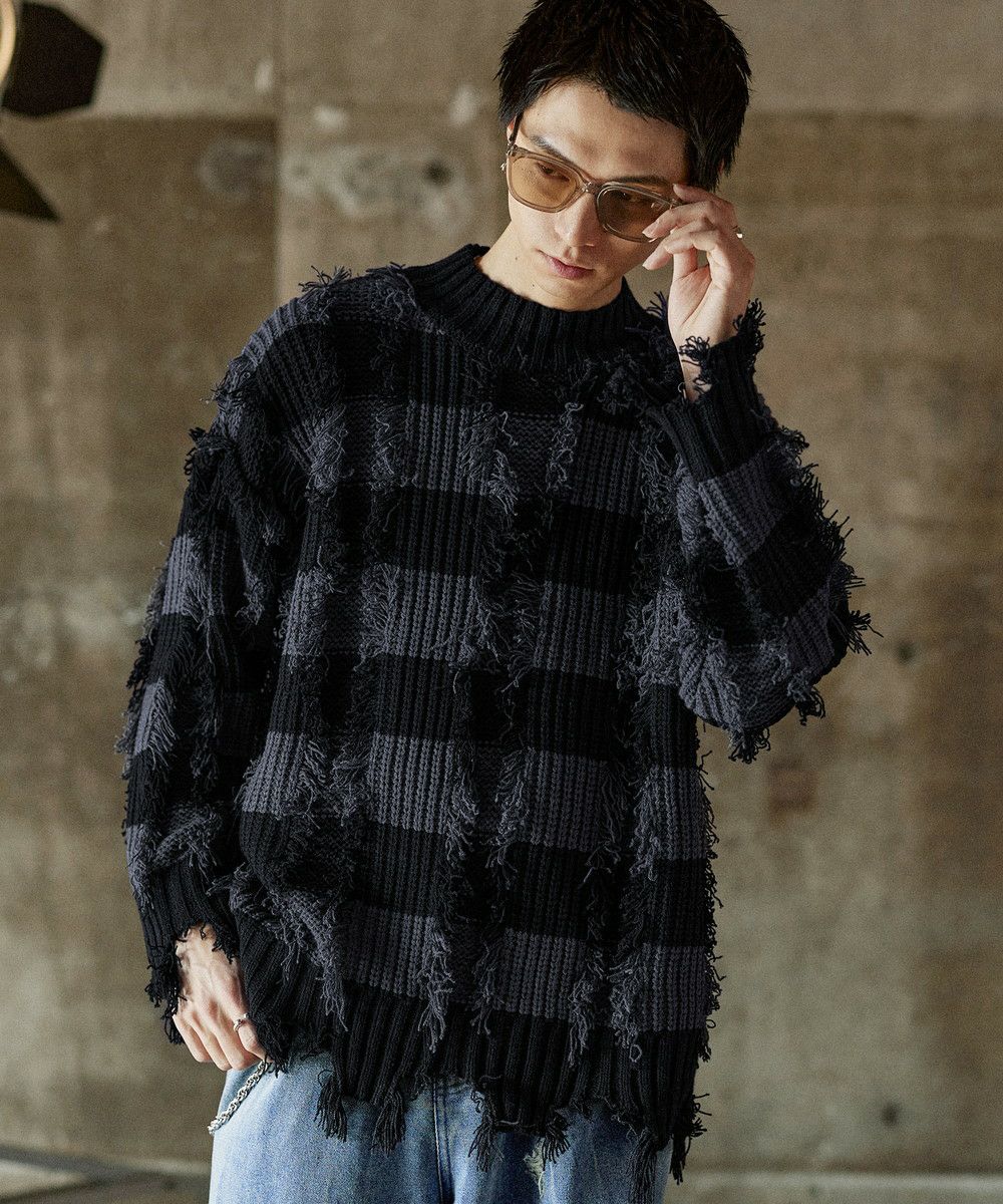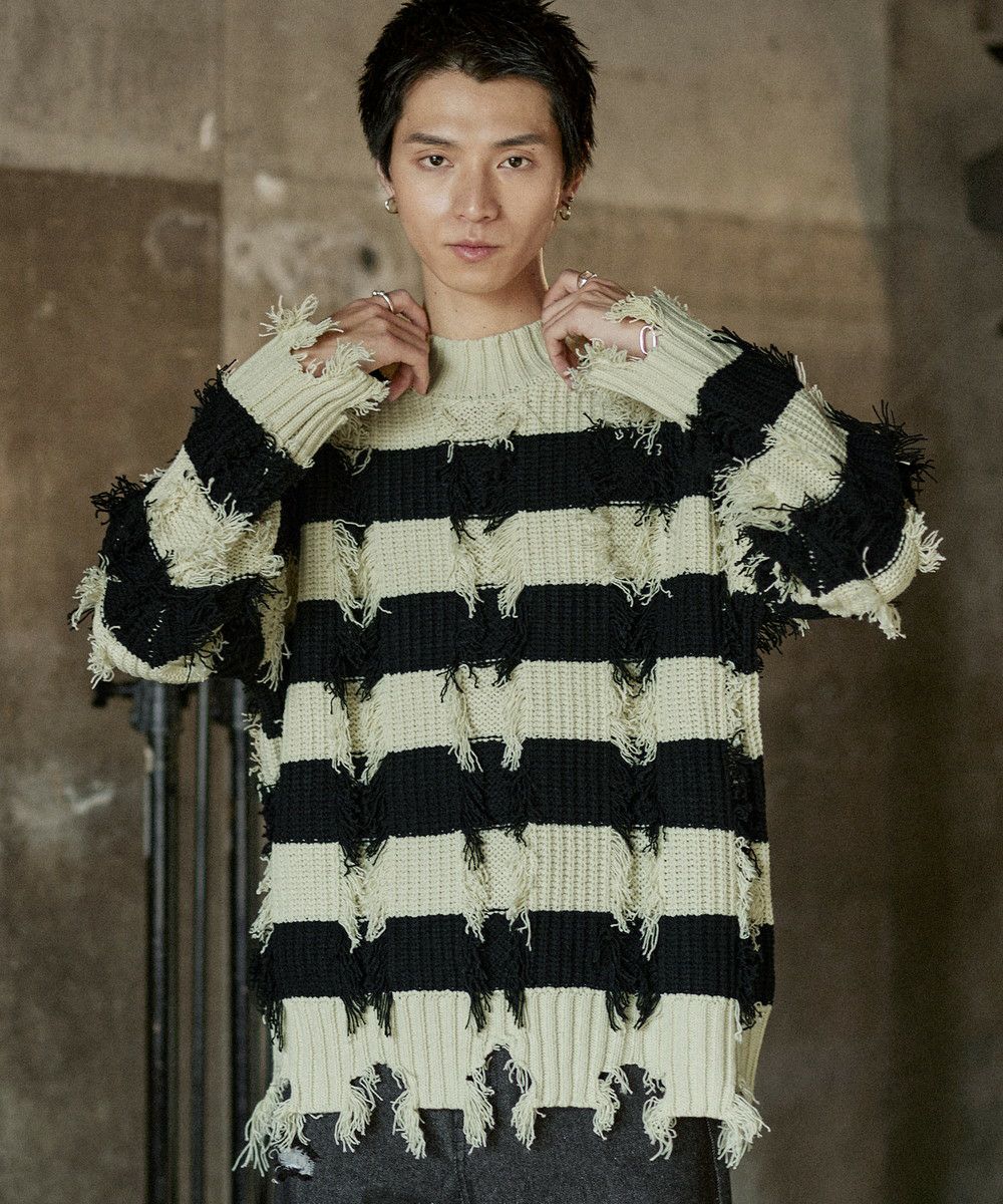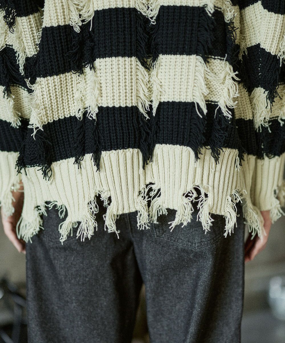 ダメージ加工と随所に施されたフリンジデザインが印象的なボーダーニット。裾や袖口のダメージ加工とインパクトのある太めのボーダーが存在感を発揮してくれる1着です。ざっくりとした編み地に加え、ゆとりのあるオーバーサイズシルエットとドロップショルダーが抜け感をプラス。デザイン性が高く主役感のあるボーダーニットは、1枚で着こなしの幅を広げてくれるアイテムです。