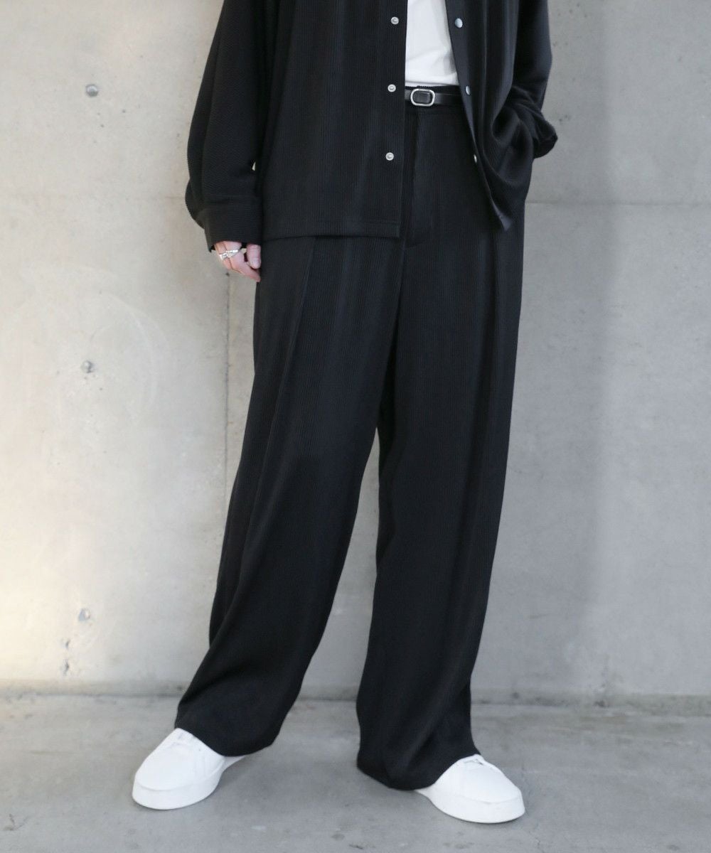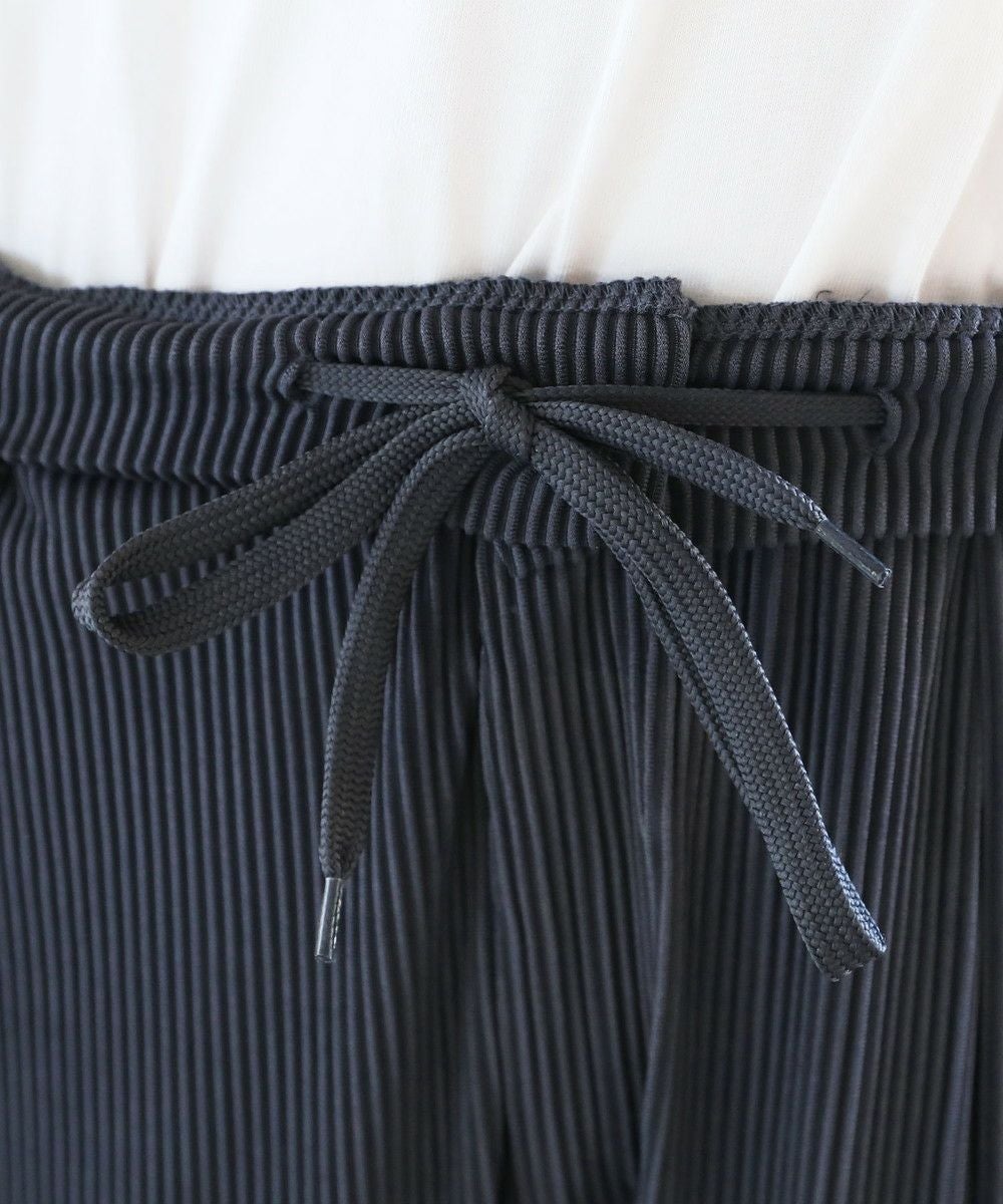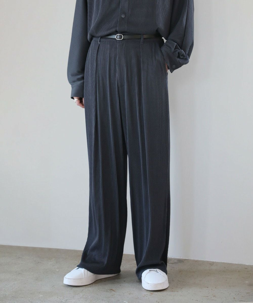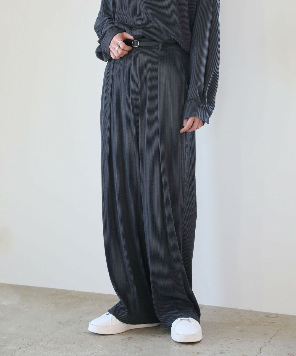 繊細なプリーツ生地が表情豊かなワイドストレートパンツ。ゆったりとしたワイドシルエットと落ち感のある素材がリラックス感を醸す一着です。フロントにはタックを施し立体的な印象をプラス。ベルトループ付きなのでタックインスタイルもサマになります。もちろんベルトレスでも着用できるように、ウエスト内側には調整可能な紐を配しました。脚のラインを拾いにくいワイドストレートシルエットで、どなたでも簡単にキレイめコーデが取り入れられる一本となっています。