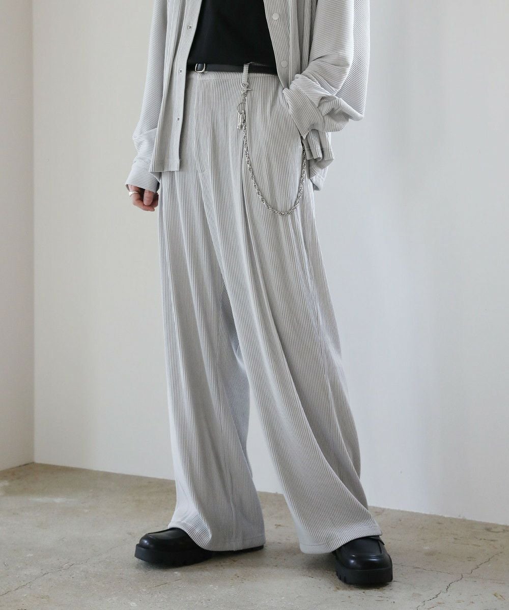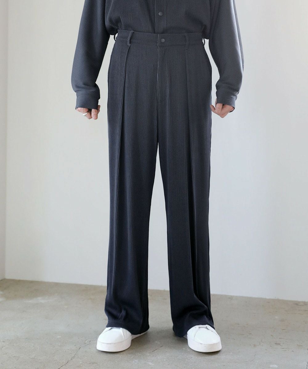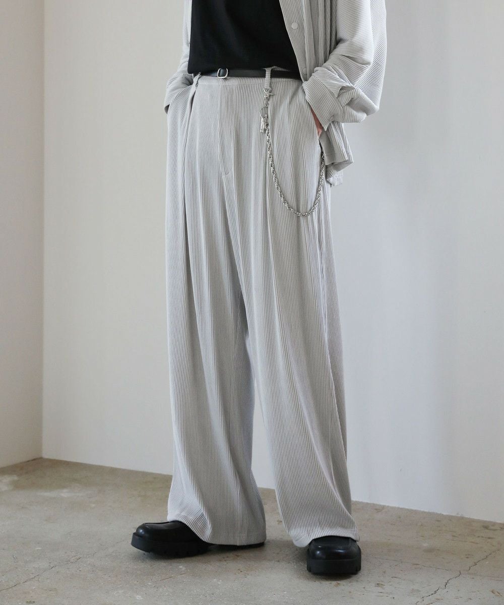 繊細なプリーツ生地が表情豊かなワイドストレートパンツ。ゆったりとしたワイドシルエットと落ち感のある素材がリラックス感を醸す一着です。フロントにはタックを施し立体的な印象をプラス。ベルトループ付きなのでタックインスタイルもサマになります。もちろんベルトレスでも着用できるように、ウエスト内側には調整可能な紐を配しました。脚のラインを拾いにくいワイドストレートシルエットで、どなたでも簡単にキレイめコーデが取り入れられる一本となっています。