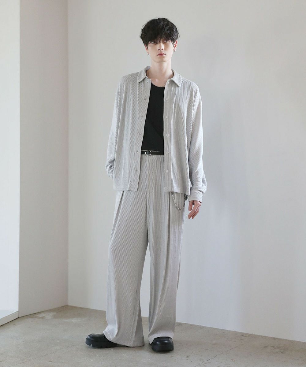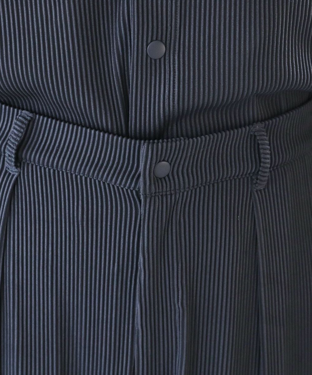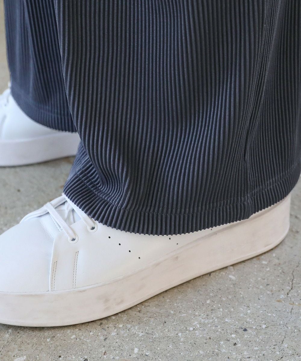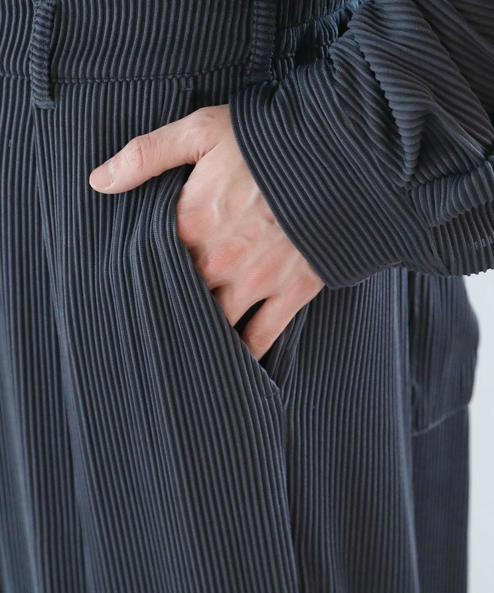 繊細なプリーツ生地が表情豊かなワイドストレートパンツ。ゆったりとしたワイドシルエットと落ち感のある素材がリラックス感を醸す一着です。フロントにはタックを施し立体的な印象をプラス。ベルトループ付きなのでタックインスタイルもサマになります。もちろんベルトレスでも着用できるように、ウエスト内側には調整可能な紐を配しました。脚のラインを拾いにくいワイドストレートシルエットで、どなたでも簡単にキレイめコーデが取り入れられる一本となっています。