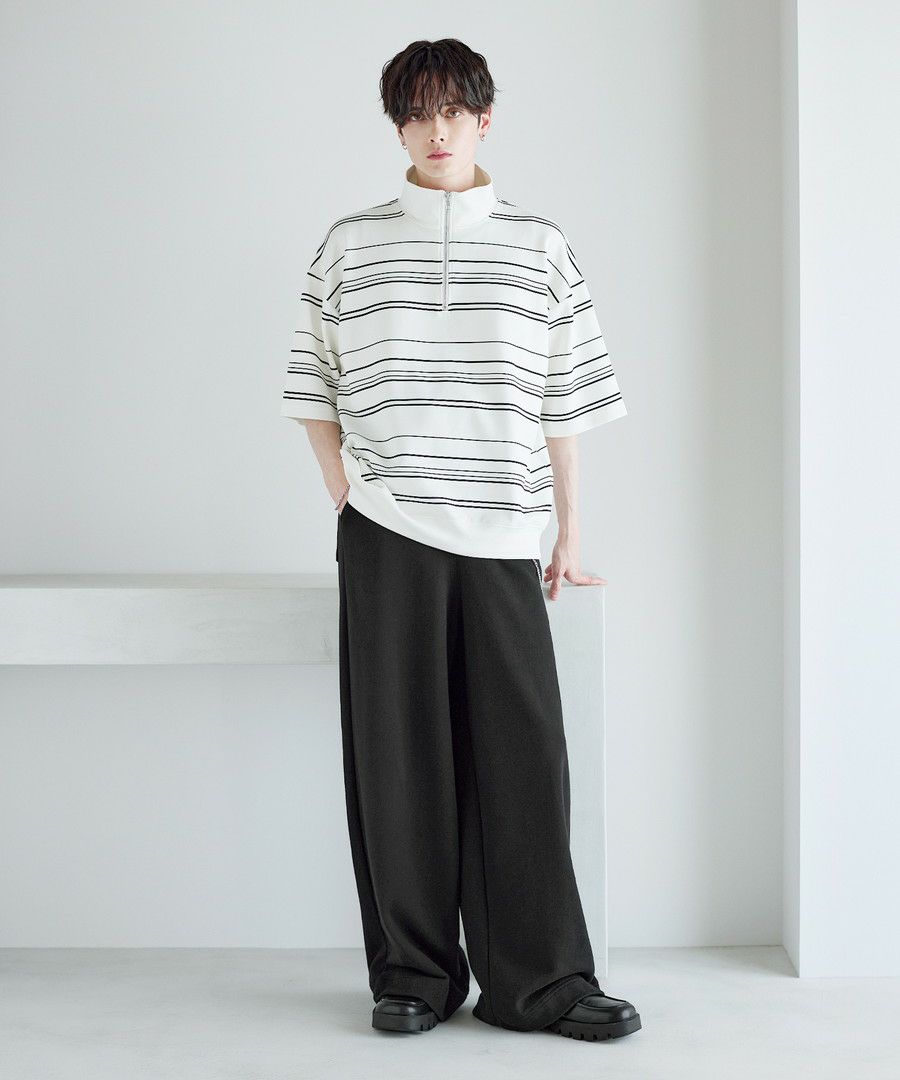 接触冷感機能付きが嬉しいポンチハーフジッププルオーバー。ドロップショルダーやゆとりのある身幅、肘にかかる長めの袖丈など、こなれ感たっぷりに仕上げました。生地表面にほんのりと光沢感があり、シンプルなアイテムながら1枚で上品な印象を与えてくれます。カラーはシンプルなホワイト、ブラック、ブルーグレー、ワインに、ランダムなボーダーがおしゃれな印象のホワイト系、ブラック系の6色展開。暑い時期にぴったりな涼しく快適な着心地で、夏に1枚は欲しいおすすめのアイテムです。