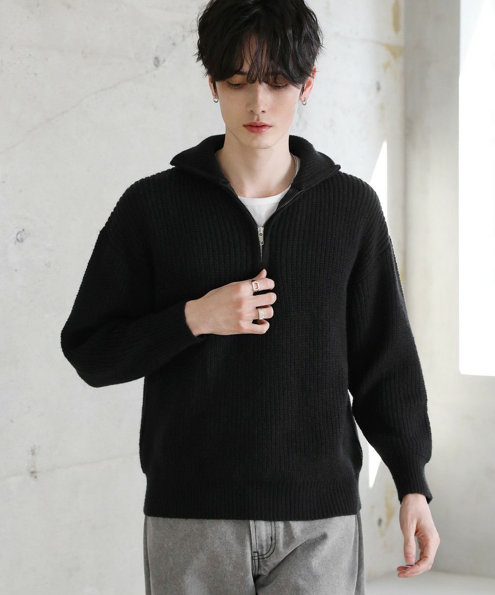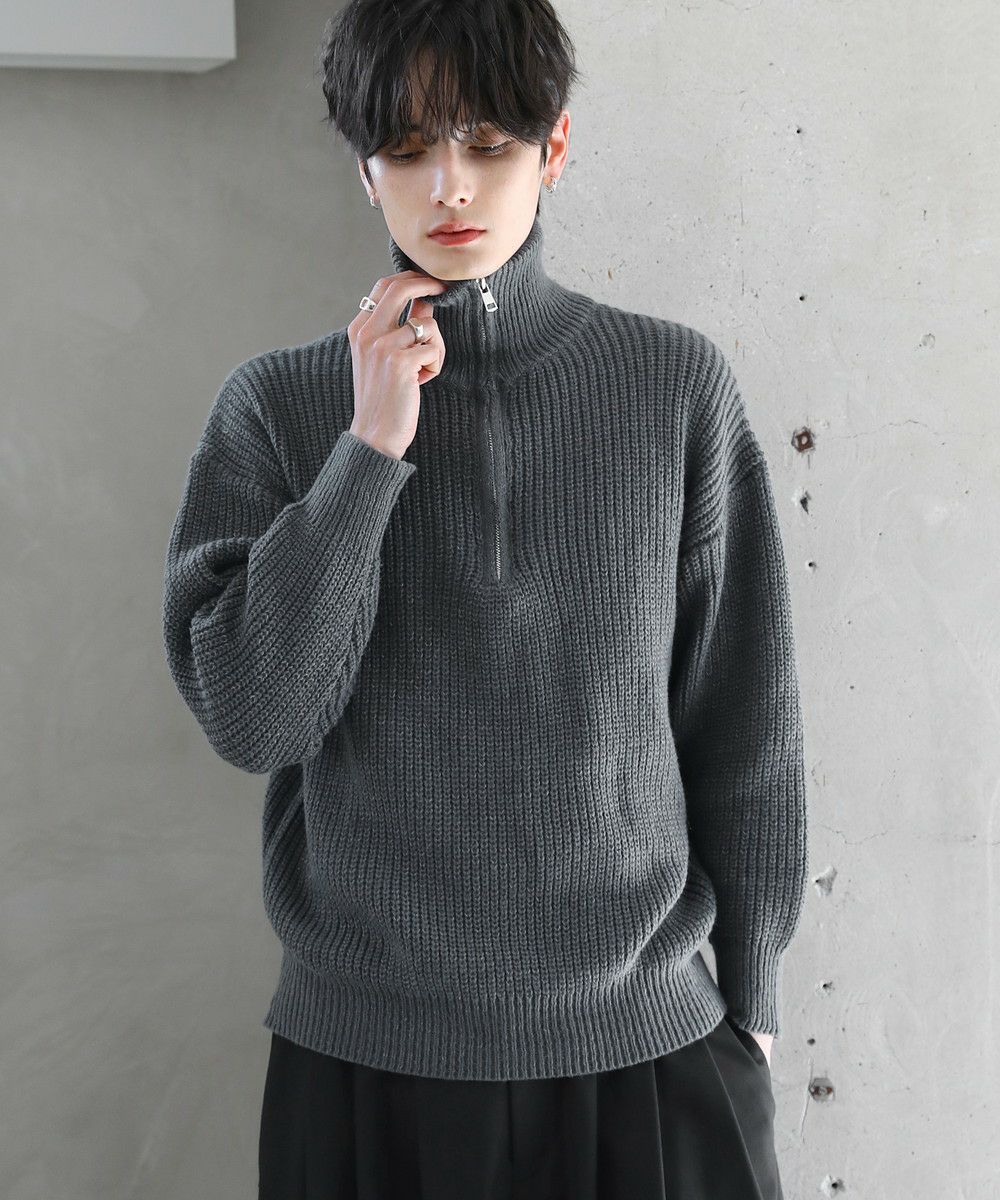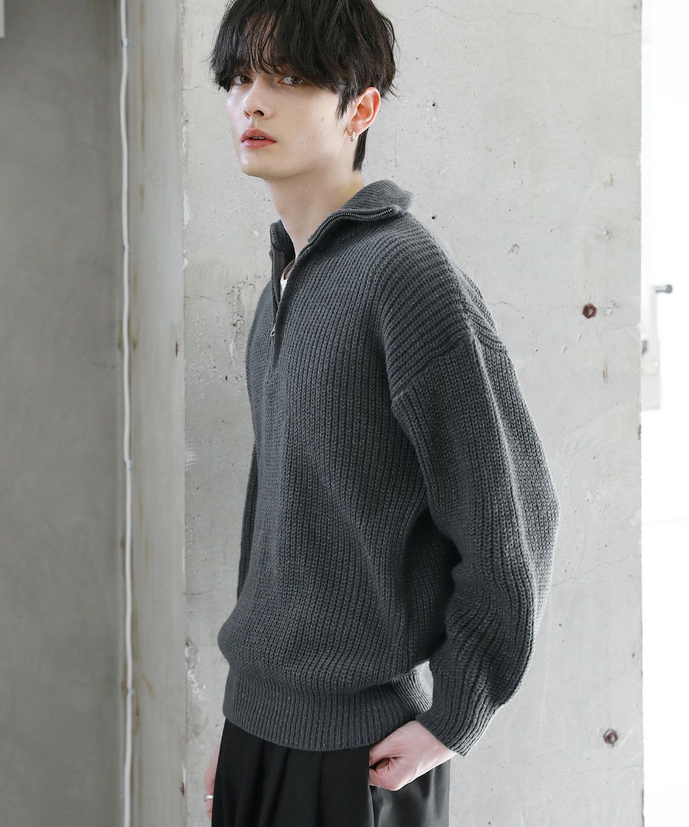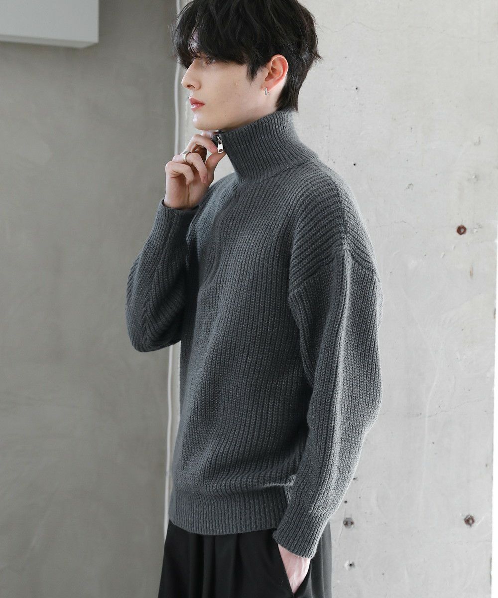今っぽいリラックス感とトレンド感を備えたハーフジップニット。ふっくらとしたボリュームのあるニットで、秋から春先まで活躍します。レイヤードコーデにも活躍するハーフジップデザインは、合わせるだけでトレンドを押さえた着こなしに。ジップを上げてハイネックのように着こなすと、首元がすっきりと見えてスタイリッシュな雰囲気を醸します。程よいサイズ感でシンプルなコーディネートでもバランス良くまとまる頼れる1着です。