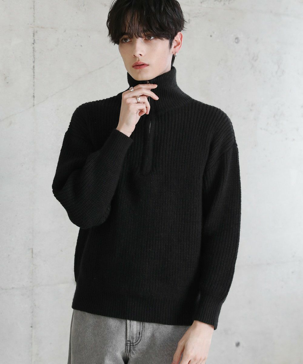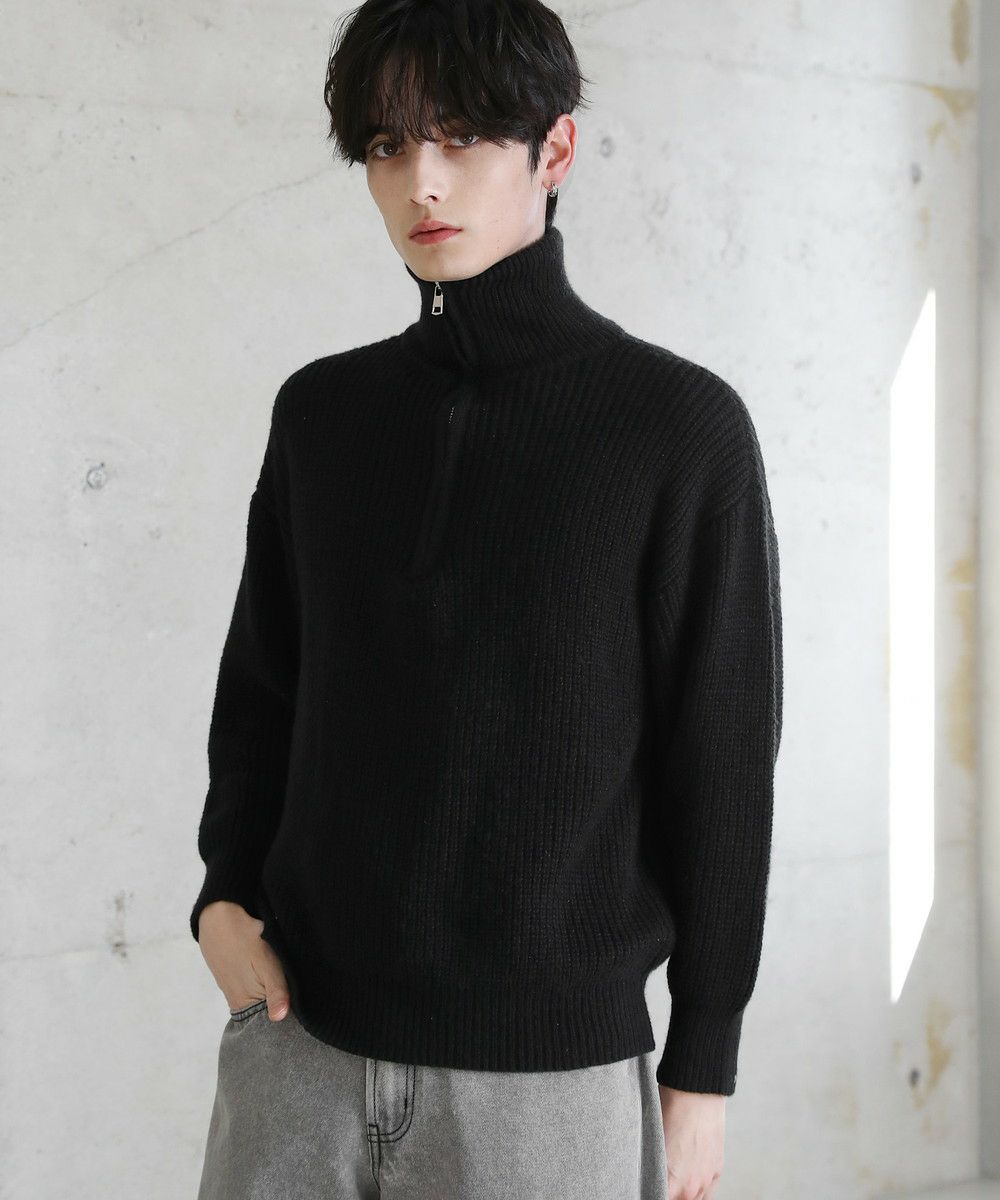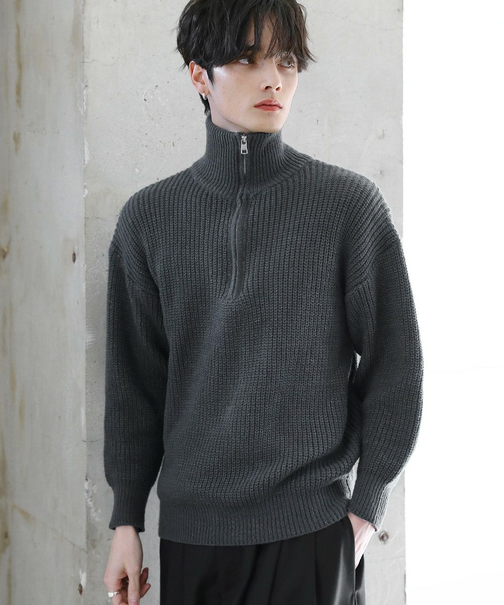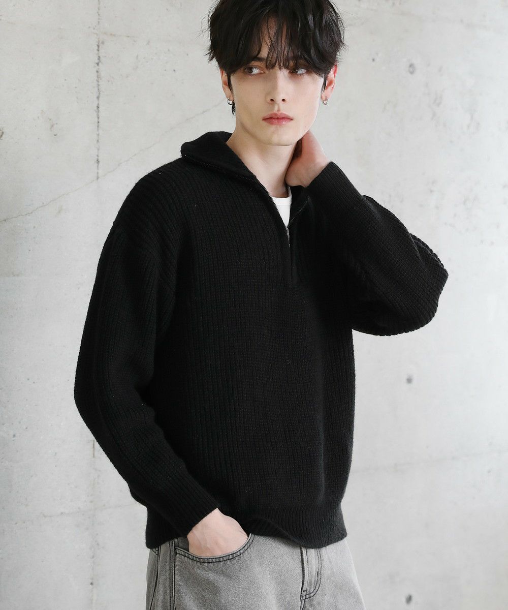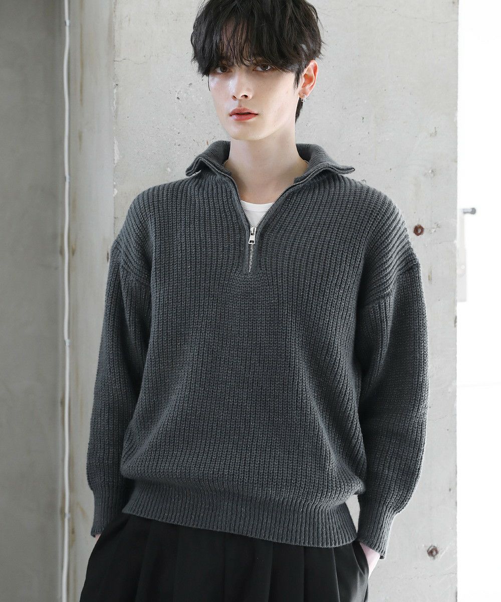 今っぽいリラックス感とトレンド感を備えたハーフジップニット。ふっくらとしたボリュームのあるニットで、秋から春先まで活躍します。レイヤードコーデにも活躍するハーフジップデザインは、合わせるだけでトレンドを押さえた着こなしに。ジップを上げてハイネックのように着こなすと、首元がすっきりと見えてスタイリッシュな雰囲気を醸します。程よいサイズ感でシンプルなコーディネートでもバランス良くまとまる頼れる1着です。