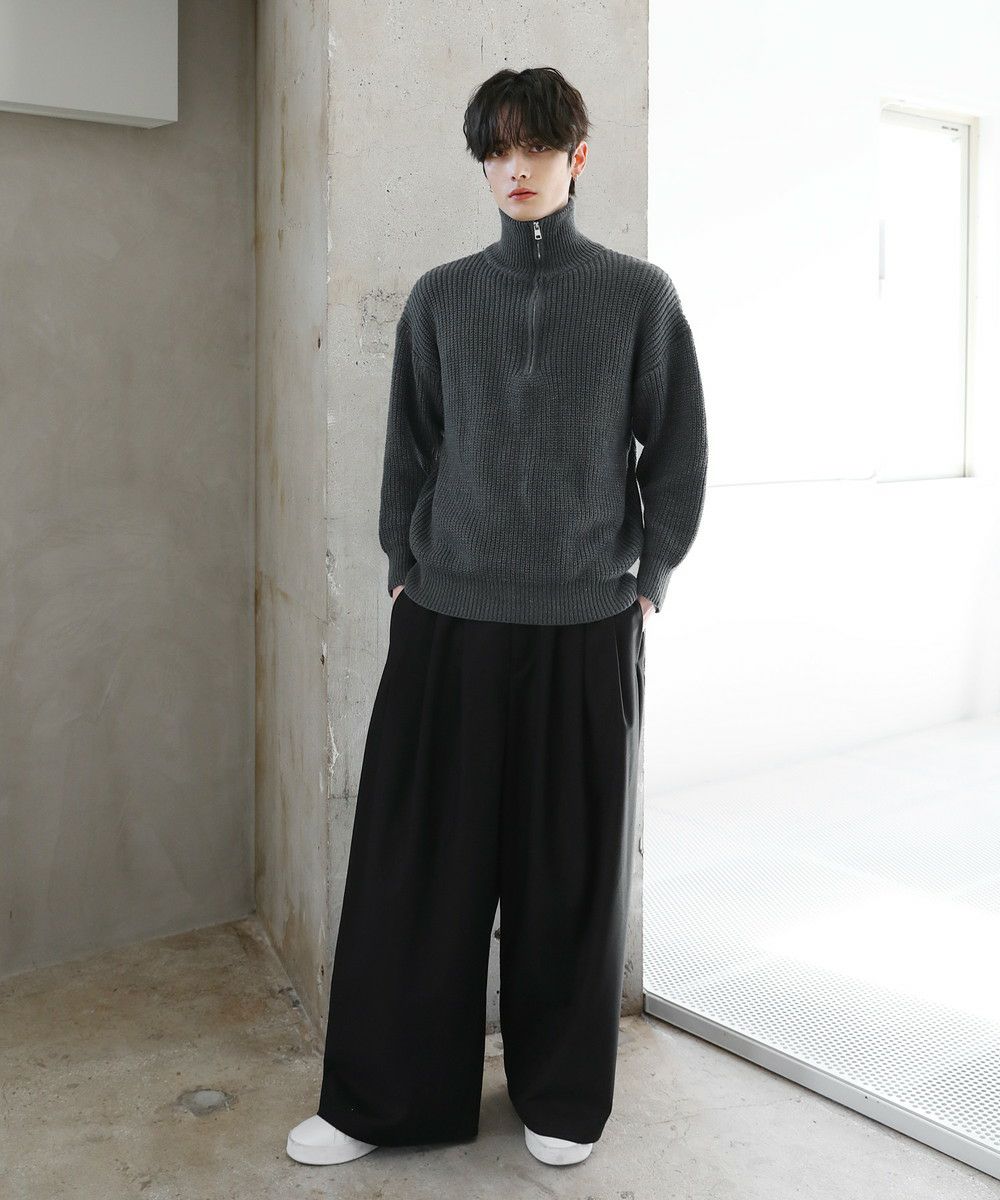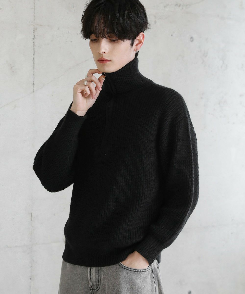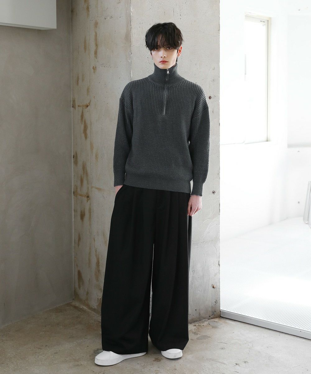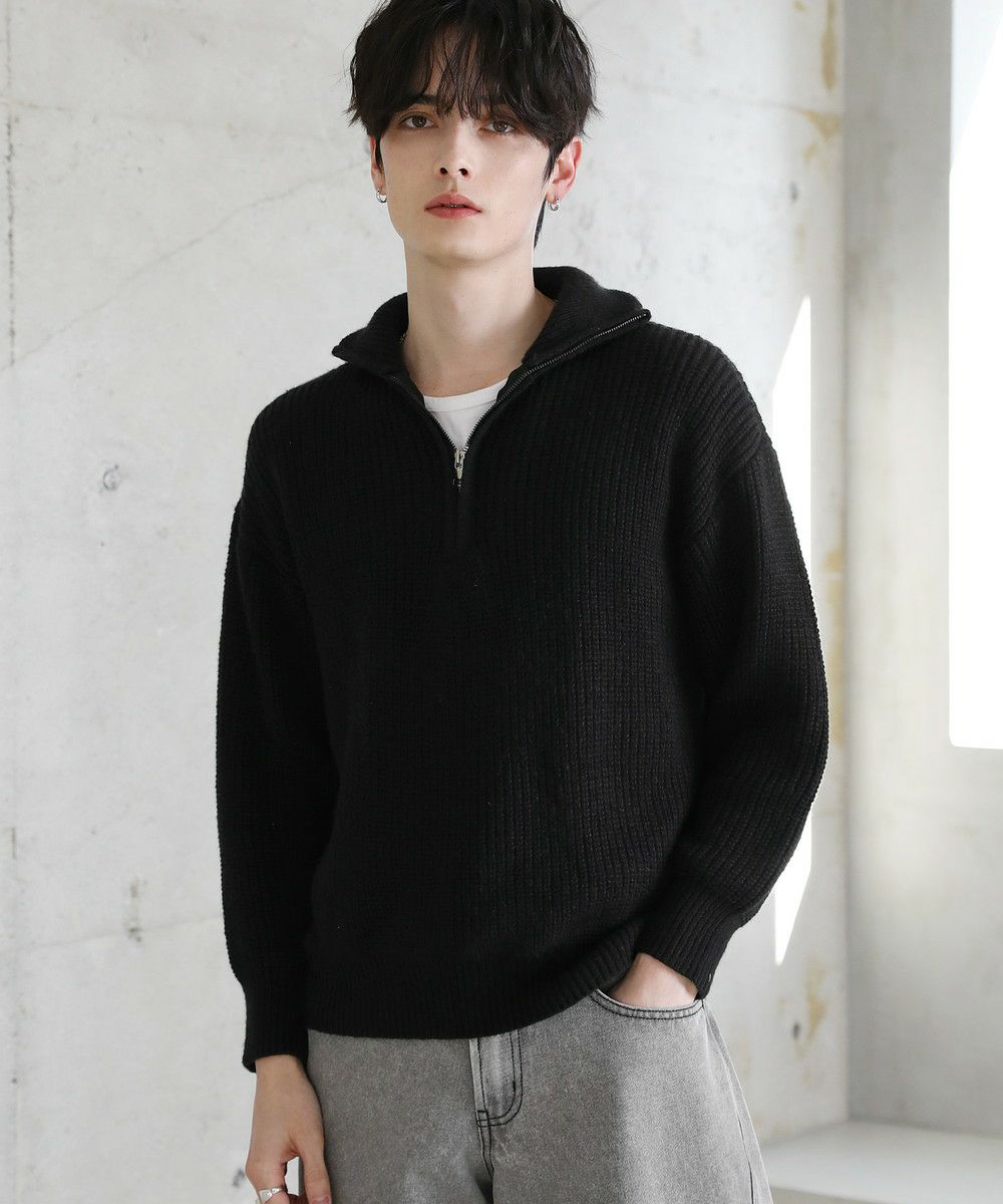 今っぽいリラックス感とトレンド感を備えたハーフジップニット。ふっくらとしたボリュームのあるニットで、秋から春先まで活躍します。レイヤードコーデにも活躍するハーフジップデザインは、合わせるだけでトレンドを押さえた着こなしに。ジップを上げてハイネックのように着こなすと、首元がすっきりと見えてスタイリッシュな雰囲気を醸します。程よいサイズ感でシンプルなコーディネートでもバランス良くまとまる頼れる1着です。