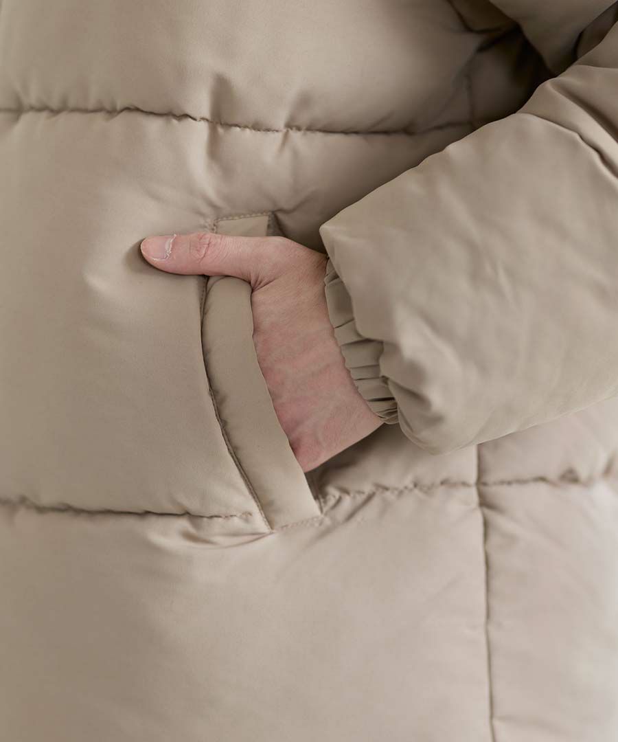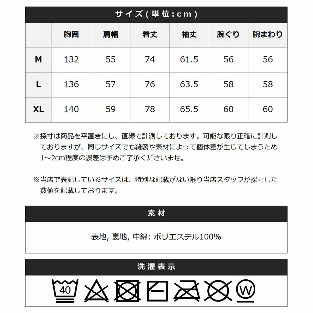 ポリエステル中綿入りで軽く暖かく、ボリューム感がありながらもストレスのない着心地です。