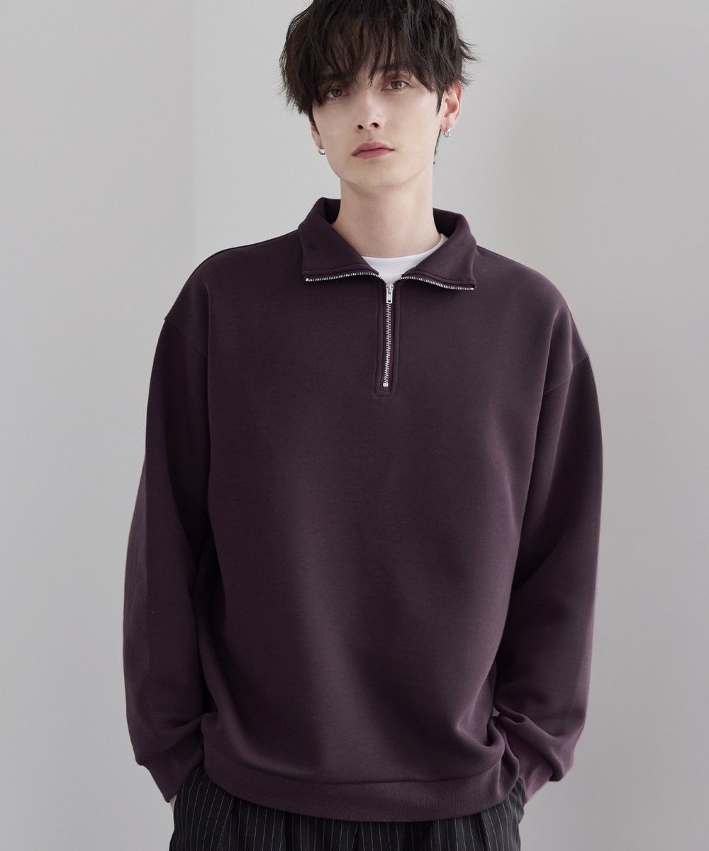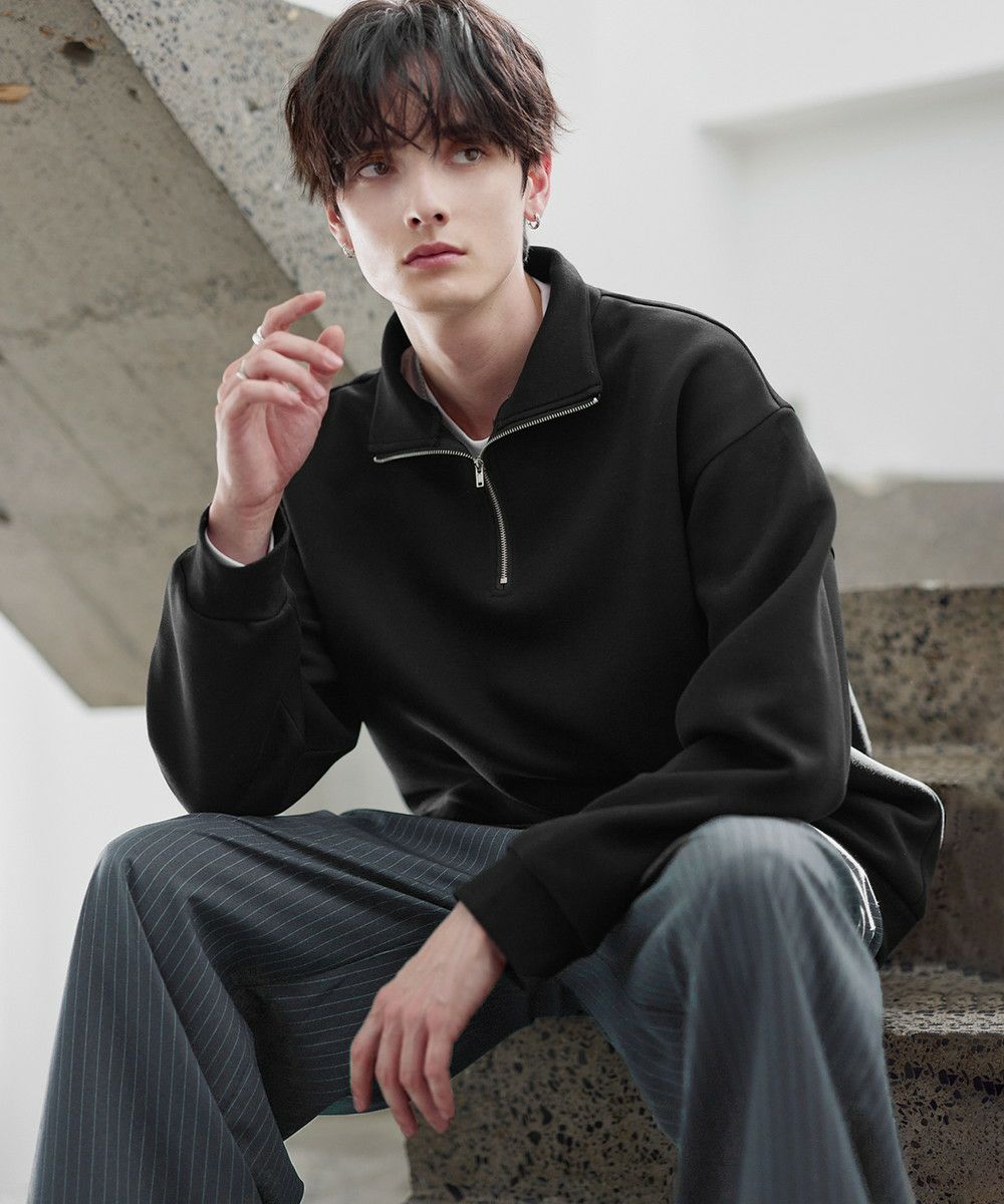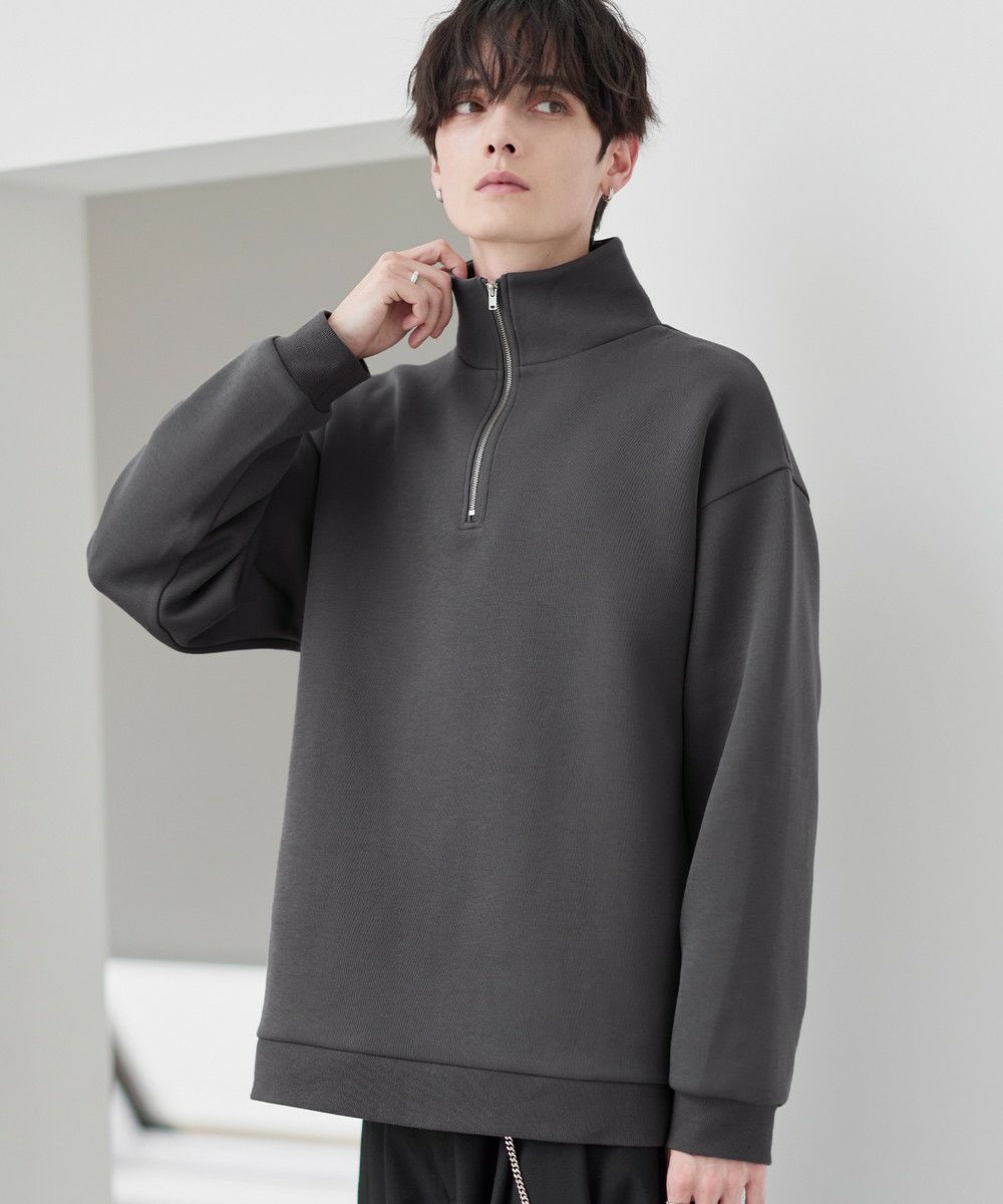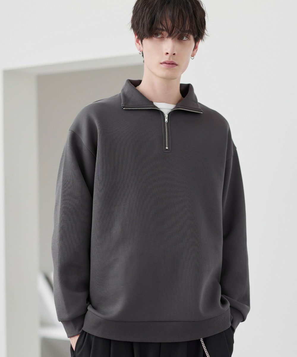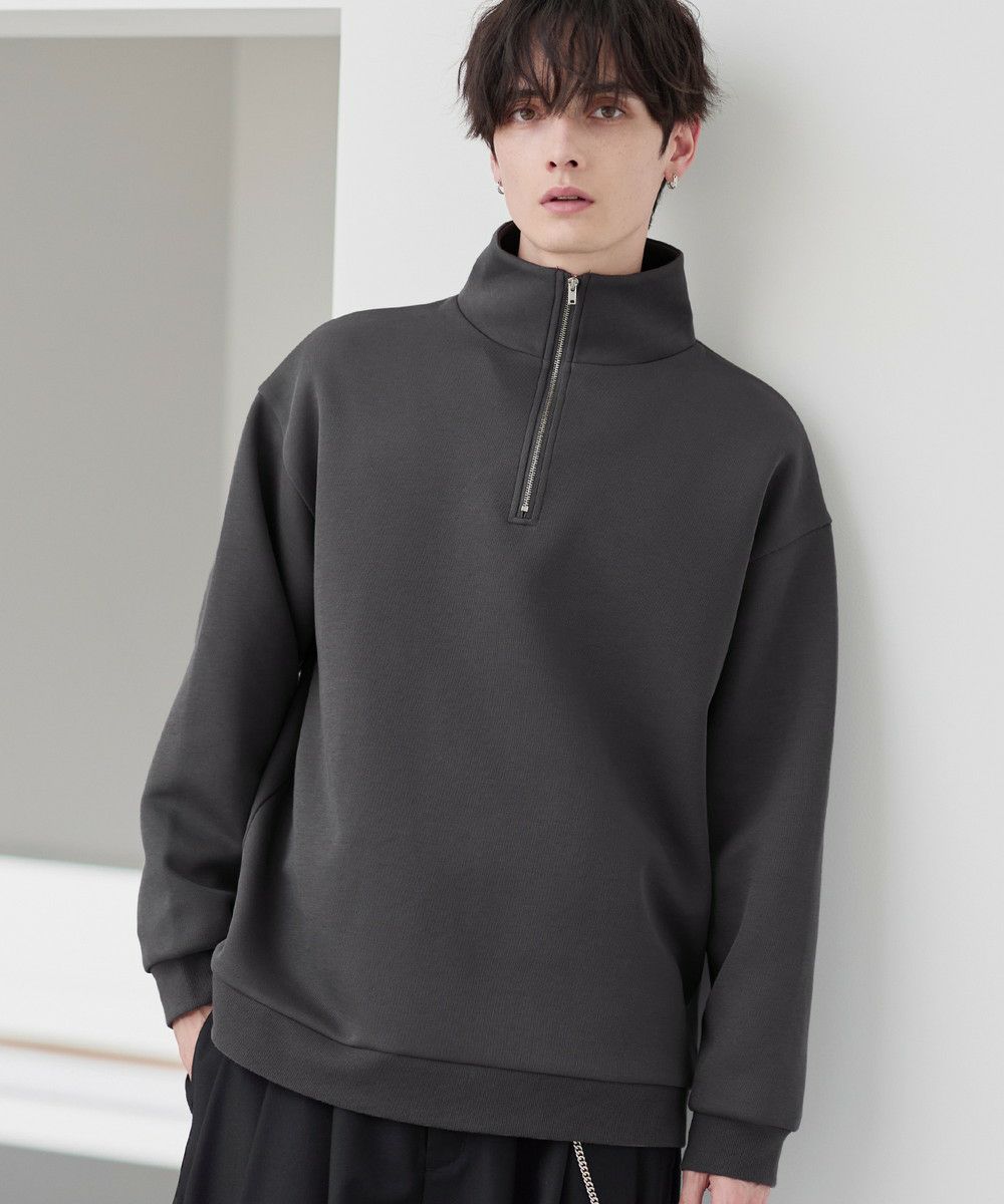 シンプルながらもトレンド感のあるデザインが魅力のハーフジッププルオーバー。ジップの開け閉めで印象の変化を楽しめるハーフジップ仕様で、アレンジが広がる一枚。ゆとりのある身幅とドロップショルダーでリラックス感のある雰囲気に仕上げました。