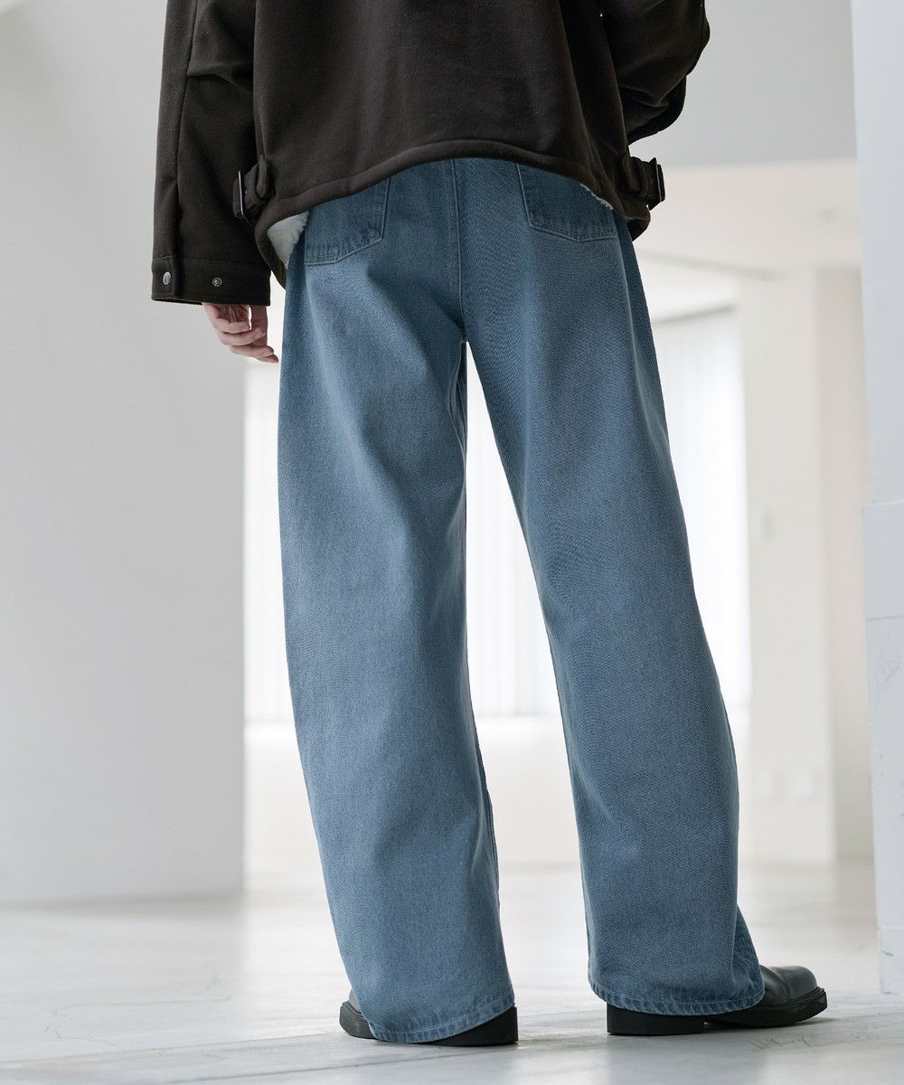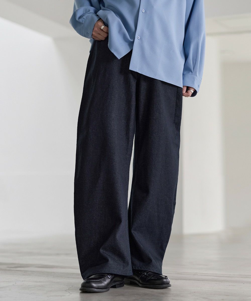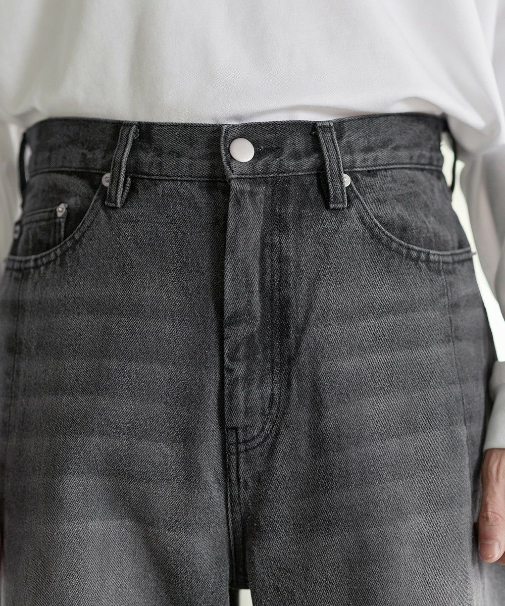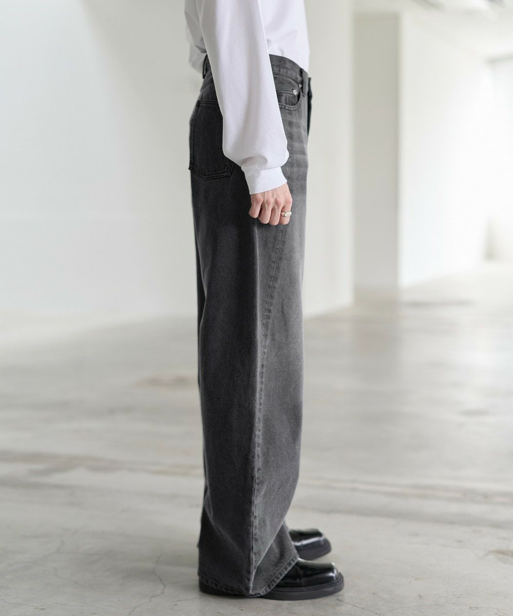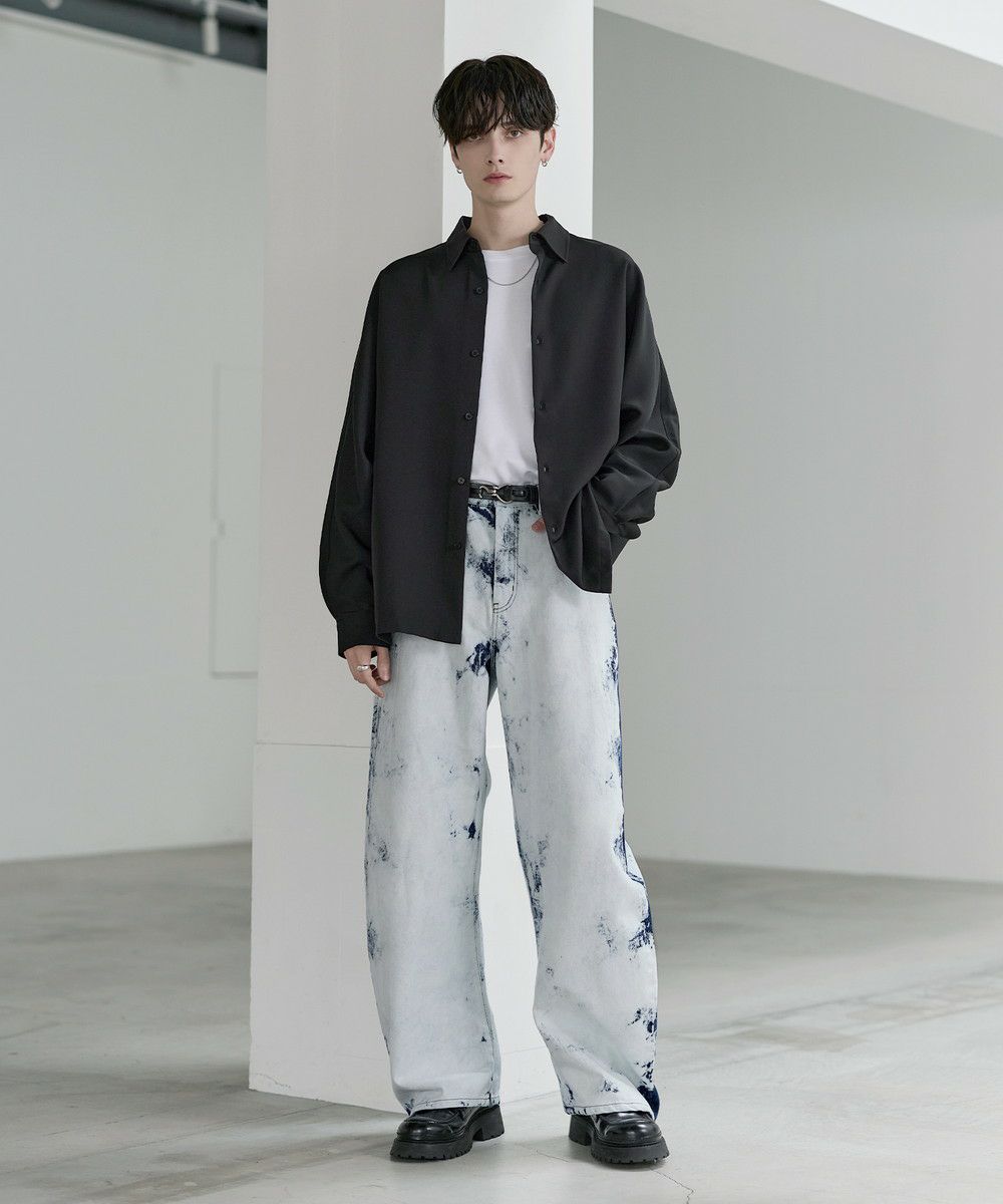 シンプルなTシャツやシャツを合わせて、デニムの存在感を際立たせたコーディネートがおすすめ。足元にはボリューム感のあるレザーシューズや厚底スニーカーを合わせることで、ワイドシルエットとのバランスがとれ、全体にまとまりのあるスタイルに仕上がります。個性的なシルエットと加工感を活かしつつ、モノトーンからカラーアイテムまで幅広いトップスと好相性の一本です。